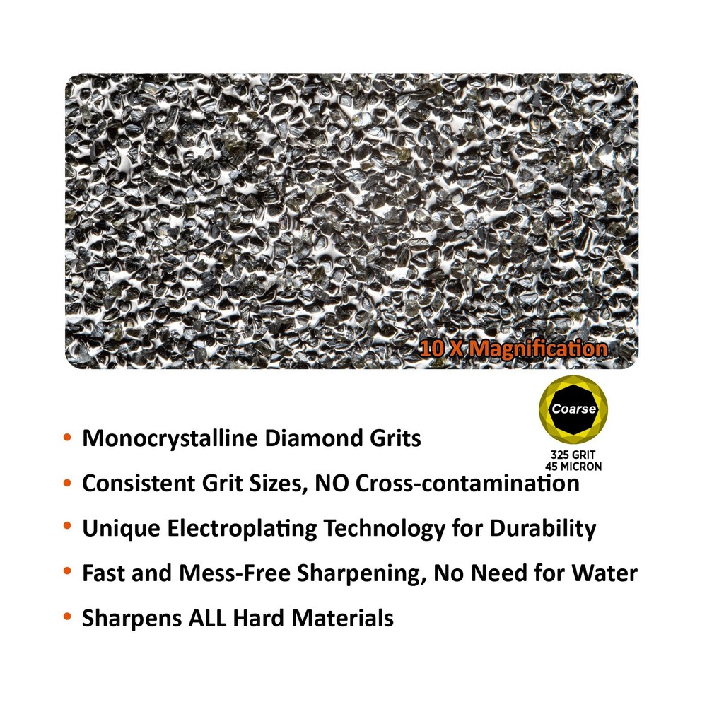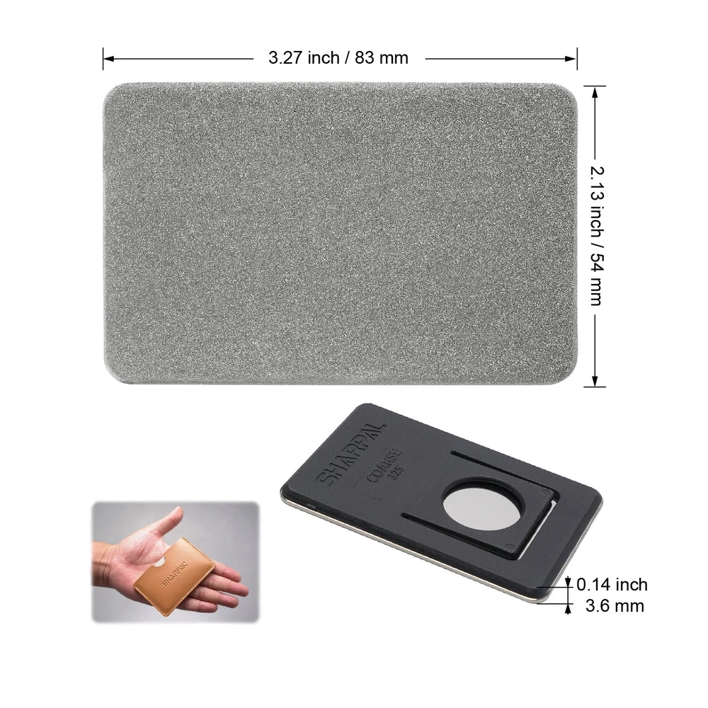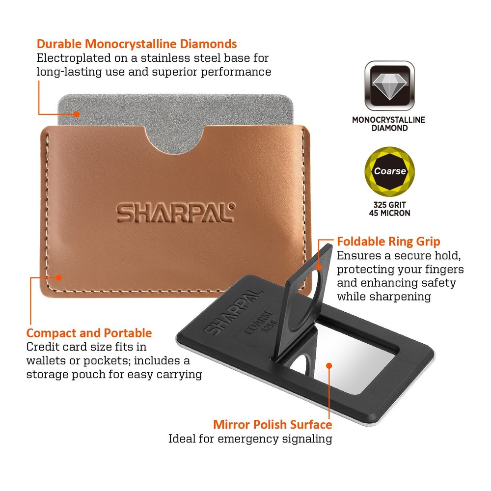 Product Description About SHARPAL Sharpal Inc. is a leading manufacturer of professional and patented multifunction knife and tool sharpeners for the outdoor and sports, garden and workshop, and culinary and kitchen industries. For more than 24 years we have been passionately researching and developing quality products, which provide consumers with an easy and cost-effective way to obtain a sharp edge. SHARPAL Diamond Sharpener-the fastest and most effective way to sharpen an edge! Use and Care There is a ‘break-in’ period for diamond sharpeners. When first use, the surface will appear to be especially rough. This roughness is due to the final manufacturing process and will be removed over time without impacting performance. As the diamond surface wears down, more and more diamond grits are exposed and the sharpener cuts faster. Sharpen dry. No messy oil needed Initial break-in Coarse 325 grit (45 micron) for quick edge setting Clean surface and wipe DRY after use Store DRY Key Features Patent Pending Ring Grip Ring grip holding to protect hands from hurting when sharpen Credit Card Size It measures L 3 1/4-inch x W 2 1/8-inch x D .14-inch. and it weighs only 2.2 ounce. Storage Pouch Each with storage pouch for easy carrying. Stainless Steel Body Durable stainless steel construction for years of dependable use. Varied Uses Straight Knife Edge (Including Ceramic Knife) Pocket Knives Hunting Knives Fillet Knives Tactical Knives Chef’s Knives Camp and Garden Tools Axe Hatchet Machete Mower Blade Spade Shears Fishhooks Varied size of hooks Other Edged Tools and Pointed Tools Chisels Router Bit Drills Carbide, high speed steel, titanium, ceramics and most of super hard material
