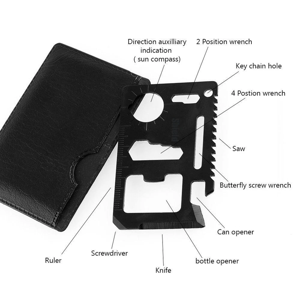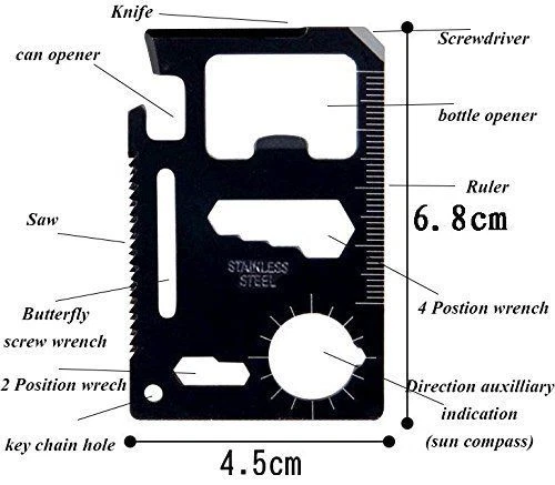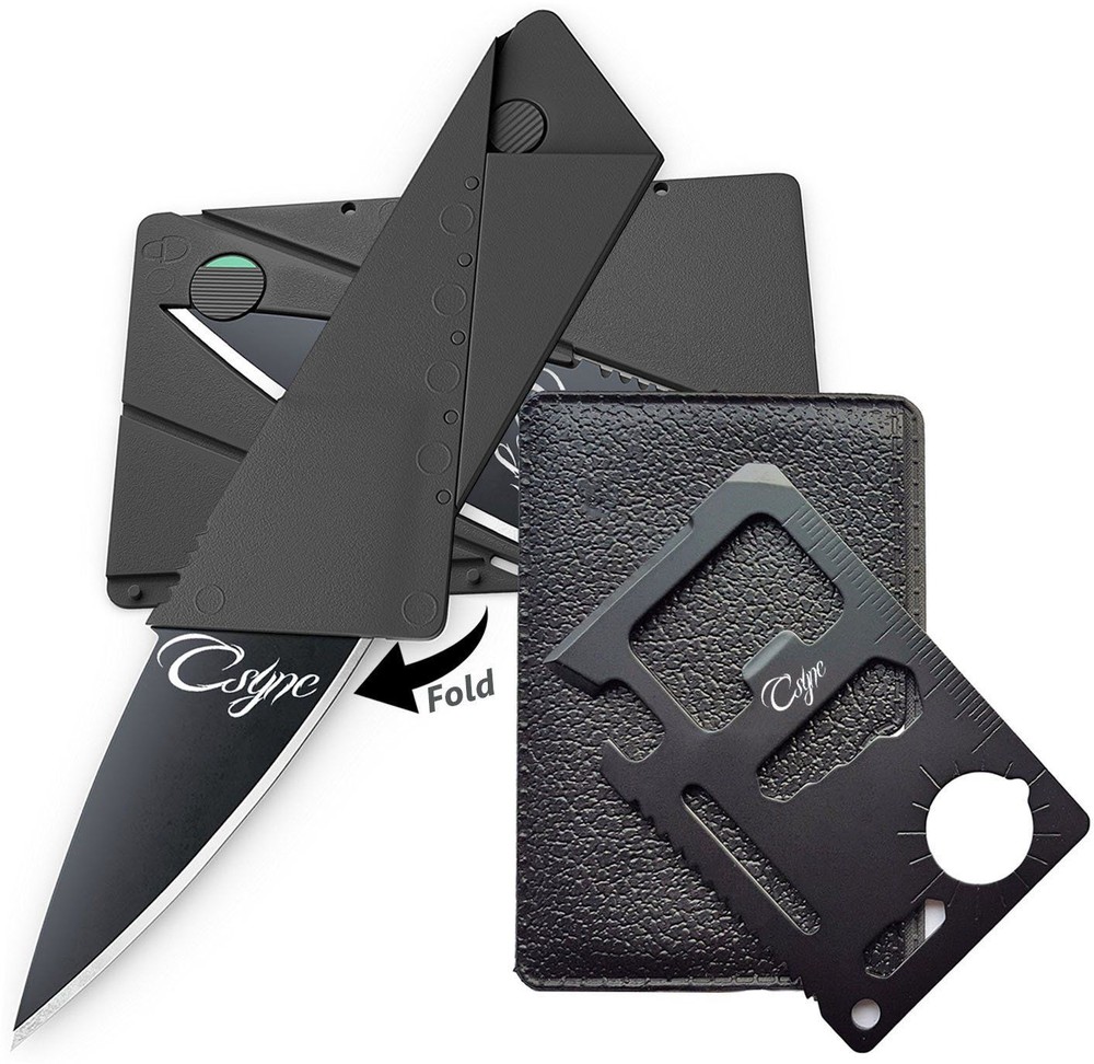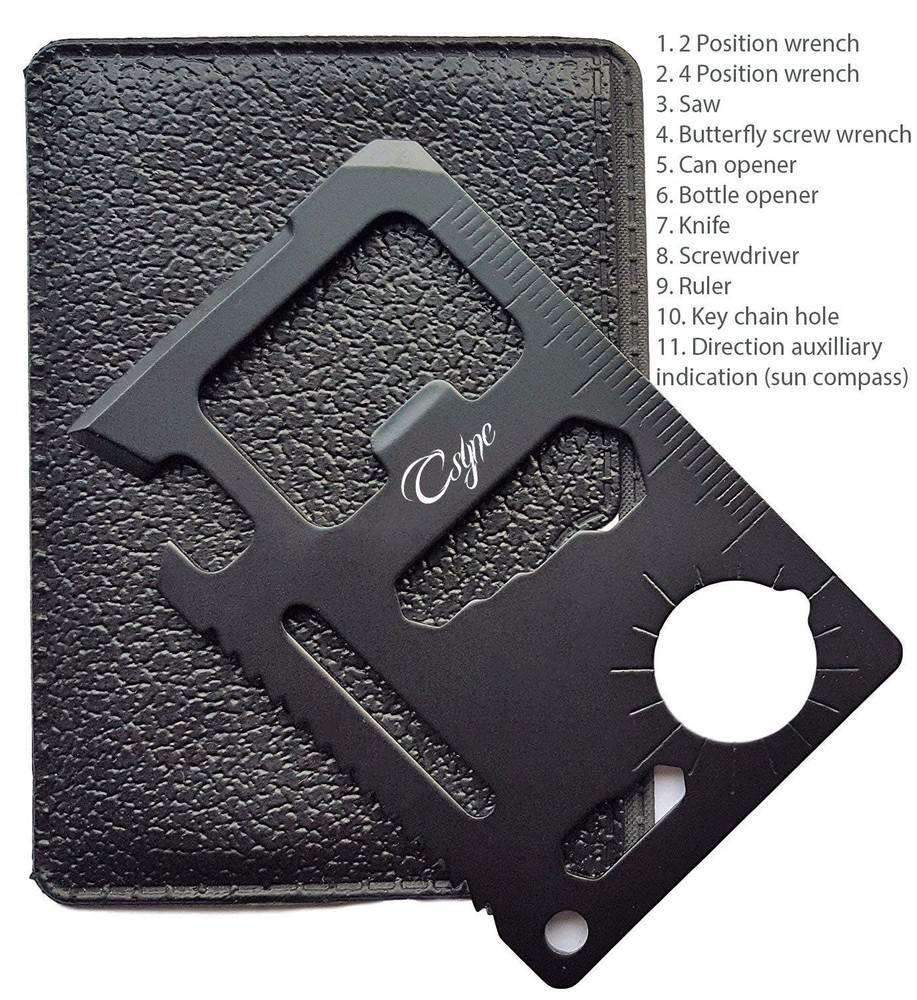 Product Description CsyncDirect Key Folding Knife CsyncDirect Knife The edge of the blade has a line of light reflecting steel Your wallet knife Folds to nearly the size of a credit card which can be carried in a wallet It is so thin and light weight you will likely forget your wallet has this useful tool, until you need it Folded Dimensions: Length 87mm x width 55mm x thickness 2mm (overall size of the card) Your credit card knife makes a great survival tool as well as being the perfect everyday use tool CsyncDirect Multitool CsyncDirect Multitool Offers Many Functions: includes a Bottle Cap Opener , knife edge, screwdriver, ruler, can opener, 4-position wrench, butterfly screw wrench, saw blade, direction auxilliary indication (sun compass), 2-position wrench, and a keychain or lanyard hole. Each credit card survival tool is inspected for quality and precision. Be prepared for any emergency!