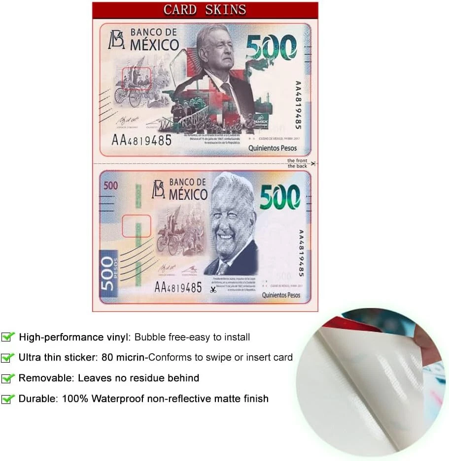 Free eBay listing template designed by dewiso.com Credit Card Sticker Debit Card Skin SMALL Chip Debit Cover Stickers Mexican, Mexico Currency Card Stickers for Debit Cards and Credit Cards (Amlo-Peso Debit Card Skin) 500 FREE AND FAST SHIPPING! Authentic Currency: Experience the genuine feel and design of Mexican with this debit cardskin. Secure Transactions: Protect your card details with this durable cardskin while making purchases in the usa. Unique Souvenir: Commemorate your travels or celebrate Mexican culture with this distinctive cardskin. Easy Application: Designed for seamless application and removal, preserving your debit card's integrity. Slim Profile: Maintain a sleek wallet with this ultra-thin, lightweight cardskin for your debit card. › See more product details Product We offer a 30-Day Return Policy on items which you are not completely satisfied with. You have the option for a full-refund or an exchange of the item. No returns are available on items shipped outside of the US . Shipping We offer Free Shipping to the US and ship within 2 business days of payment, usually sooner. We use UPS express shipping. That's why your products are usually delivered within 3 days . Contact We try our very best to make sure every customer is completely satisfied. If there's a problem , message us! We're happy to help. 24/7 live chat available.