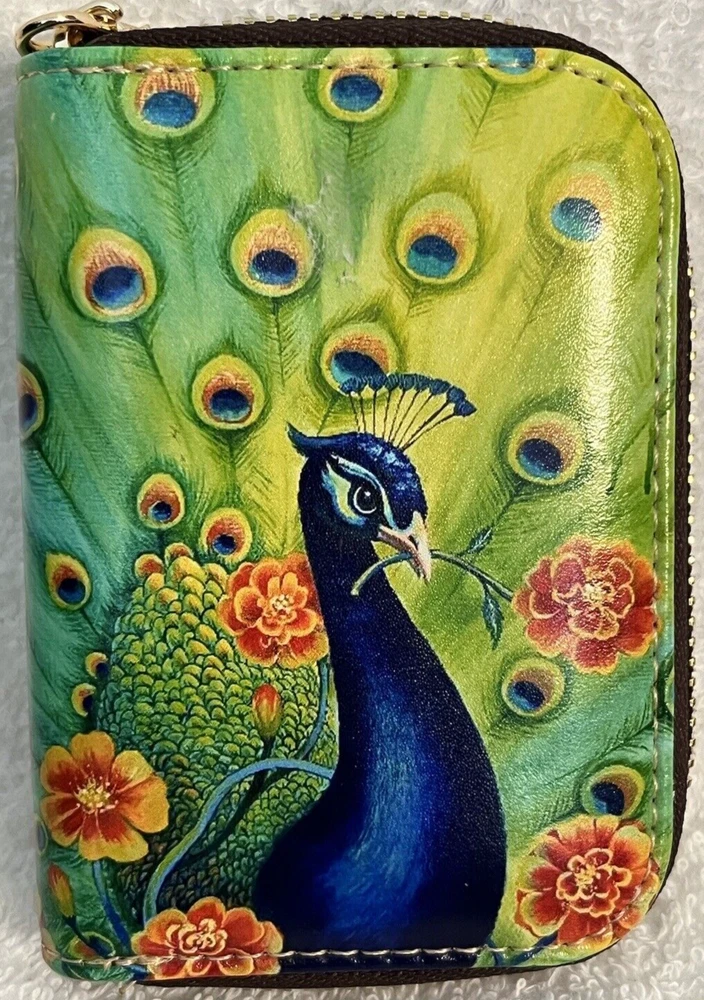 Credit Card Wallet Pouch Holder Key Full Zip Clutch Peacock Dual Sided Colorful