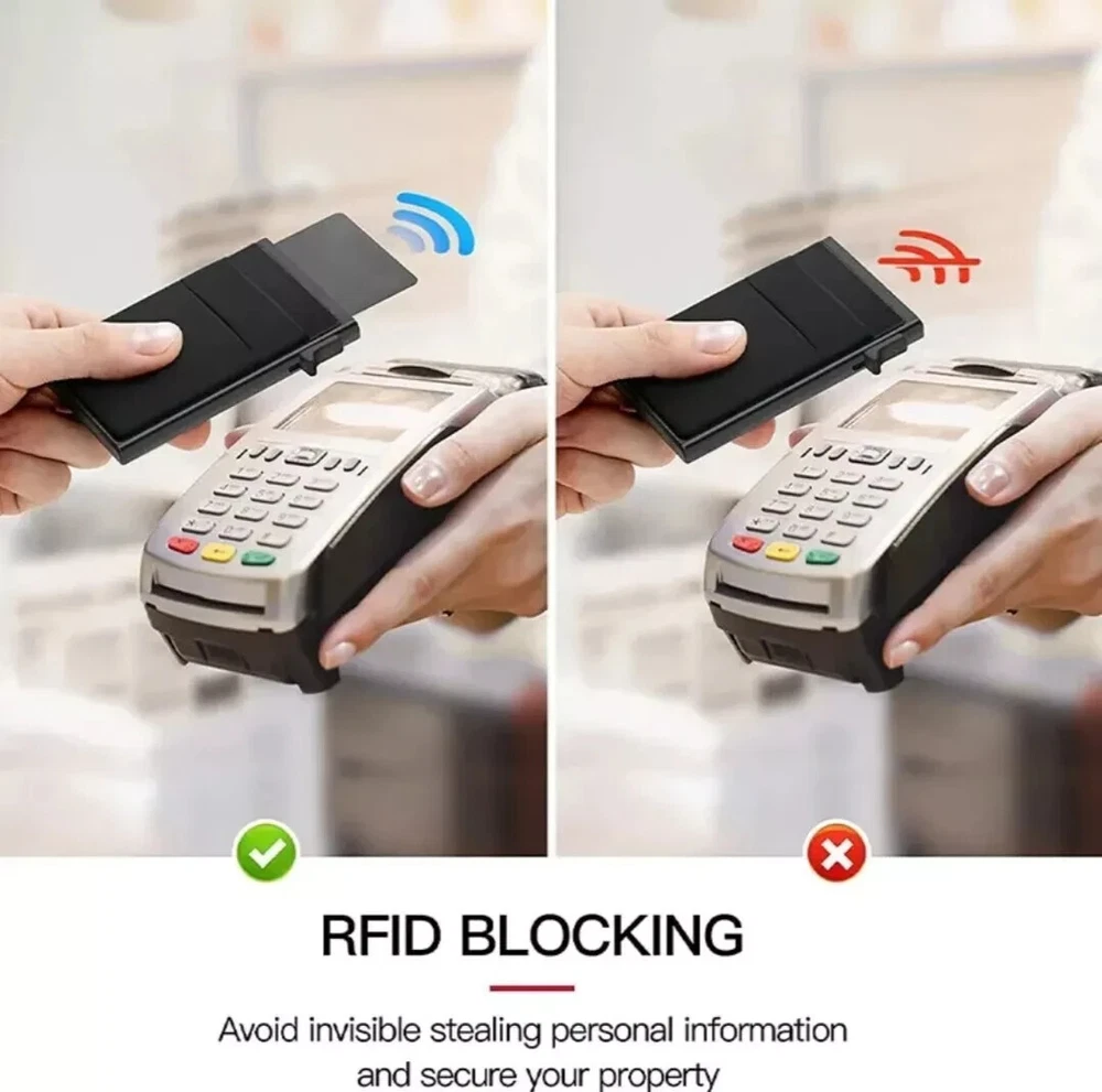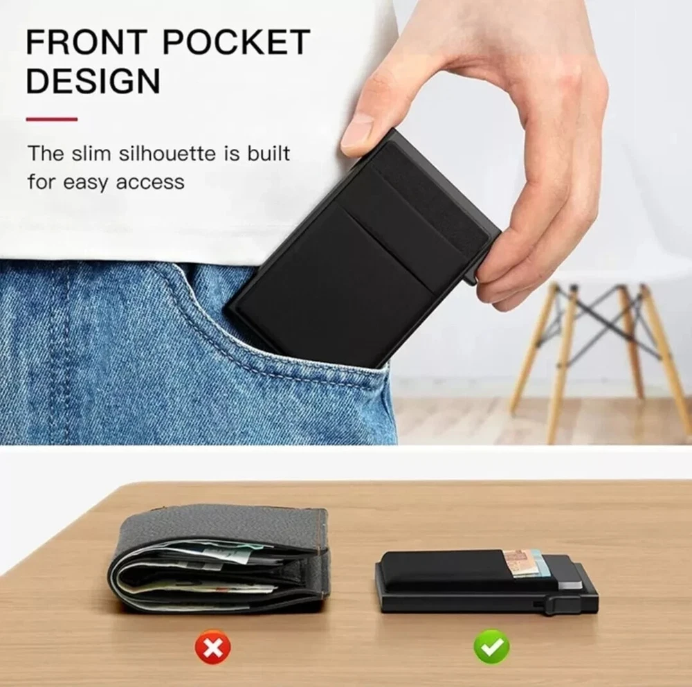 Introducing the ultimate pop-up black wallet for men! This wallet is perfect for the modern man who needs a sleek and stylish way to carry his essentials. With RFID blocking technology built in, you can rest assured that your credit cards and other important items are safe and secure. The wallet features multiple card slots, as well as a convenient money clip for holding your bills. Whether you're running errands or heading out for a night on the town, this wallet is the perfect accessory to complete your look. Presentamos la billetera negra emergente definitiva para hombres! Esta billetera es perfecta para el hombre moderno que necesita una forma elegante y con estilo de llevar sus elementos esenciales. Con la tecnología de bloqueo RFID incorporada, puede estar seguro de que sus tarjetas de crédito y otros artículos importantes están seguros y protegidos. La billetera cuenta con múltiples ranuras para tarjetas, así como un práctico clip para billetes para guardar sus billetes. Ya sea que estés haciendo recados o saliendo a pasar una noche en la ciudad, esta billetera es el accesorio perfecto para completar tu look.