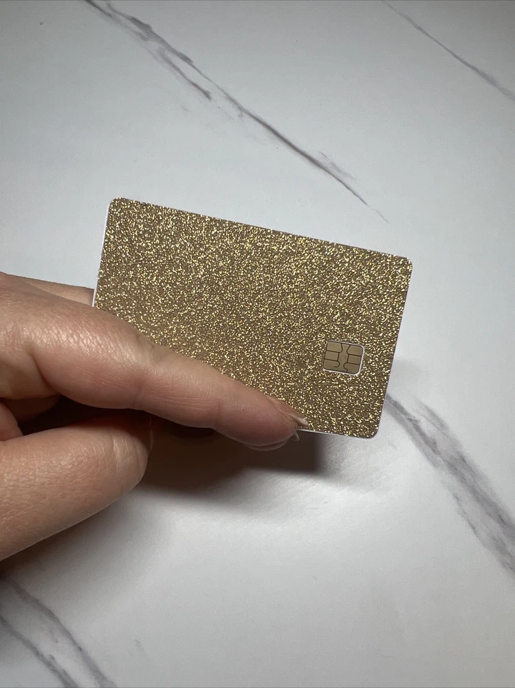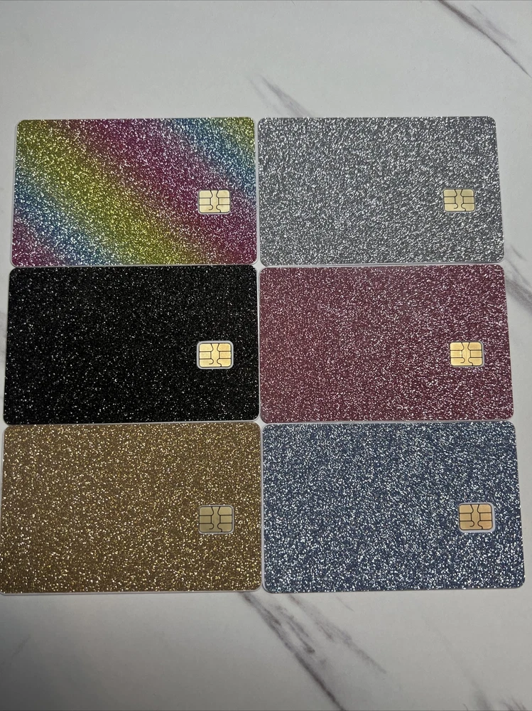 **Dress up your credit card!! Pick if you want the chip only cutout or a cutout for your name, and card number. **Highest quality **Glitter Skin. Does not rub off. **Just place over your existing card face or peel your old card sticker off and replace. **Ultra thin to work in machines. Some of the newer machines may have a little trouble inserting the glitter card. But they do work!