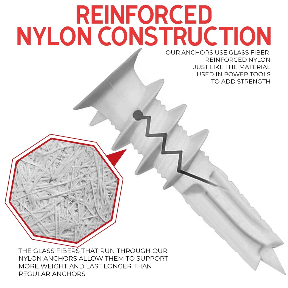 NOT LIKE OTHER ANCHORS: These heavy duty drywall anchors have strong ribs which can holds 75lbs weight and will keep our anchors stable in your drywall. Made of high-quality nylon plastic mixes with highly robust glass fibers. EASY TO USE & DURABLE: Once the screw anchors are in the drywall, the anchors will wedge tightly against the it. The anchor cannot damage the wall. Even with high controlled pressure & torque the anchor will not split. These plastic anchors can easily be removed can be reuse. SELF DRILLING DRYWALL ANCHORS: While the ordinary screws and anchors bend and snap, Crimson Mark drywall anchors and screws kit comes with well designed and manufactured items. With sharp and pointed shanks these anchors can be screwed into the wall so easily, without pre-drilled hole by using screwdriver and screw gun, which produce less dust. MULTI TASKING DRYWALL KIT: These ribbed hollow ez anchors are very simple to install. The #8 x 1-1/4'' screw and anchor set are perfect for hanging bathroom and kitchen accessories, shelving, mirrors, TV, picture frames, curtain rods and small decorative, on various wall surfaces, such as sheetrock and plaster walls. PURCHASE WITH QUALITY ASSURANCE: Purchase today with confidence. Thanks to its reliable quality and durability, you can use our drywall screws and anchors set to secure your hanging objects with confidence. You will receive 25 plastic wall anchors 25 galvanized screws and 1 attractive clear plastic organizer boxes. Each 50-piece set comes neatly packaged in a reusable case.
