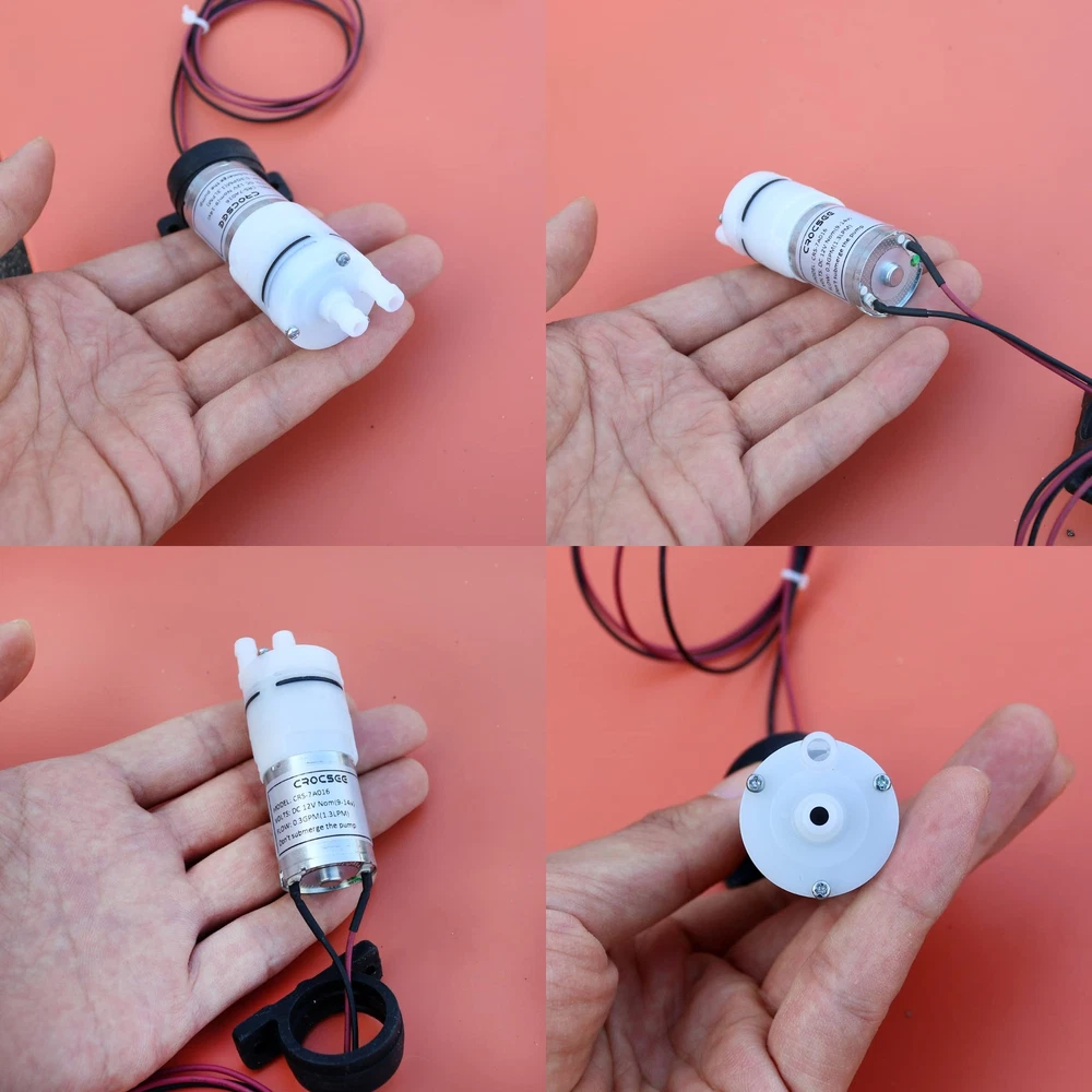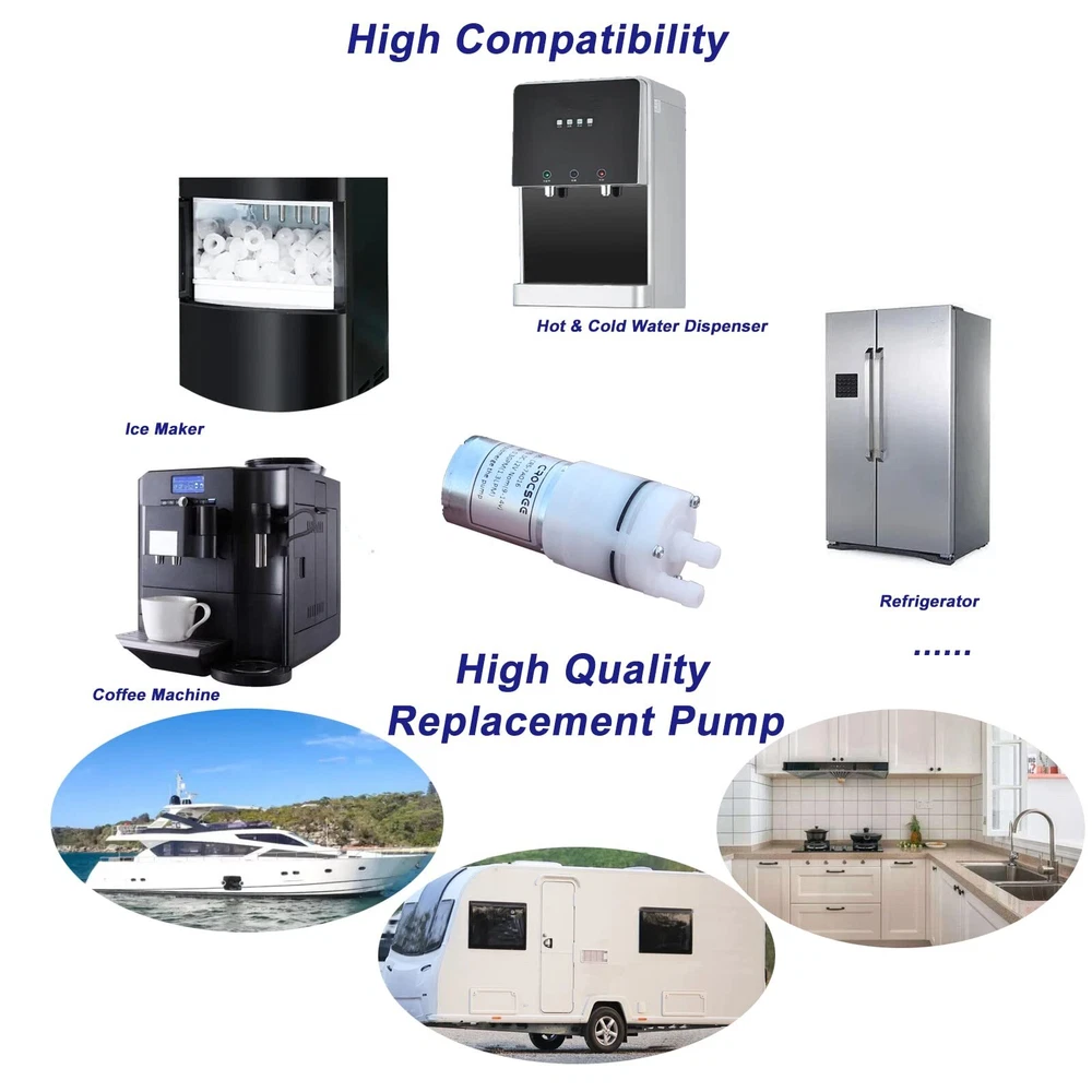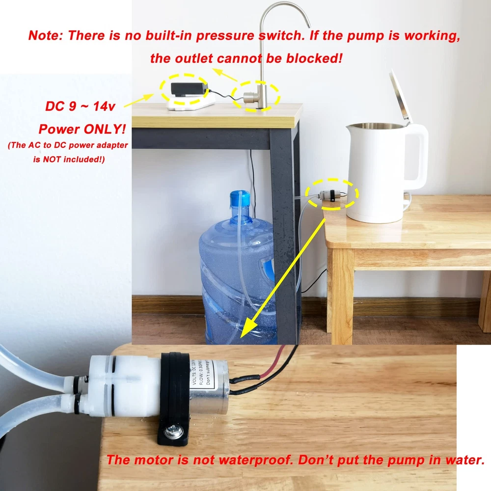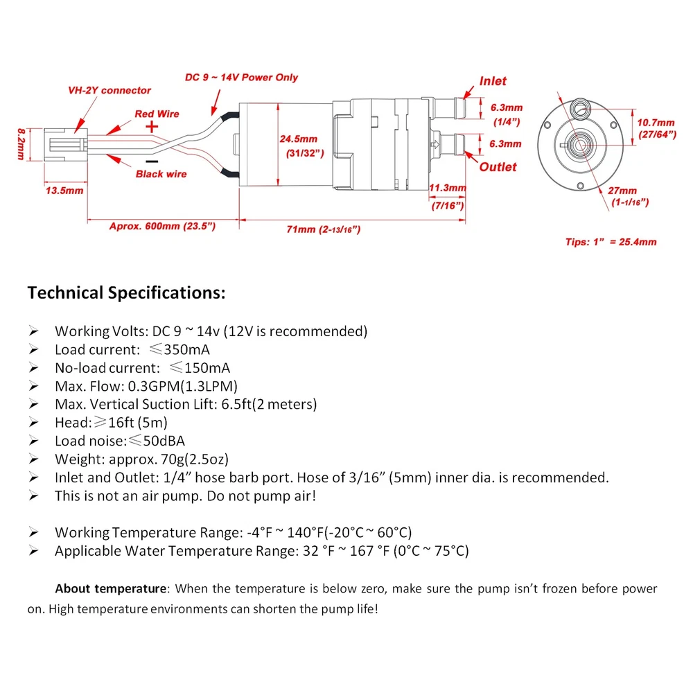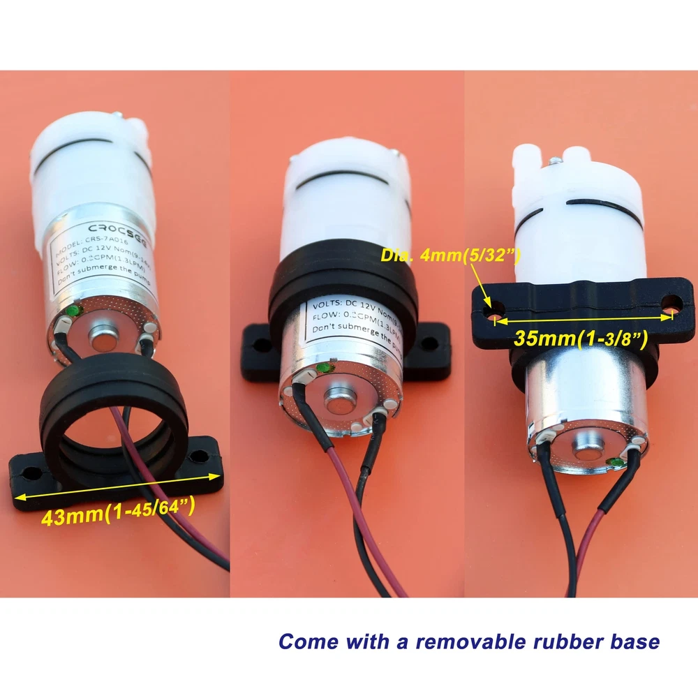 CrocSee DC 12V 1.3LPM Micro Food Grade Self Priming Diaphragm Water Pump Technical Specifications: Working Volts: DC 9 ~ 14v (12V is recommended) Load current: ≤350mA No-load current: ≤150mA Max. Flow: 0.3GPM(1.3LPM) Max. Vertical Suction Lift: 6.5ft(2 meters) Head:≥16ft (5m) Load noise:≤50dBA Weight: approx. 70g(2.5oz) Inlet and Outlet: 1/4” hose barb port. Hose of 3/16” (5mm) inner dia. is recommended. Working Temperature Range: -4°F ~ 140°F(-20°C ~ 60°C) Applicable Water Temperature Range: 32 °F ~ 167 °F (0°C ~ 75°C). About temperature: When the temperature is below zero, make sure the pump isn’t frozen before power on. High temperature environments can shorten the pump life! Working Volts: DC 9 ~ 14v (12V is recommended), DO NOT USE AC POWER SOURCE! Load current: ≤350mA, No-load current: ≤150mA Pump with self-priming function: Max. Vertical Suction Lift: 6.5ft(2m). Max. Flow: 0.3GPM(1.3LPM), Head(High Lift):≥16ft (5m) Inlet and Outlet: 1/4” hose barb port. Hose of 3/16” (5mm) inner dia. is recommended. Approx. Size: 71mm x 27mm / 2.8" x 1.06"(L*Max.Dia) The pump head is made of Food Grade materials. High Quality Long Life Replacement Pump for Ice Maker,Coffee Machine, Hot & Cold Water Dispenser, Refrigerator, fish tank, tea machine, etc. Low noise, easy installation, stable performance. Appropriate for liquid circulation, transfer etc. DO NOT Pump Flammable/Corrosive/High Viscous/Muddy Liquids! There is no built-in pressure switch. If the pump is working, the outlet of the pump cannot be blocked!