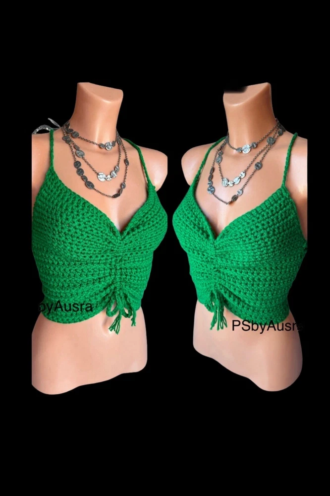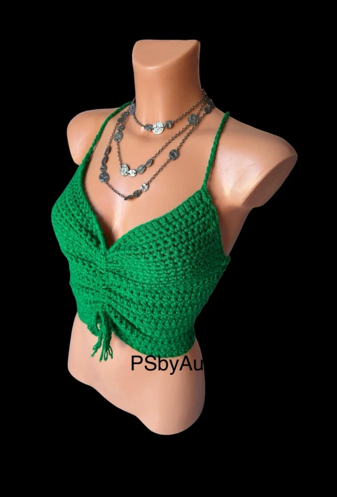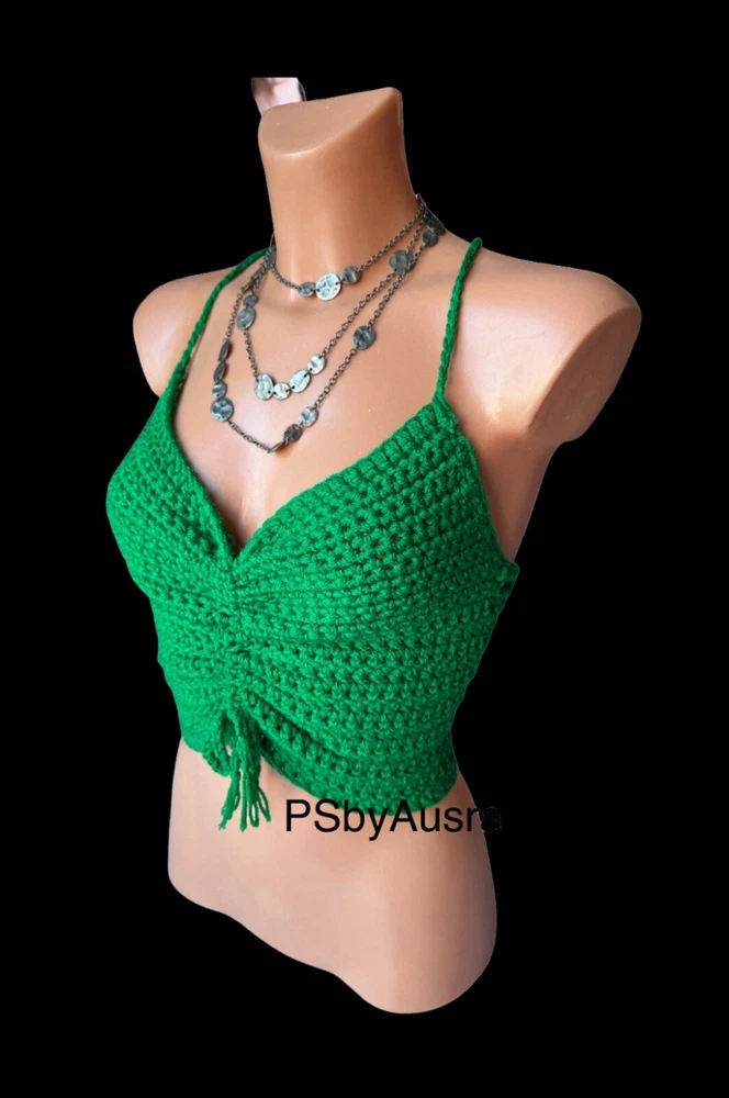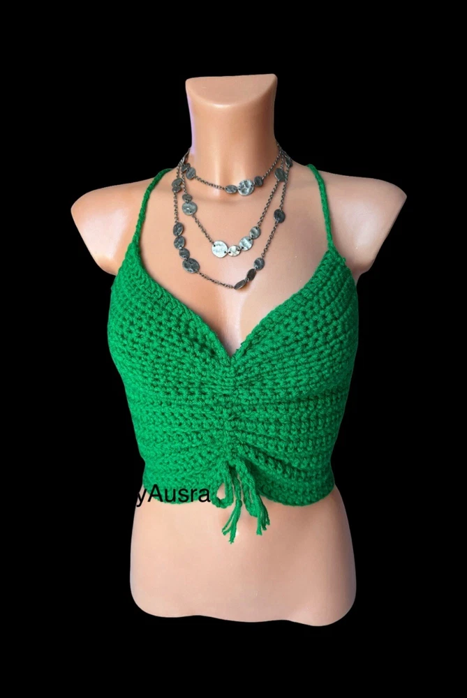 Size: S Season: Autumn, Spring, Summer Closure: Tie Vintage: Yes Neckline: Halter Type: Tank Colour: Green Style: Basic Department: Women Size Type: Regular Sleeve Length: Sleeveless Features: Adjustable Strap Sleeve Type: Strappy Sleeve Accents: Crochet Fabric Type: Crochet Pattern: No Pattern Character: Happy, Hippie Handmade: Yes Strap Type: Halter Brand: Handmade Occasion: Casual, Party/Cocktail, Travel Material: Acrylic Fit: Classic Theme: 90s, Beach, Hippie, Outdoor, Festival, Fun, Happy, Modern