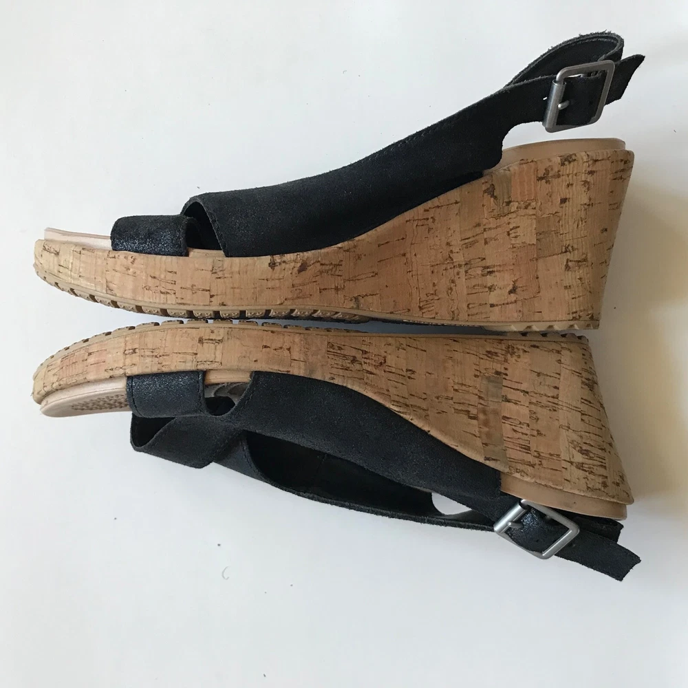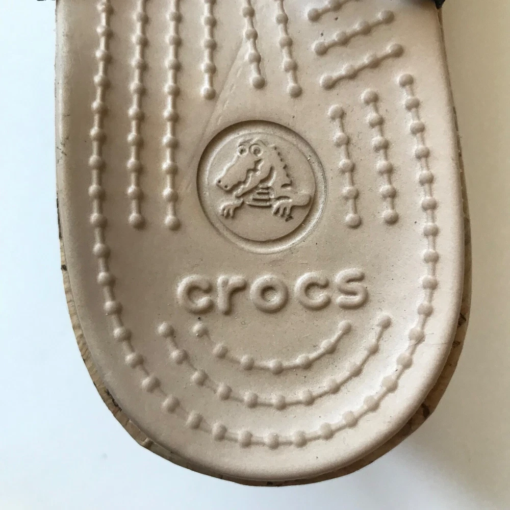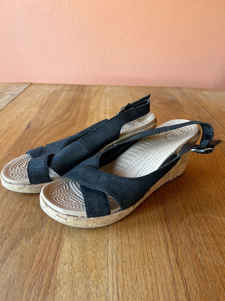 Crocs A-Leigh Womens 8 Leather Cork Wedge Heel Slingback Peep Toe Sandal Black
