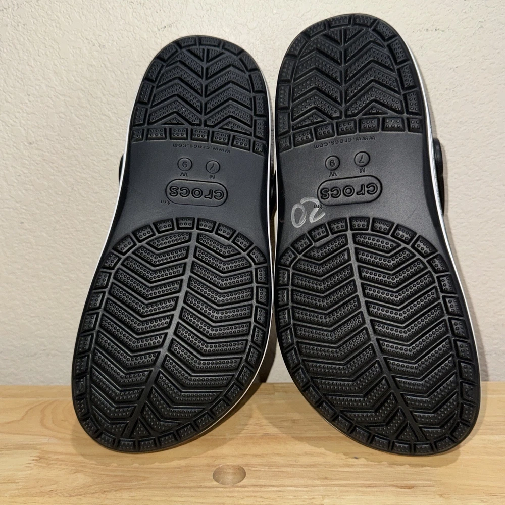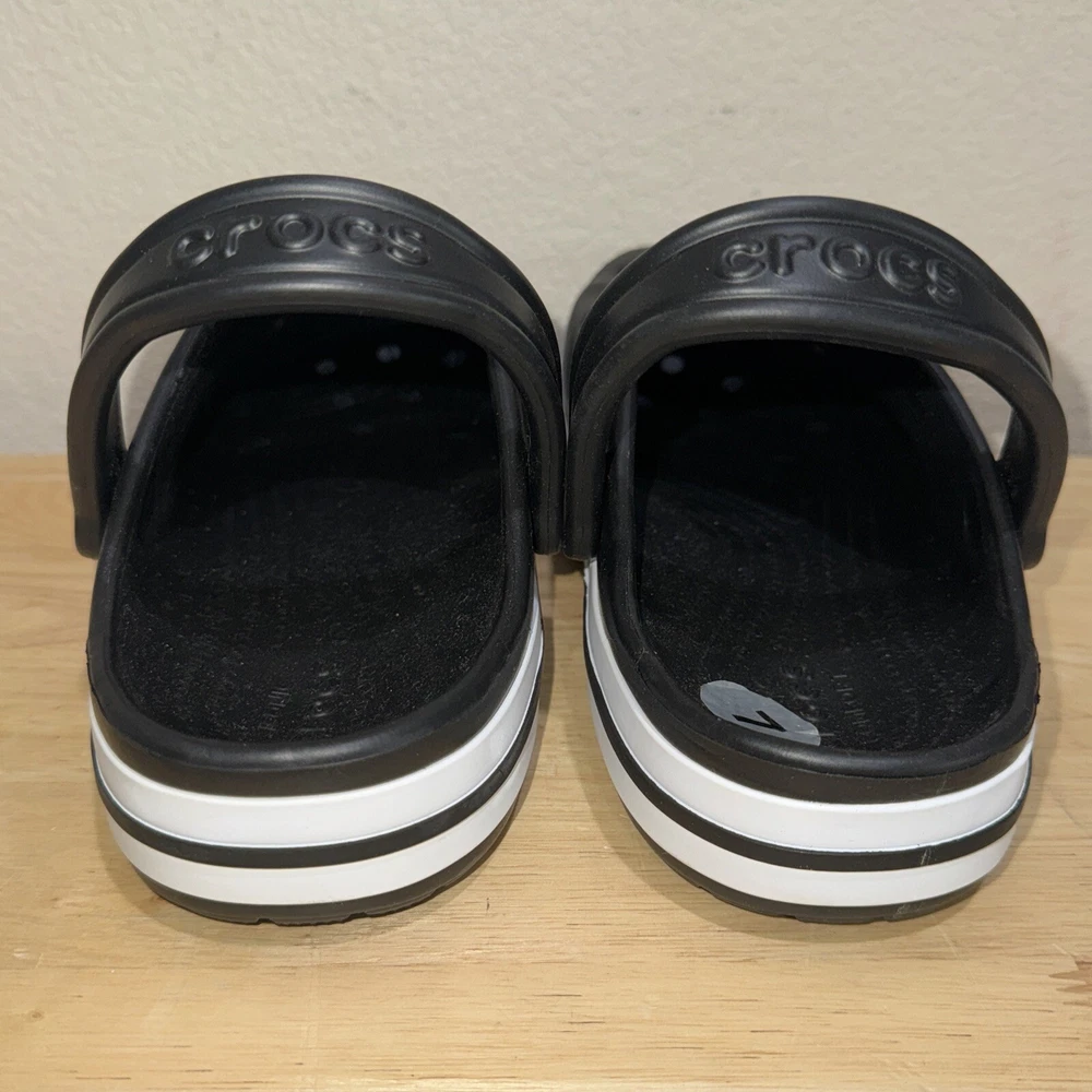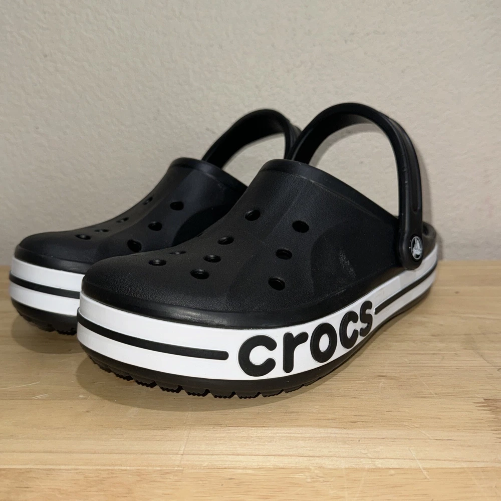 Elevate your casual style with these Crocs Bayaband Clogs, perfect for any occasion from travel to the beach. The slip-on design with ankle strap and closed-toe clogs provide both comfort and style. The waterproof and breathable features make them perfect for those hot summer days. These clogs are made from ethylene vinyl acetate and have a synthetic outsole and insole material. The Crocs Bayaband Clogs come in black and feature a chevron logo accent. They are available in men's size 7 and women's size 9. Get ready for the summer, fall, or spring with these versatile and fashionable clogs.