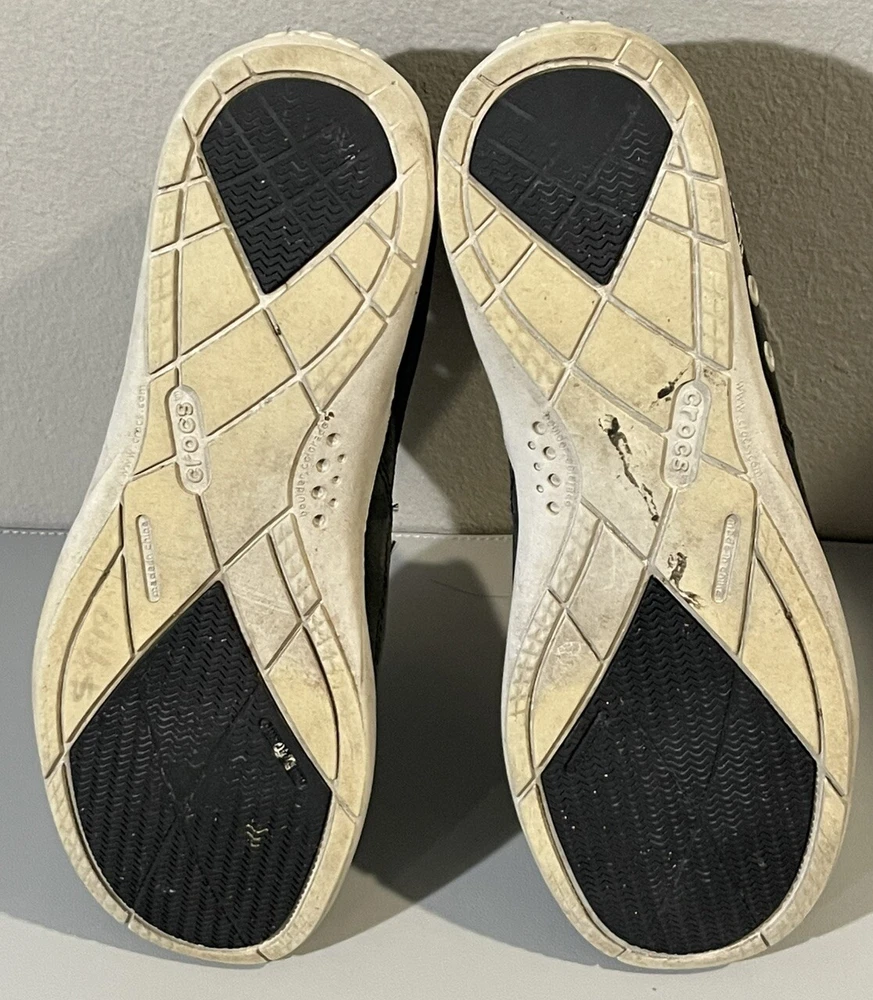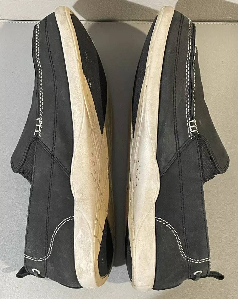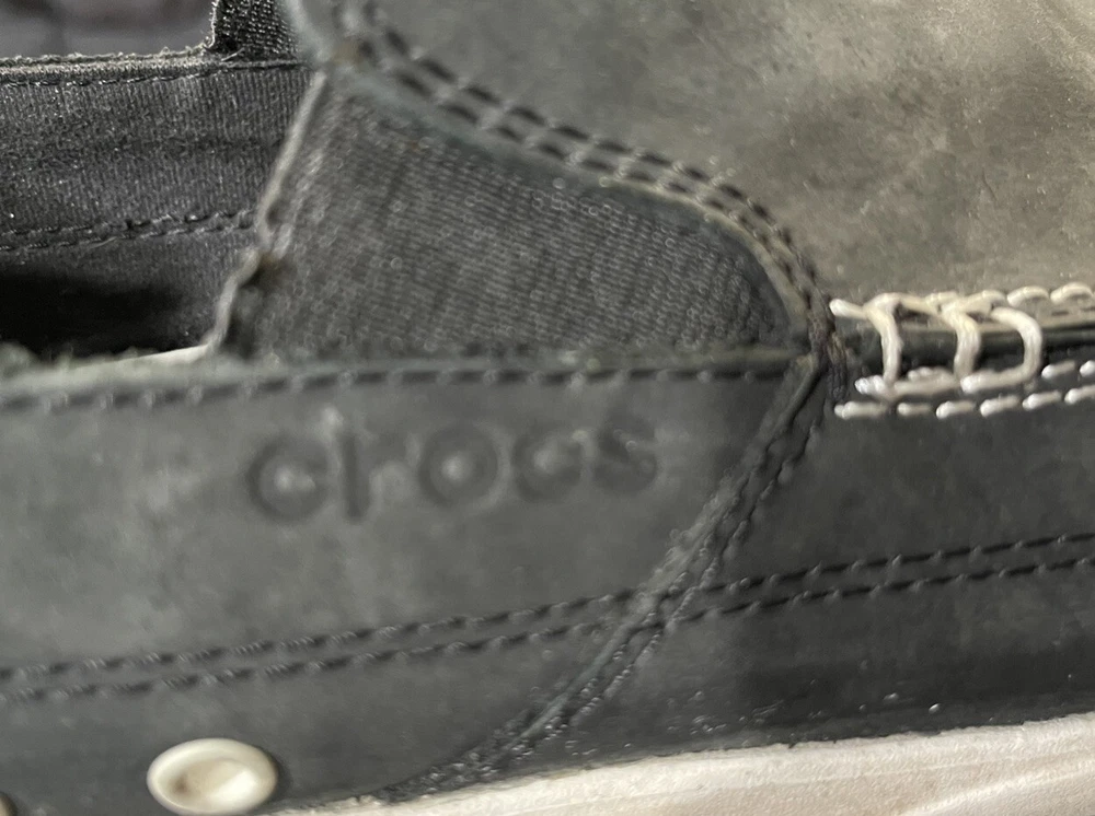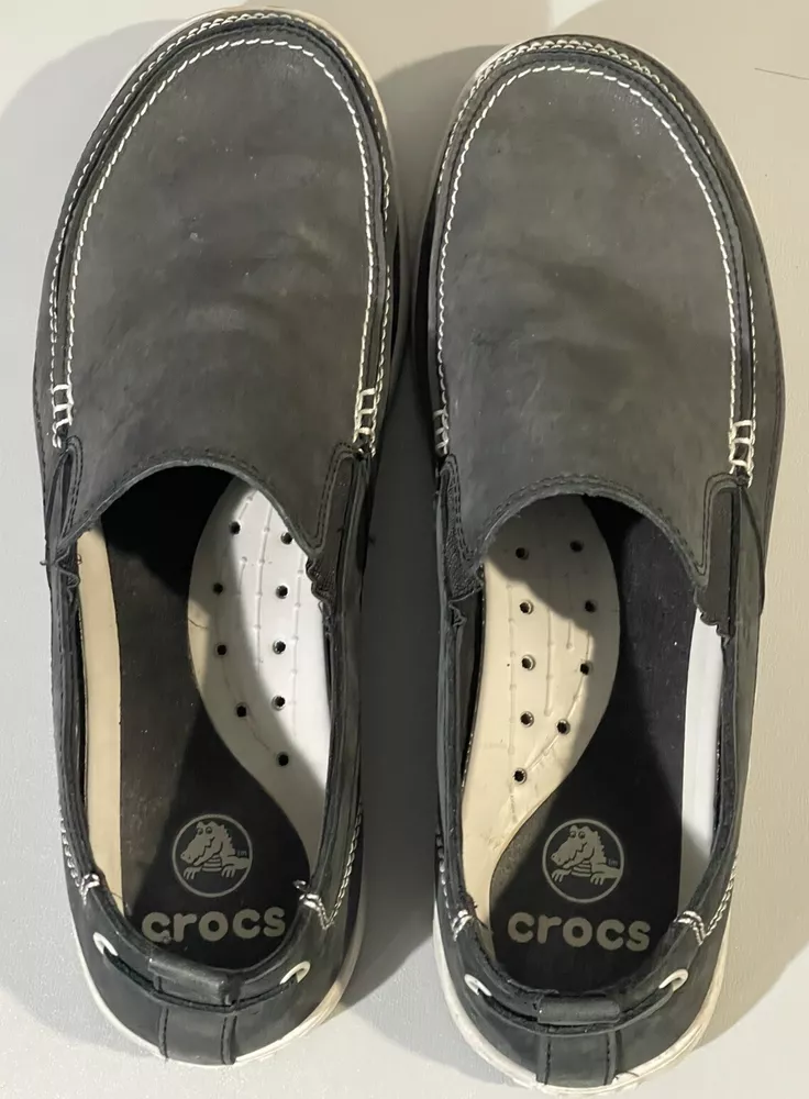 With sign of imperfection pls refer to pictures. SOLD AS IS. These Crocs Harborline Black Loafer Shoes are designed for men in size 12. They feature a slip-on style with round toe shape and are made of Nubuck leather with a rubber outsole. The shoes are lightweight, cushioned, and breathable, making them suitable for travel, casual outings, or workwear.