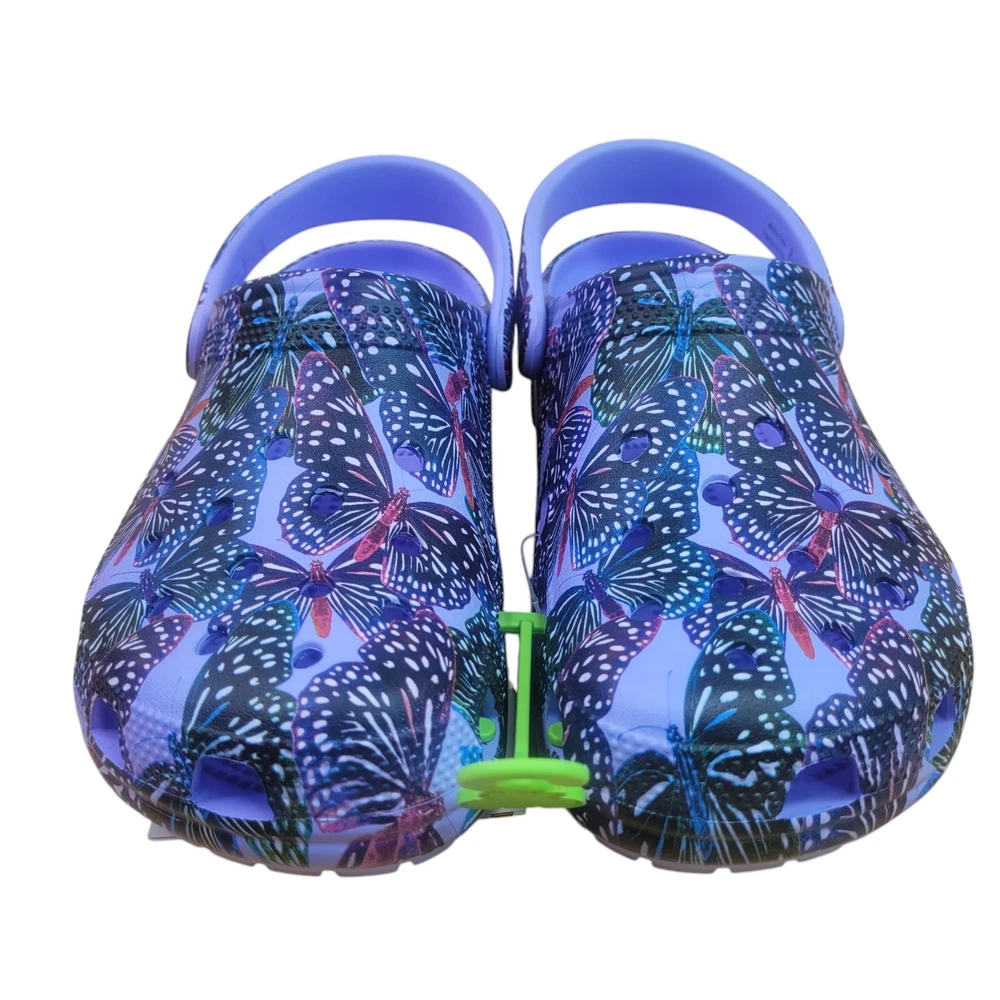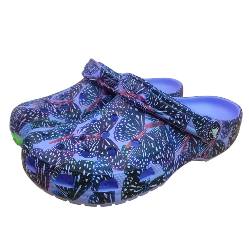 Crocs Classic Butterfly Clog Womens 9 Mens 7 Moon Jelly / Multi Color The Crocs Classic Butterfly Clog in Women's size 9 and Men's size 7 is a slip-on style shoe in the Moon Jelly/Multi color. Made with Croslite material, these clogs feature a classic design with a butterfly pattern, offering both comfort and style. Perfect for casual wear, these Crocs are a versatile choice for women looking for a fun and colorful addition to their shoe collection.