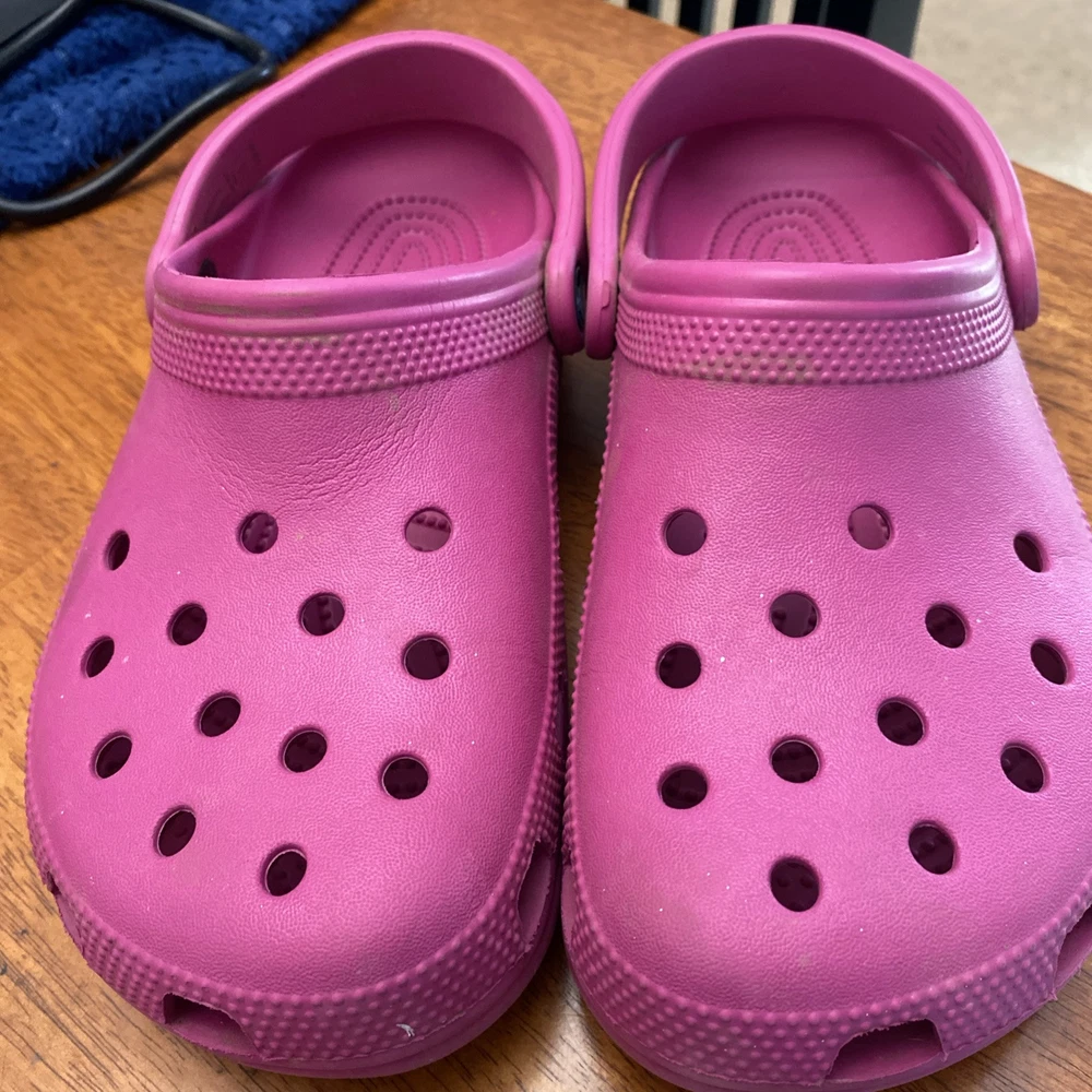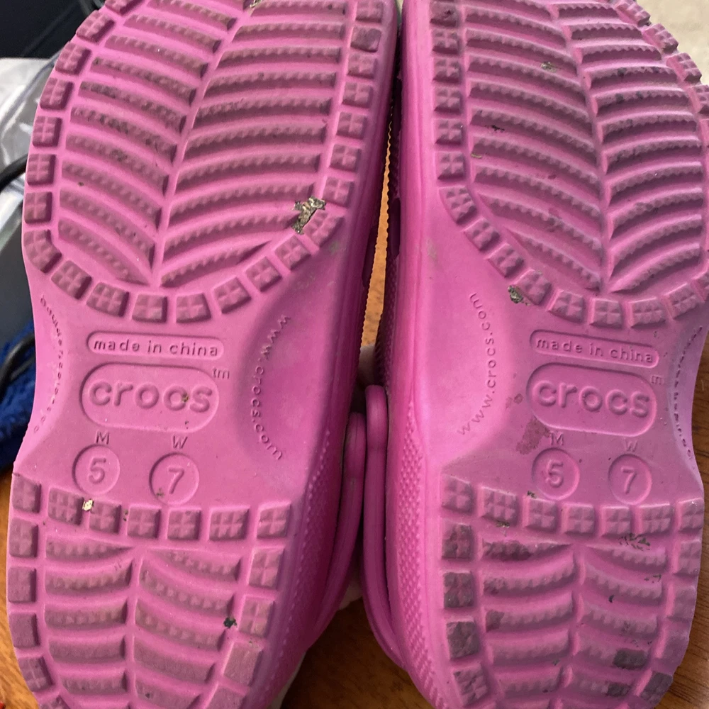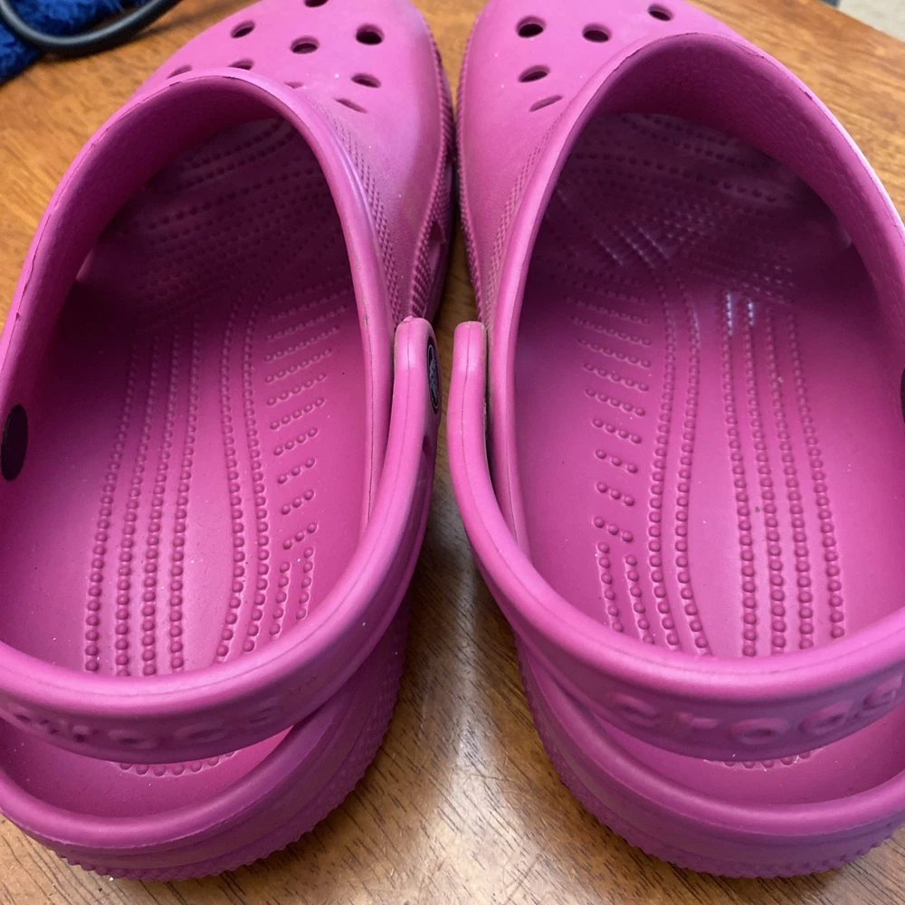 Crocs Classic Clog Original in unisex size 7 for women or size 5 for men. The clogs are pink with a solid pattern and slip-on closure. They feature a low heel height and are made of breathable rubber material, providing comfort. These casual clogs have a classic design with a standard shoe width, suitable for everyday wear.