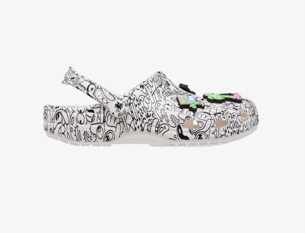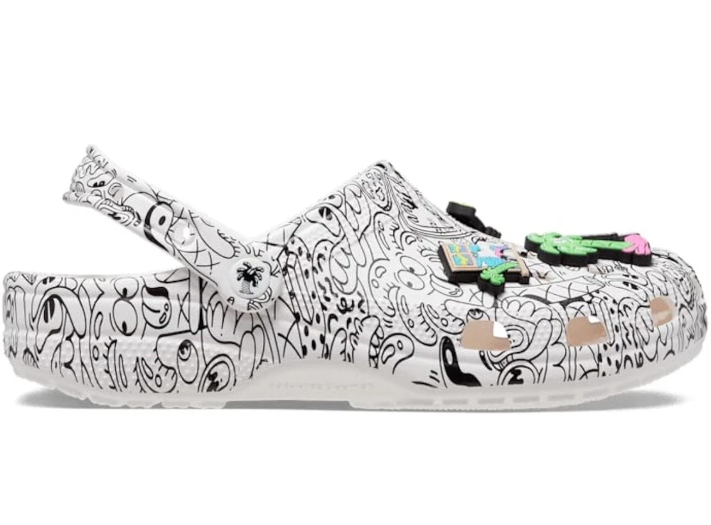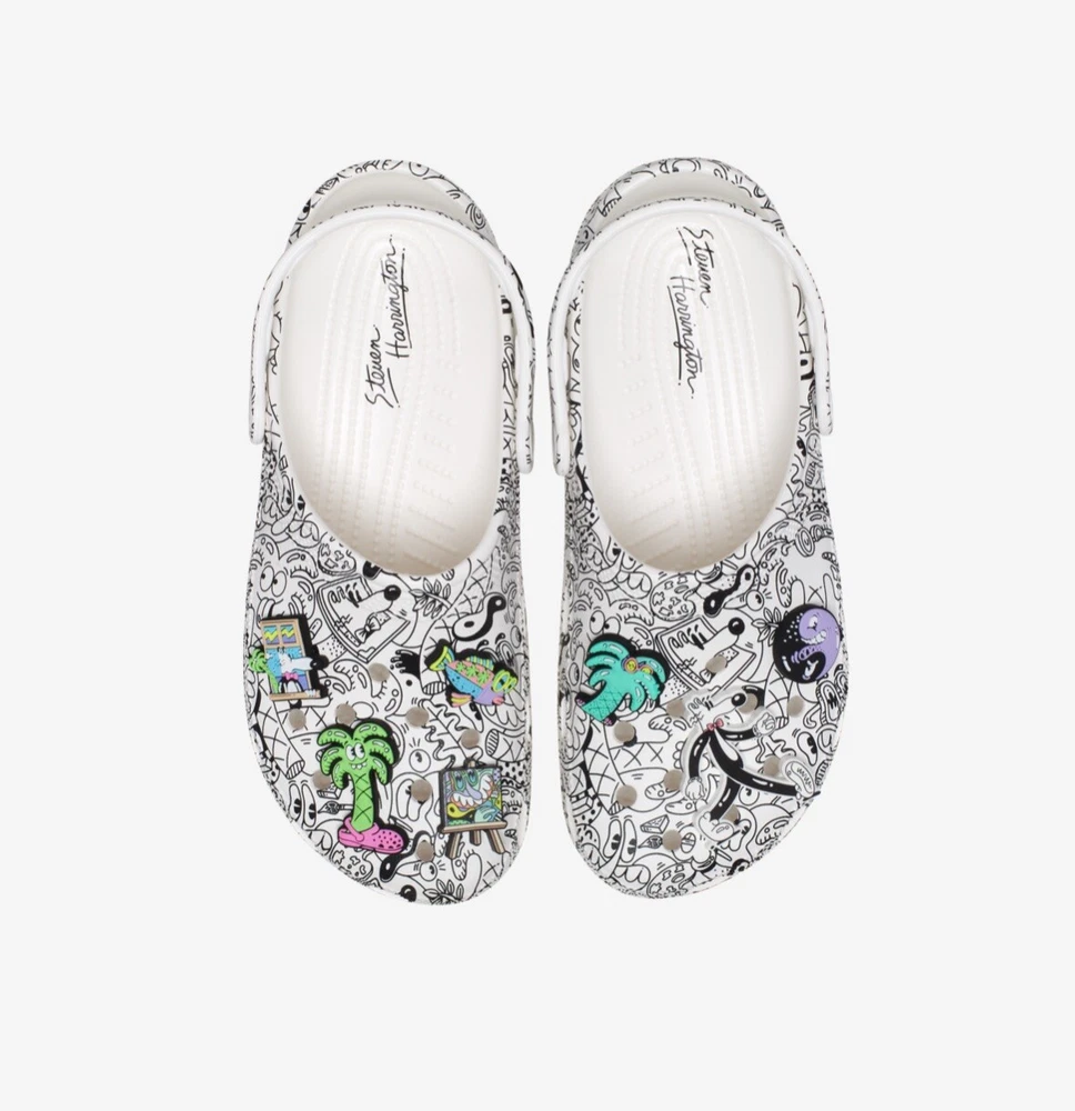 Elevate your summer footwear game with these stylish Crocs Classic Clog Steven Harrington Collage Art sandals. Featuring a colorful multicolor pattern with the iconic Steve Harrington logo, these slip-on sandals are perfect for travel, activewear, and casual occasions. The rubber outsole provides non-slip comfort, while the rubber lining material and insole material add to the overall comfort. The clog design is perfect for the summer, fall, and spring seasons. Made in China, these Crocs are a must-have for any fashion-forward man's shoe collection. **RARE**