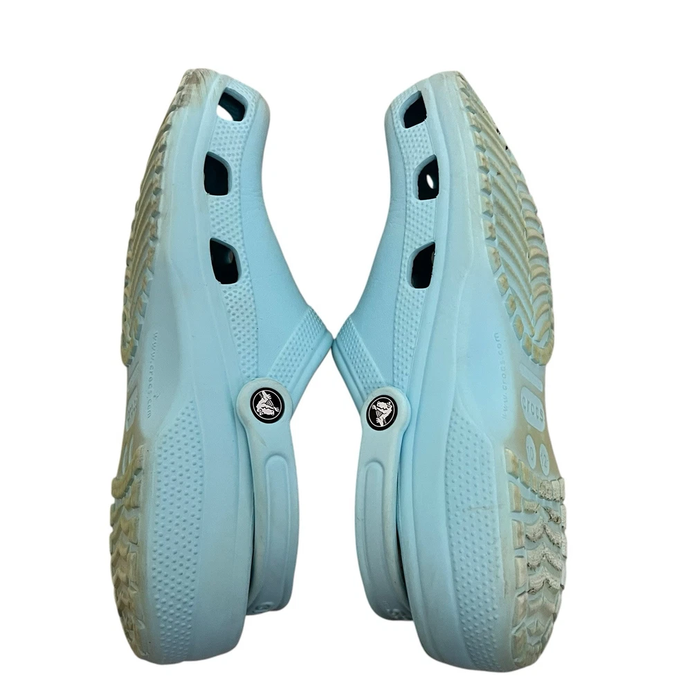 Elevate your summer footwear game with these sky light blue Crocs. These classic clogs are perfect for a casual look and provide comfort and breathability to your feet. The synthetic upper material is lightweight, making it easy to wear them all day long. The slip-on closure ensures easy wear, and the solid pattern gives it a chic look. These Crocs are perfect for both men and women, and the size 10 fits true to size. Get your hands on these clogs and add a pop of color to your summer wardrobe. In very good condition. Don’t have much actual wear, but there is some staining and scuffs as pictured. One strap has what looks to be a small burn. Please use zoom for exact condition. Plenty of wear left!