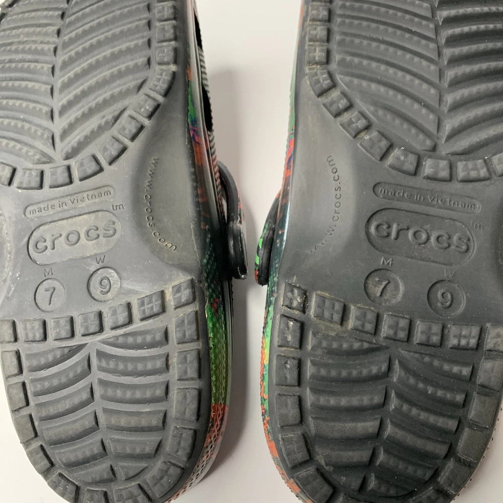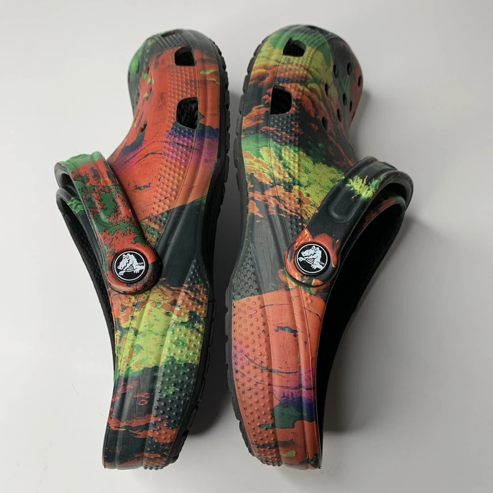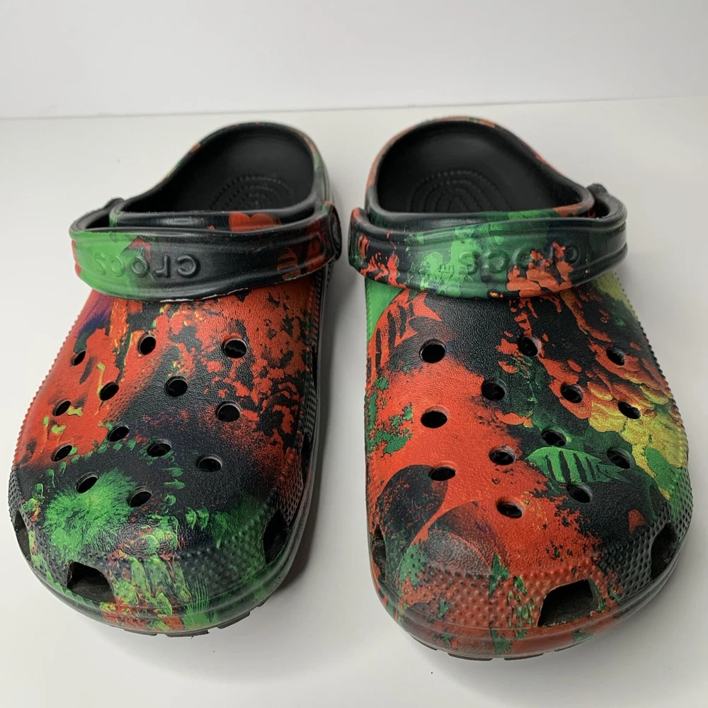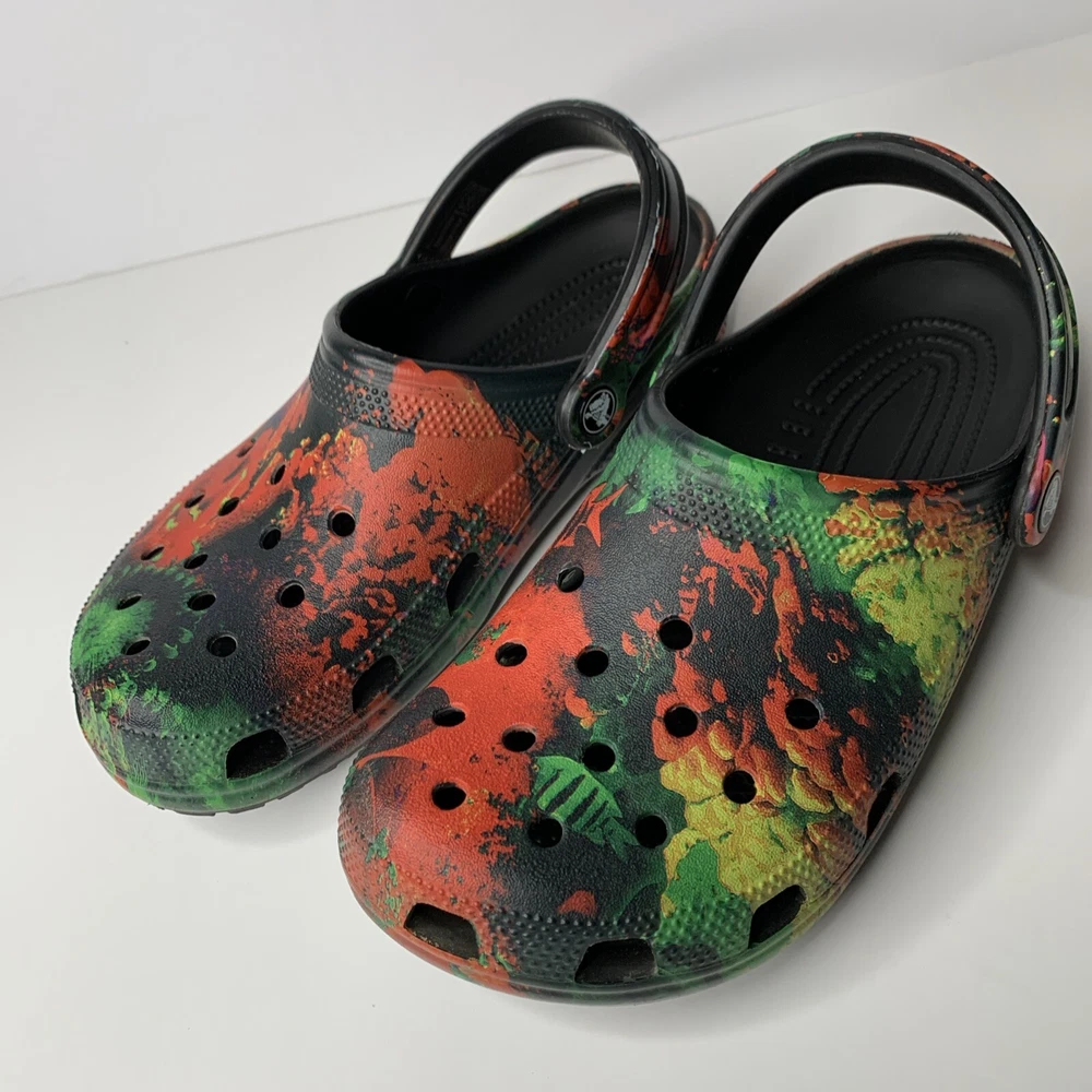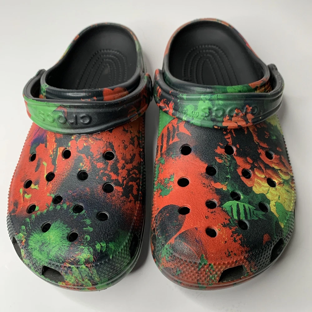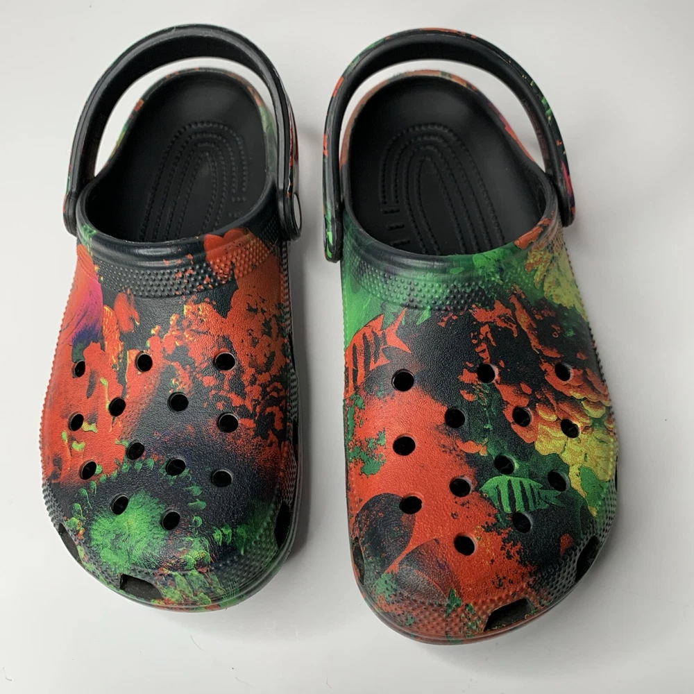 Crocs Classic Cyber Beach Clog in Women's Size 9 with a round toe shape, slip-on closure, and low heel height. This multicolor clog features a strap accent with the Crocs logo, perfect for travel or casual wear in the summer, fall, or spring. Made with rubber outsole and synthetic lining, it offers comfort with iconic Crocs Comfort™ technology. Ideal for beach activities with a classic design.