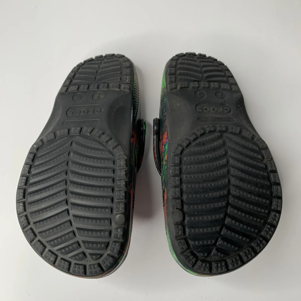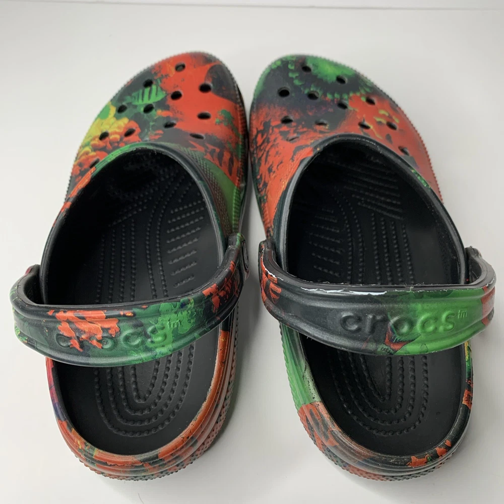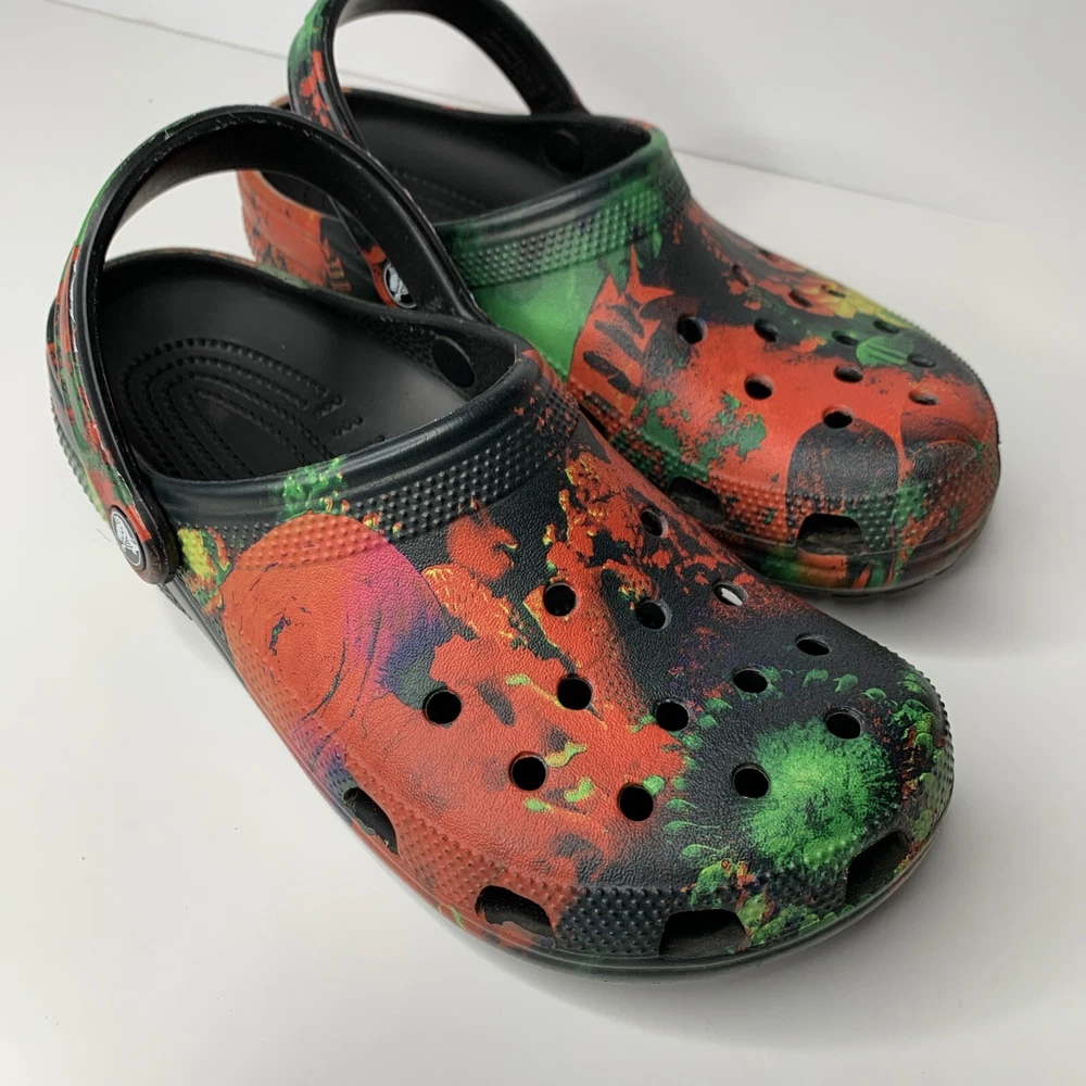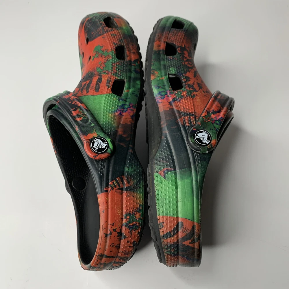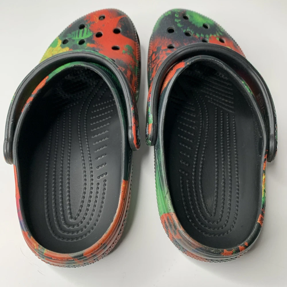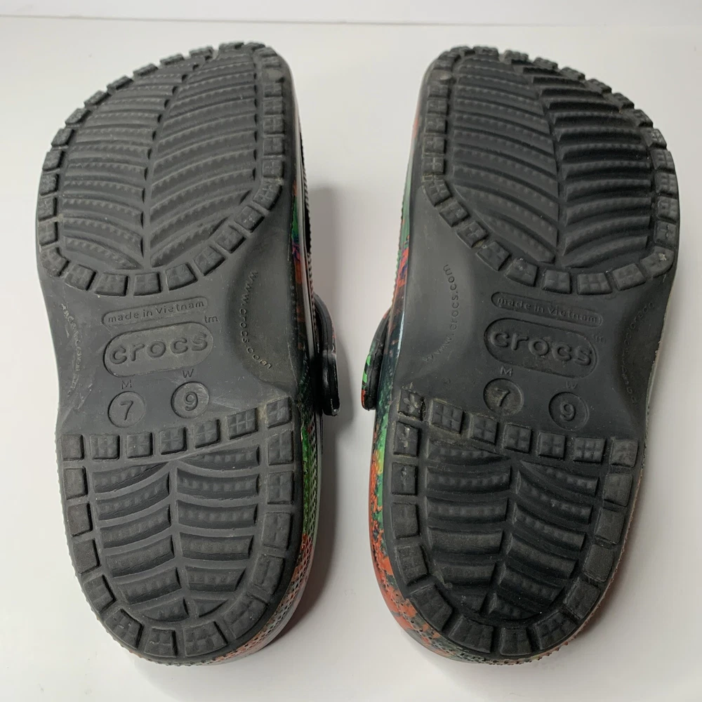 Crocs Classic Cyber Beach Clog in Women's Size 9 with a round toe shape, slip-on closure, and low heel height. This multicolor clog features a strap accent with the Crocs logo, perfect for travel or casual wear in the summer, fall, or spring. Made with rubber outsole and synthetic lining, it offers comfort with iconic Crocs Comfort™ technology. Ideal for beach activities with a classic design.