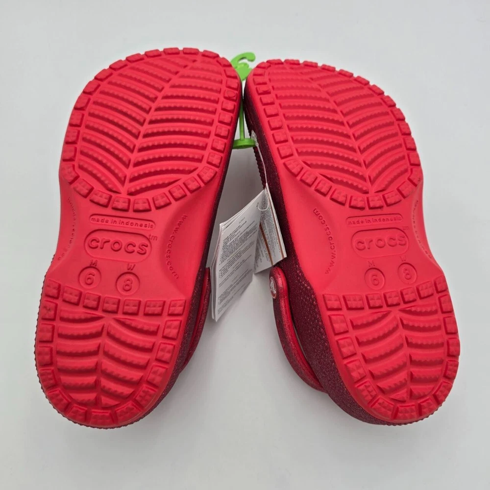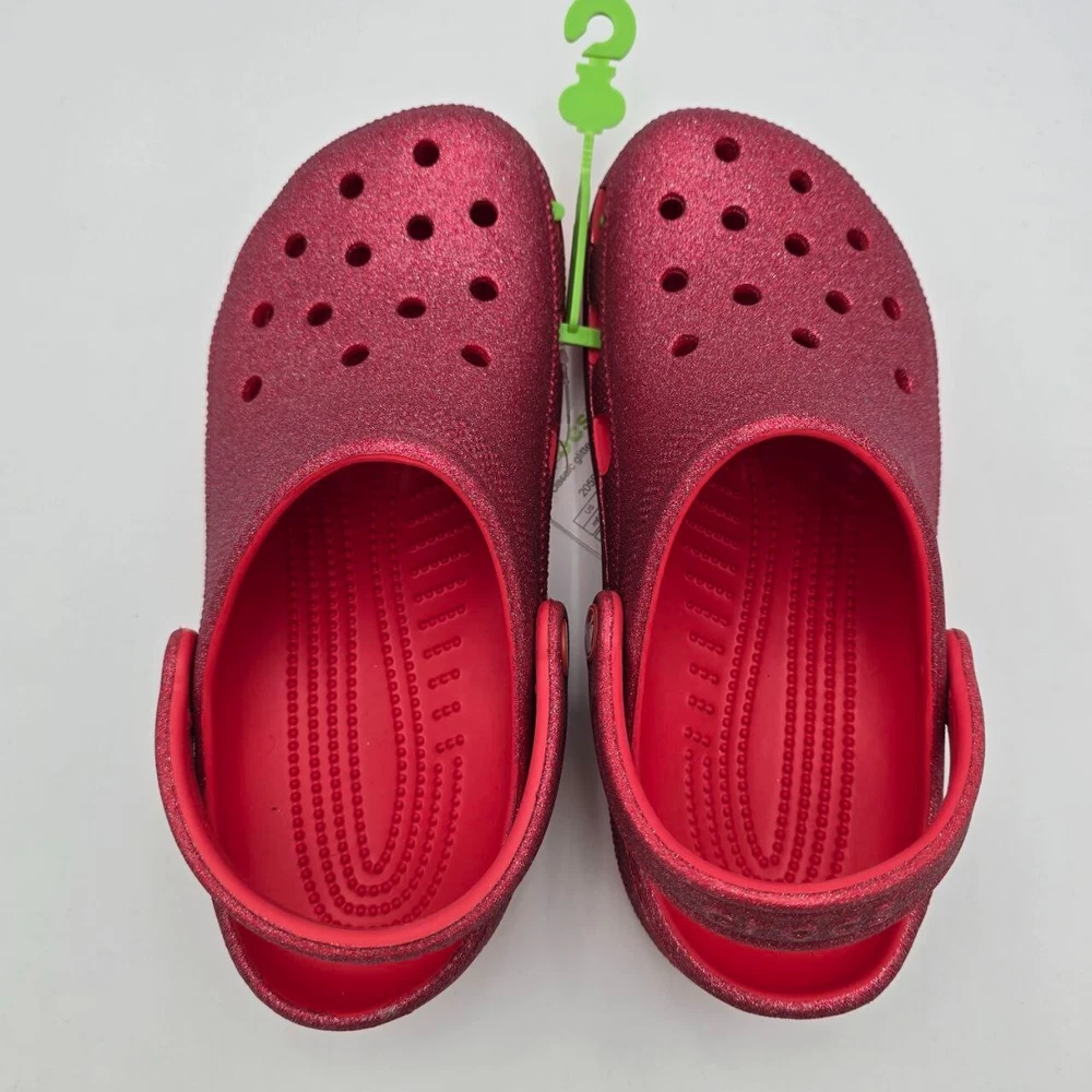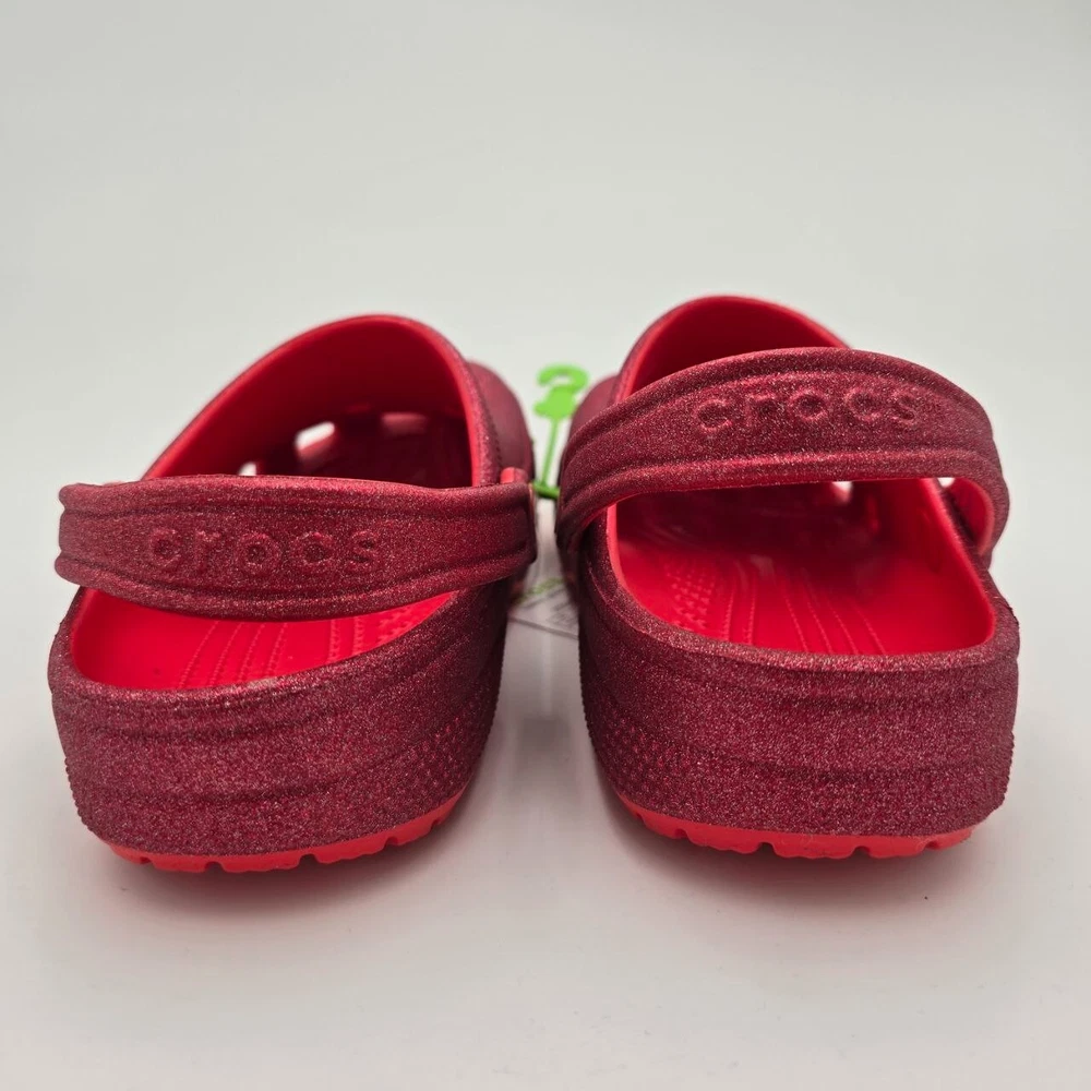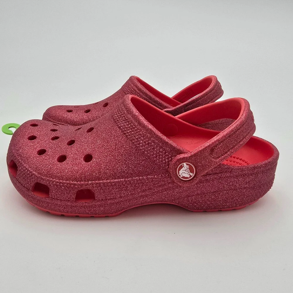Uncover the joy of everyday comfort with the Crocs Classic Glitter Clogs, a perfect blend of style and ease for the modern woman. These clogs feature a vibrant red sparkle synthetic upper material that adds a shimmering touch to your casual ensemble. Designed with a practical round toe and a convenient slip-on closure, they offer an effortless fit for an on-the-go lifestyle. From the beach to the classroom, these versatile sandals support a range of activities with their lightweight and cushioned features. The durable synthetic lining and outsole ensure breathability and longevity, making them suitable for walking, school, or any casual outing. With a flat heel that promises all-day comfort and a standard shoe width for a snug fit, these clogs are an essential addition to your footwear collection.