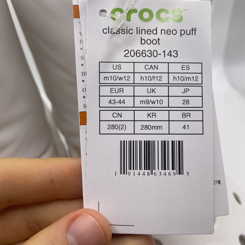 Type:Casualgtin13:0191448634695Model:Crocs NeoDepartment:Unisex AdultsFeatures:LinedSeason:Fall, WinterBrand:CrocsUPC:0191448634695Upper Material:SyntheticOccasion:Activewear, CasualColor:WhiteUS Shoe Size:Mens 10, Womens 12Seller Notes:“Size Men 10 Women 12. Box has damage, see pics for details”Style:Clog