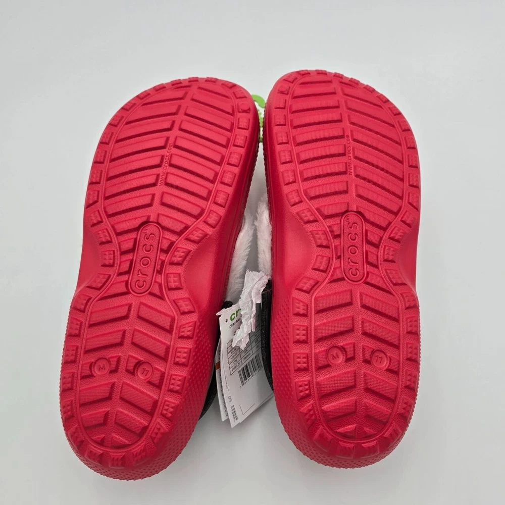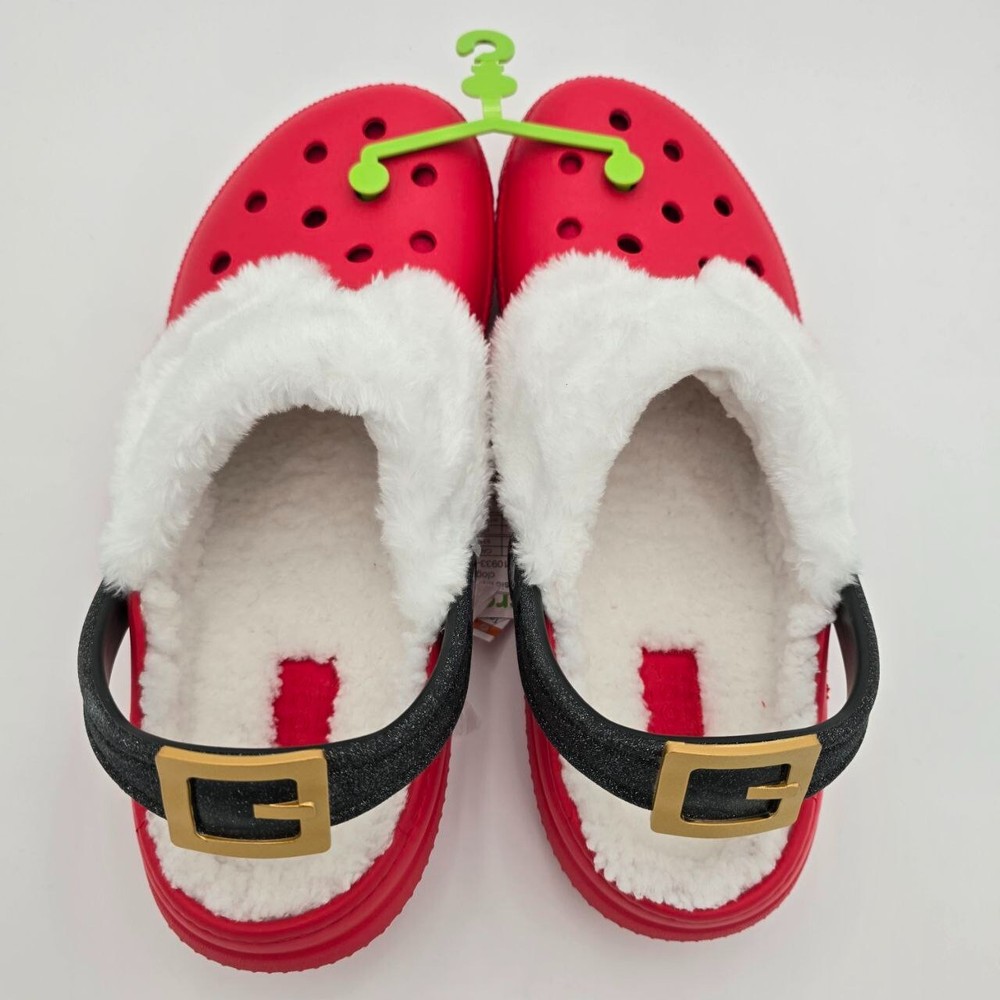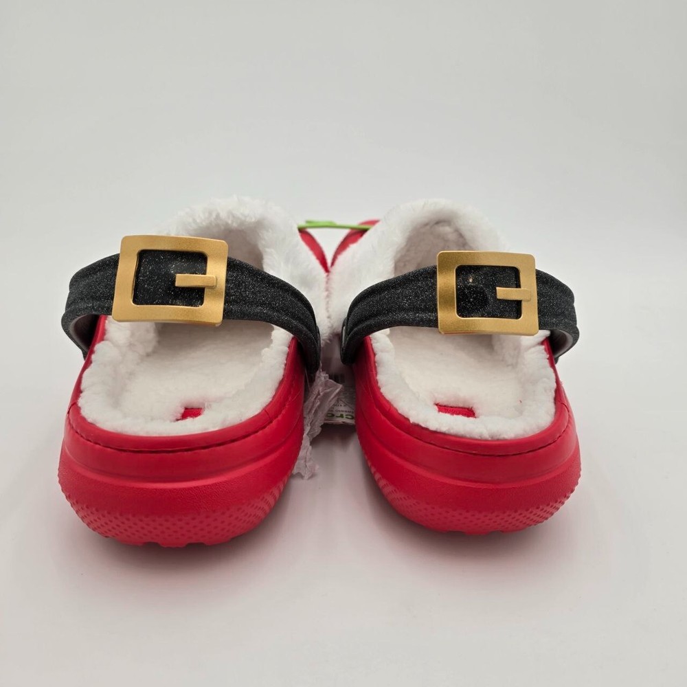 These Crocs Classic Lined Santa Clogs are designed for men in size 11 with a festive red color perfect for the Christmas holiday. Featuring a slip-on style with a round toe shape, they are adorned with a Santa Claus character theme, making them ideal for casual wear. The clogs are lined with faux fur for added warmth and comfort, and the synthetic outsole provides durability while being lightweight and breathable, making them suitable for winter and fall seasons. Perfect for travel or everyday wear, these Crocs offer cushioned support and a standard shoe width for a comfortable fit.