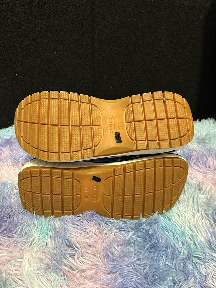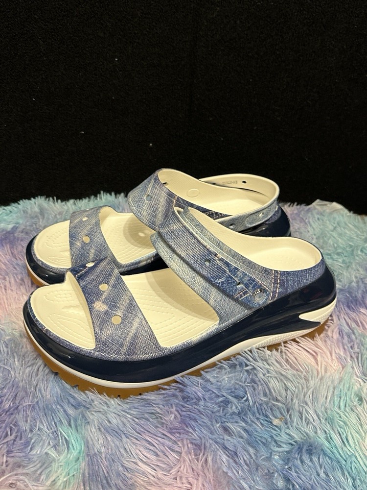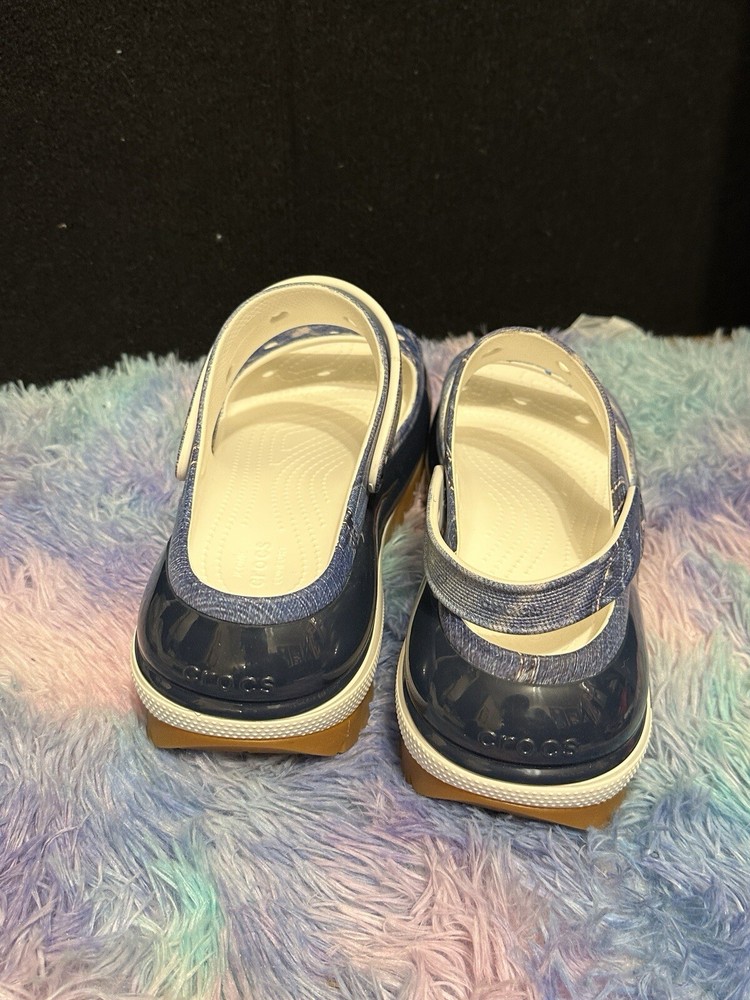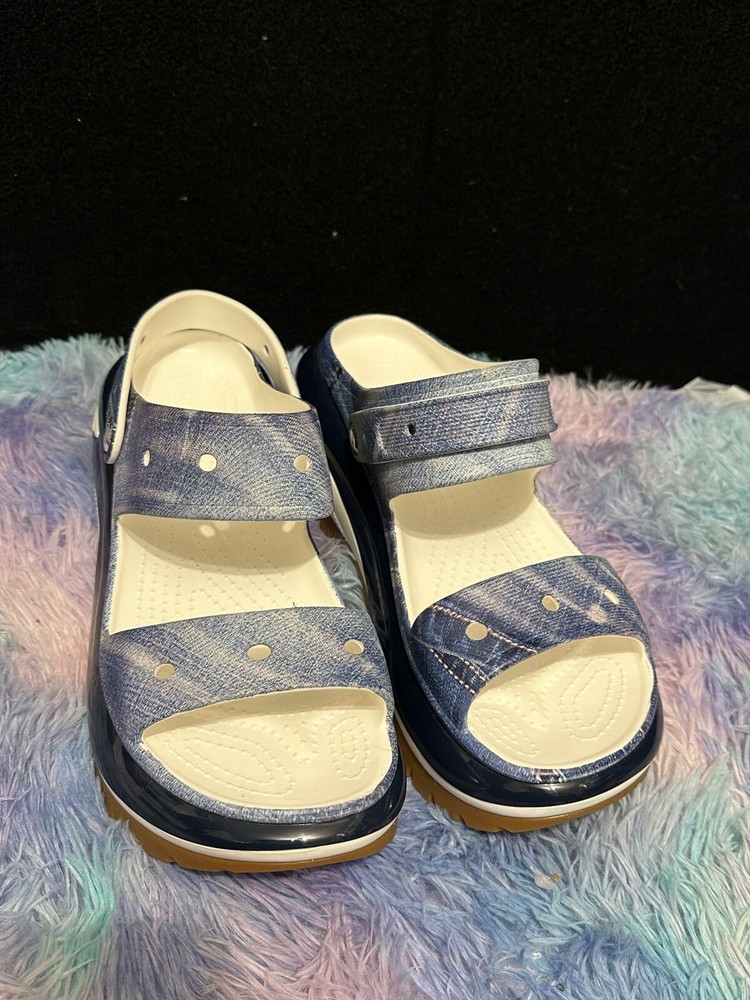 Like new condition Step into comfort and style with the NEW Crocs Classic Mega Crush Platform in Denim Blue. These unisex clogs are perfect for anyone looking for a relaxed and stylish look. The adjustable strap and buckle closure ensure a secure fit, while the breathable and slip-resistant features make them ideal for travel, activewear, and casual occasions. The rubber upper and outsole material provide a durable and comfortable feel, with a synthetic insole for added support. These sandals are perfect for any season, and the blue color adds a pop of personality to any outfit. Get your hands on these must-have Crocs today!