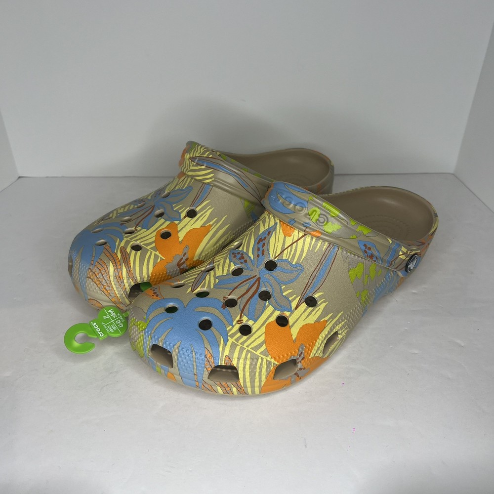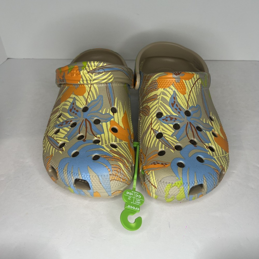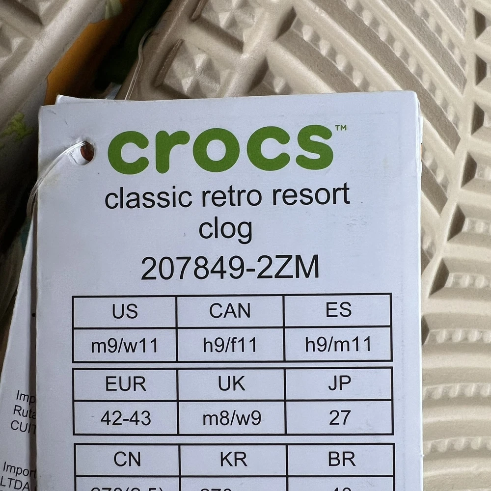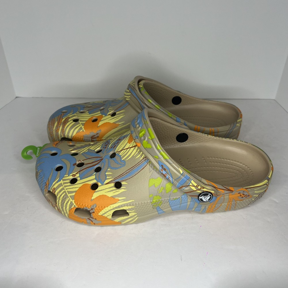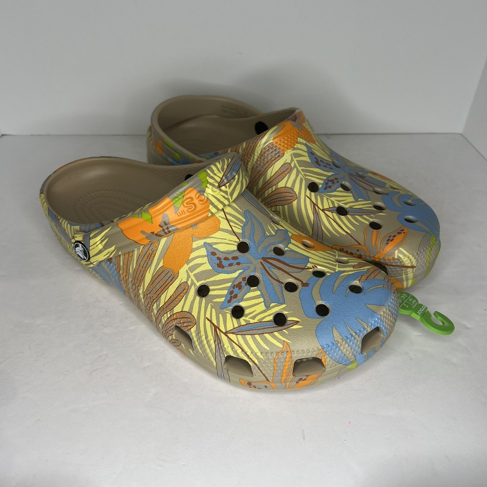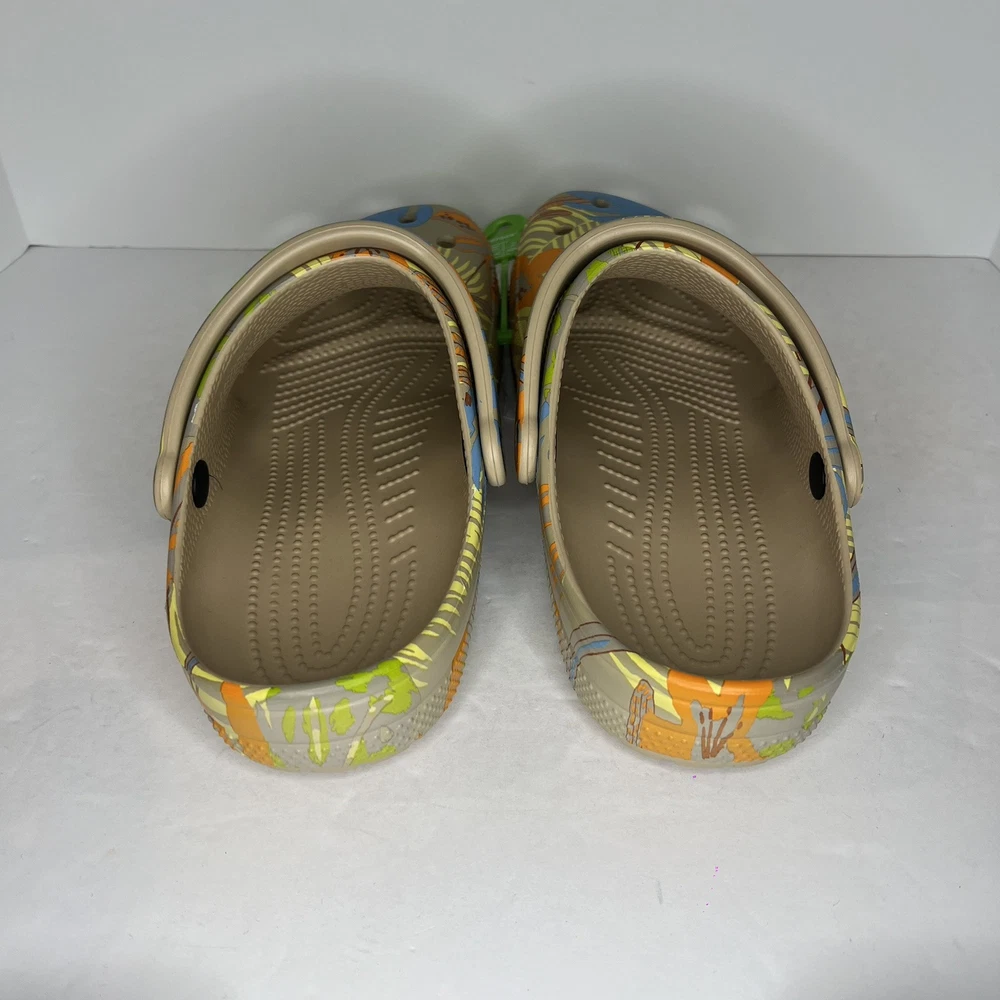 Crocs Classic Retro Resort Clog in a multicolor print, featuring a rubber upper material. This style is designed for women in US shoe size 11 (men's size 9) and falls under the Casual category. The model number is Crocs 207849, combining classic and retro themes for a stylish look.