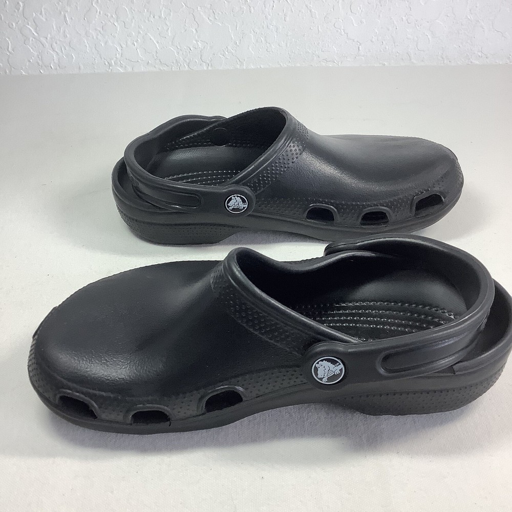 Crocs Crocband Men/Women Size 5/7 Water Rain Shoes Sandals Slide Black Rubber Solid Black Crocs Pre-owned. Clean, washed and ready to wear. No major flaws detected. - Slide Black Rubber - Slip on - Men’s 5 Women’s 7 - See all pics for any wear. no rips or tears -Please inspect photos to approve condition. - From Smoke Free Environment - Item shown is the exact item you will receive. -Open to offers -FAST SHIPPING **SHIPS FROM FLORIDA :) Sandals, classic, black, Crocs,