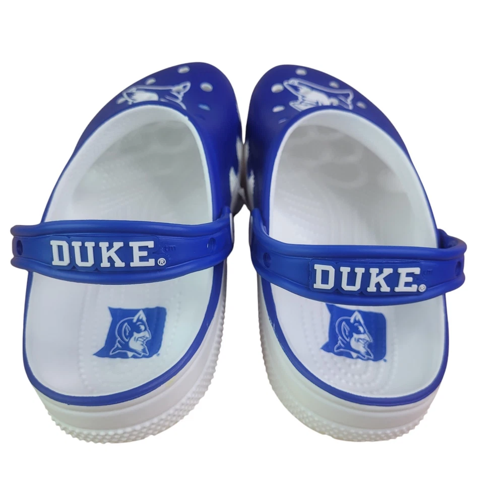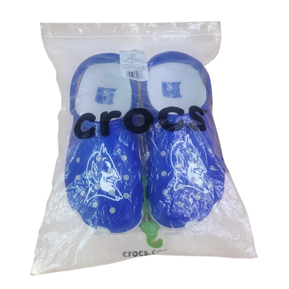 Crocs Duke University Classic Clogs Size Men's 8 Womens 10 (New In Original Bag) This is a pair of Crocs Duke University Classic Clogs in white, designed for both men and women in size Men's 8/Women's 10. These slip-on casual shoes feature a lightweight and breathable EVA upper material, a rubber outsole for comfort and durability, and a standard shoe width. The Crocs brand is known for its comfortable and versatile footwear, making these clogs a stylish and practical choice for everyday wear.