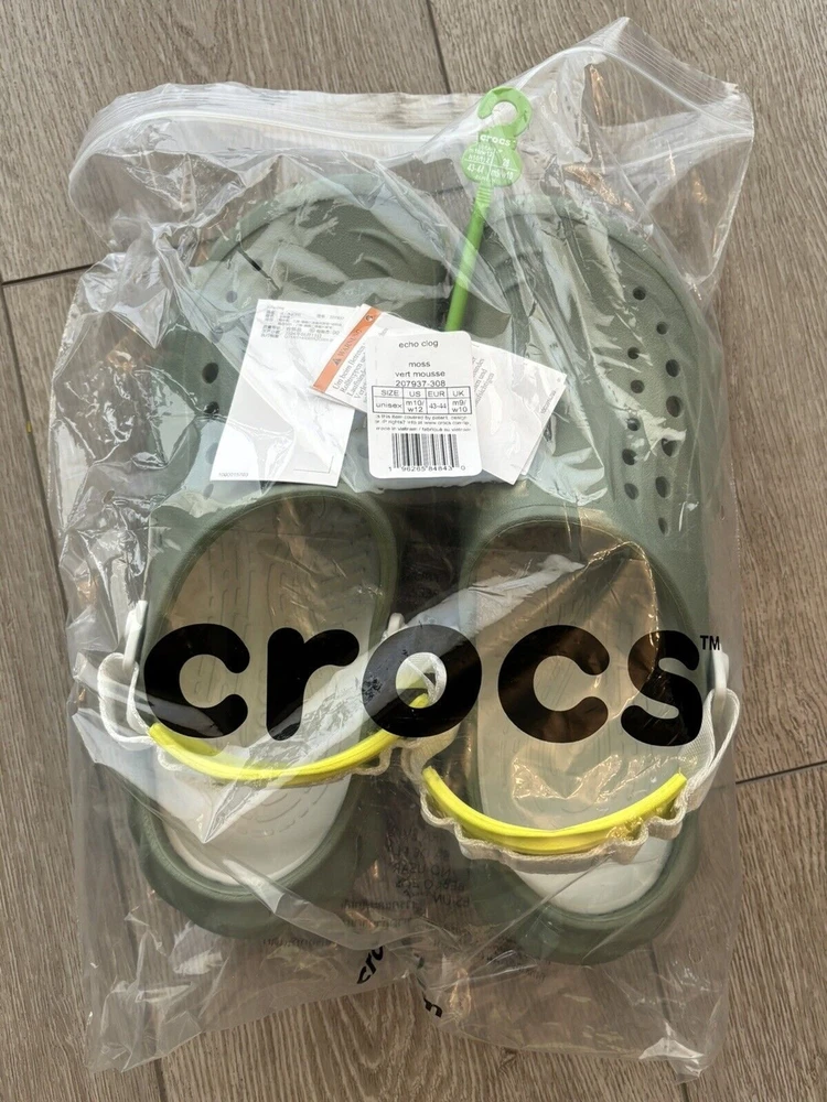 EU Shoe Size:43Occasion:Activewear, Casual, TravelDepartment:MenColor:GreenInsole Material:SyntheticAccents:LogoStyle Code:207937-308US Shoe Size:10Country/Region of Manufacture:ChinaClosure:Slip OnCharacter:Echo ClogsLining Material:SyntheticUK Shoe Size:9Product Line:Crocs Echo Clogs AloeSeason:Fall, Spring, Summer, WinterCustomized:NoVintage:NoUpper Material:SyntheticOutsole Material:SyntheticShoe Width:StandardPattern:SolidTheme:Going Out, Outdoor, Casual, EchoStyle:Slip-OnMPN:207937-308Brand:CROCSFeatures:Adjustable Strap, Ankle Strap, Breathable, Comfort, Lightweight, Motion Control, Water Resistant, Fully molded Croslite upper and foundation, Water-friendly and buoyant, Ventilation ports, Heel pad on back strap for extra comfort, Dual density support with Croslite sole and LiteRide Footbed, Customizable with Jibbitz charms, Easy to clean, quick to dryType:CasualManufacturer Color:Moss GreenModel:Crocs Echo Clogs Aloe