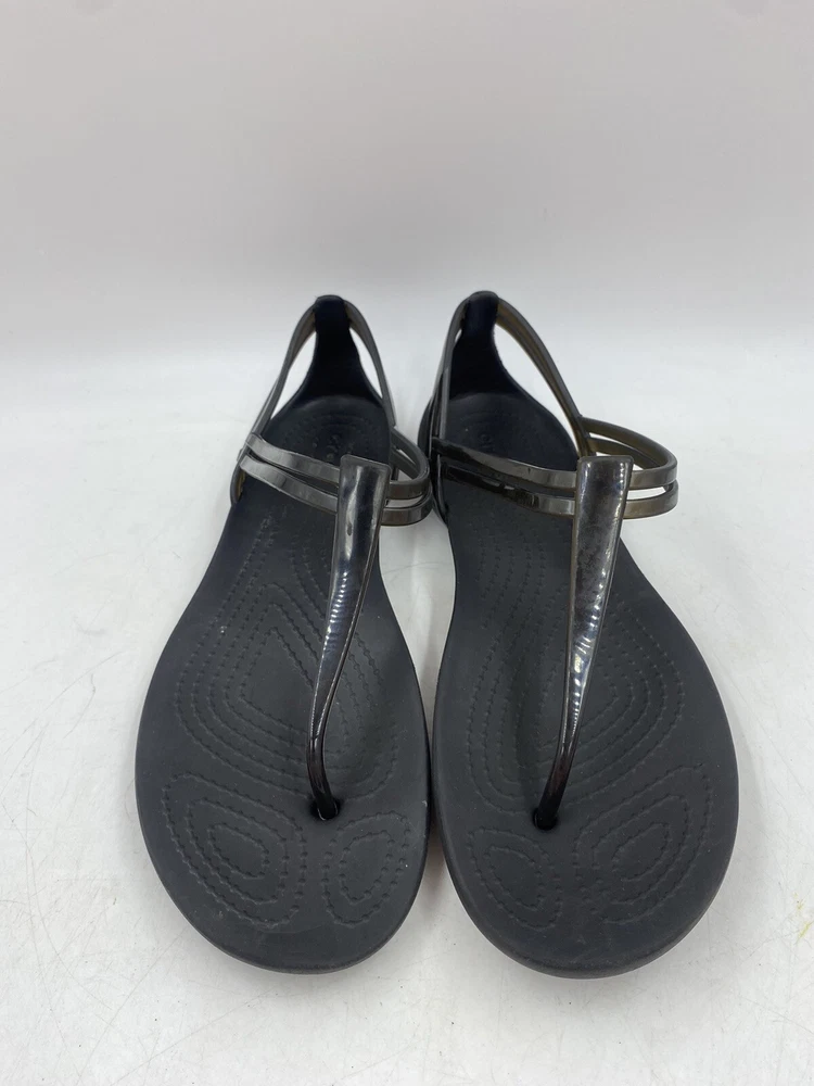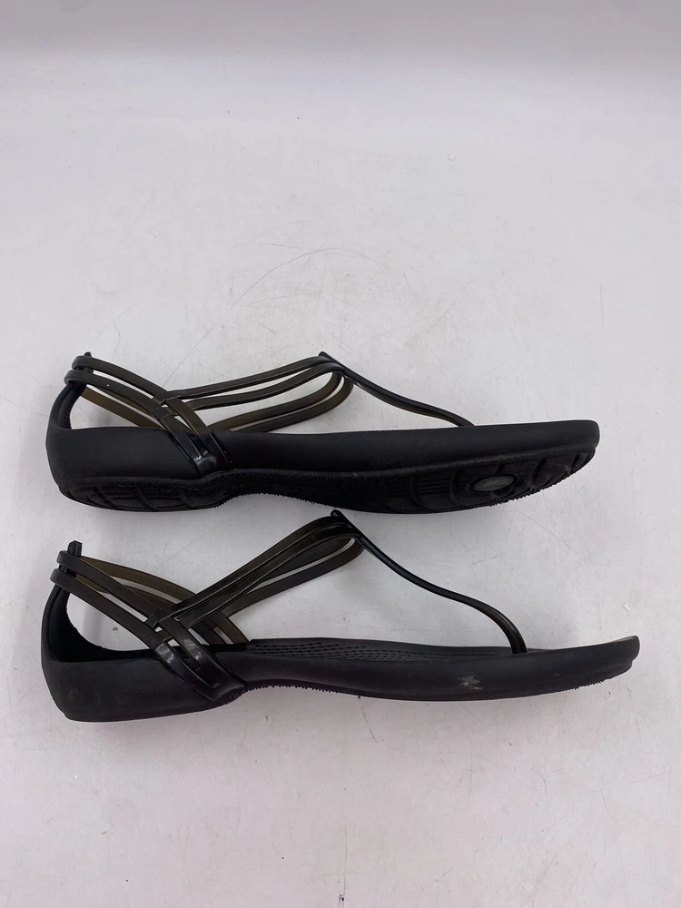 This is a pair of black Crocs Isabella t strap sandals. They are a women's size 6 and are in good overall condition with normal signs of wear. They could have light scuffs or sole wear. You get the actual items pictured so please look at all photos and ask any questions before purchase.