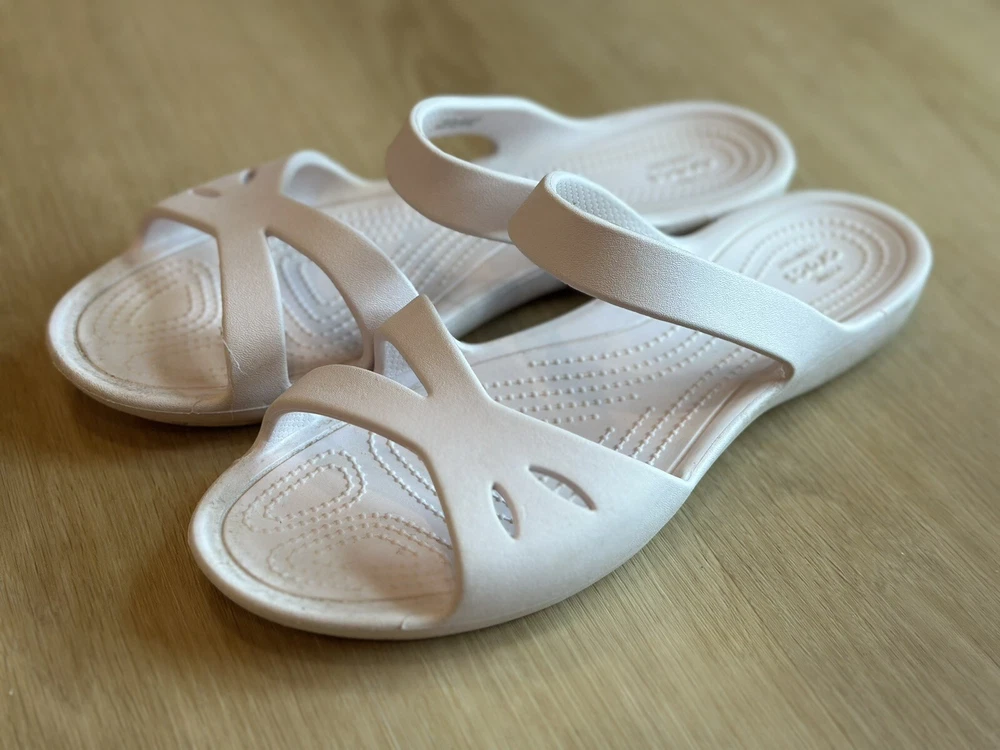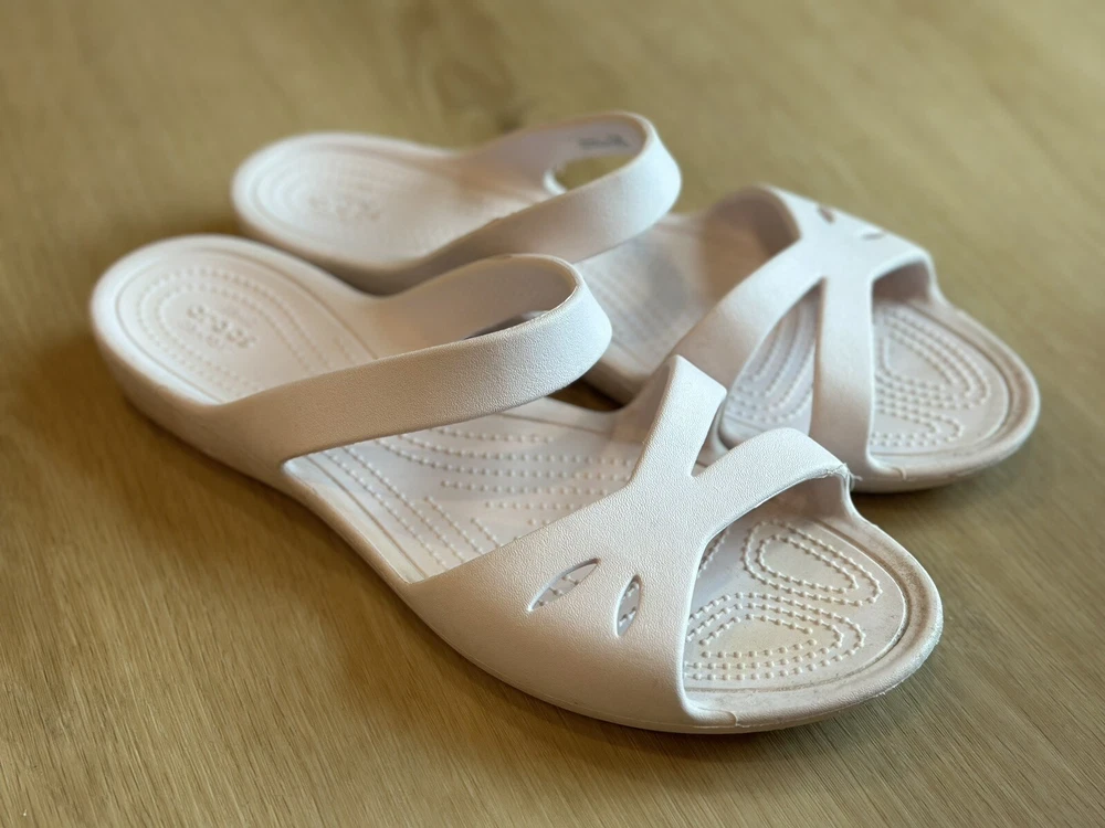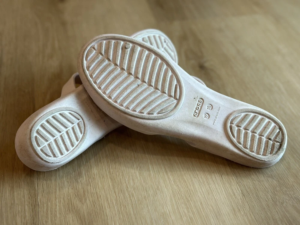 Step into summer with these Crocs Kelli sandals in white. These slip-on sandals feature a flat heel, making them perfect for casual occasions. The rubber outsole provides durability, while the lightweight and breathable design ensures maximum comfort. The Crocs Kelli sandals also come with a stylish logo accent, adding a touch of flair to your outfit. These sandals are available in US size 10 and UK size 8, with an EU size of 41. The upper material is also made of rubber, while the insole is also designed with breathability in mind. Whether you're running errands or going to the beach, these Crocs Kelli sandals are the perfect addition to your wardrobe.