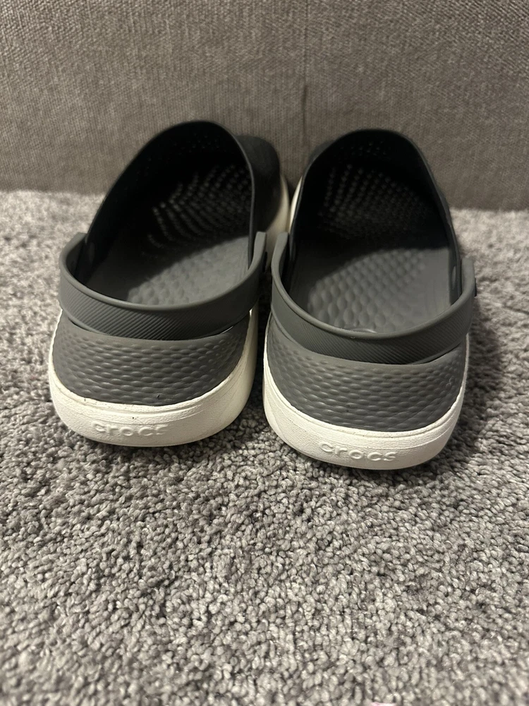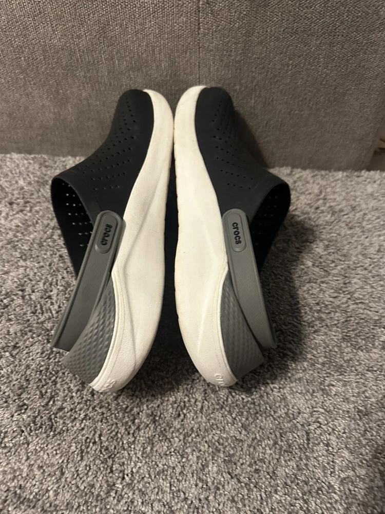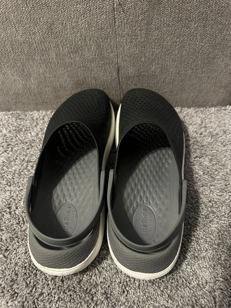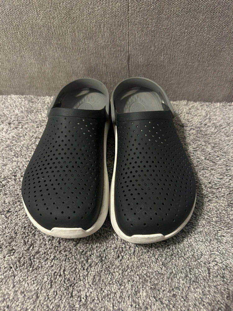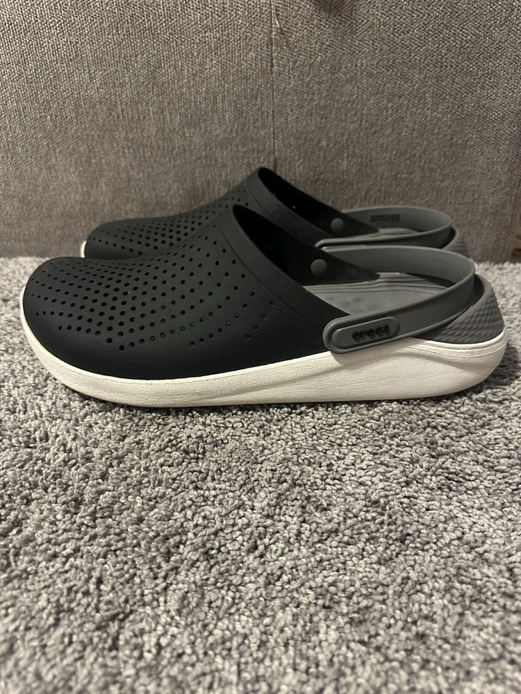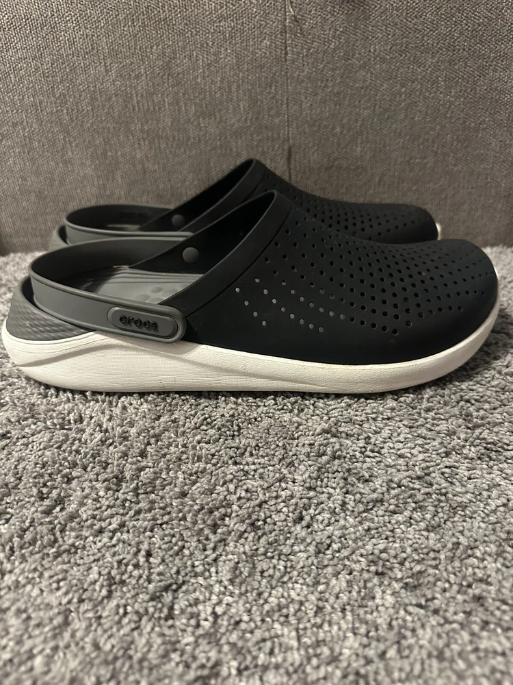 Crocs Literide Men's Black Slip On Clogs in size 12. Featuring a solid black color, slip-on design, with a comfortable rubber outsole and breathable synthetic lining. These casual clogs by Crocs have a logo accent, M width, and are part of the Literide product line, perfect for everyday wear. Preowned Good condition