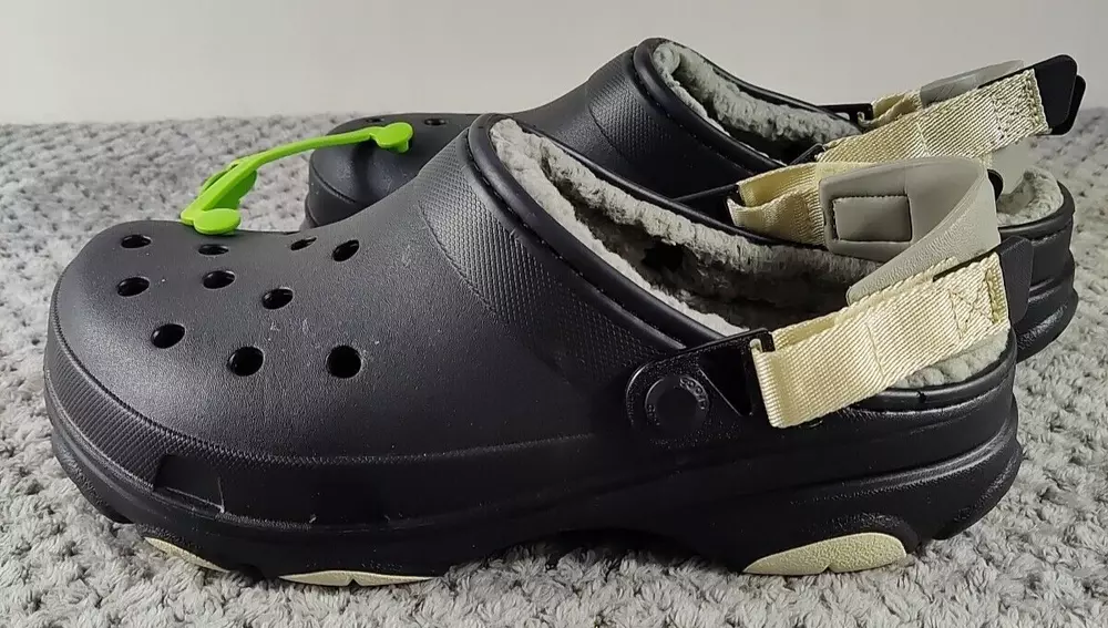 Crocs All-Terrain Lined Clogs for Men - Black - 8M Take your walking comfort off-road! The Crocs™ All-Terrain Lined Clogs for Men are specifically built with rugged lug outsoles and aggressive tread patterns, so you can enjoy sure-footed traction wherever your outdoor adventure takes you. Plus, these outsoles offer comforting foot support, and they deliver the Iconic Crocs Comfort – a lightweight, flexible, soft-as-air feel you've come to know and love. Up top, Croslite™ foam uppers offer foot protection and a classic Crocs look. Inside, synthetic fleece linings offer a soft comfort that's perfect for socks or bare feet. Ventilation ports encourage breathability, cooling airflow, and they drain water if that's ever needed. Easily adjustable heel straps create a customizable and snug fit. These men's Crocs are easy to clean and quick to dry. Imported. Manufacturer style #: 207936. Iconic Crocs Comfort lightweight, flexible, soft-as-air feel Croslite foam uppers Synthetic fleece linings Ventilation ports keep feet cool Adjustable heel straps Outsoles feature lug outsoles and aggressive tread