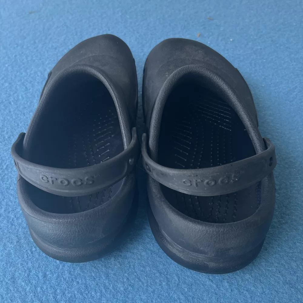 Soles are almost complete, and shoe is in very nice condition. As a wearer of these type of shoes, I can state that not all crocs fit the same. That being said, I can say that this pair runs on the smaller side and would not be suitable for wide feet. They could also use a little armor all to shine them up a bit. 00g9w9s9x.50
