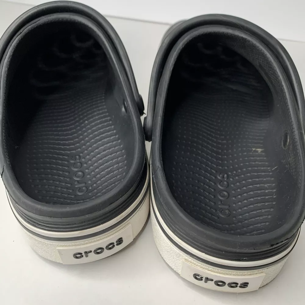 These are Crocs Off Court clogs in black, size 9 for women (size 7 for men). They are slip-on sandals with a low heel height, featuring a logo accent and ankle strap for comfort. The shoes are lightweight and suitable for travel, activewear, or casual occasions, with a rubber outsole and synthetic lining and upper material. Perfect for outdoor activities in all seasons.