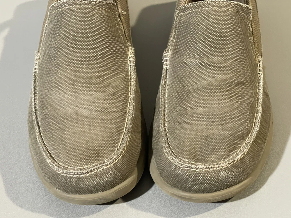 The Crocs Shoes Men's Size 14 Slip-On Canvas Comfort Loafer Shoe is designed for casual wear and offers a comfortable fit. The shoe features a solid beige canvas upper with a round toe shape and slip-on closure for easy wearing. Ideal for travel, activewear, or everyday casual use, this Crocs shoe is crafted with a fabric lining, rubber insole, and a comfortable design that is suitable for summer, fall, and spring seasons. Perfect for men looking for a versatile and easy-to-wear shoe option.