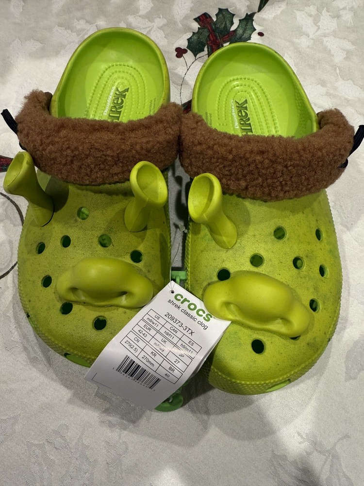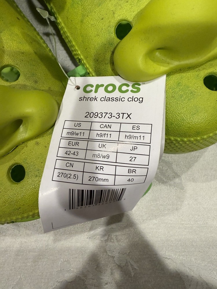 Crocs Shrek Classic Clog in green, featuring a Shrek character theme from the Dreamworks movie. This slip-on clog is designed for men in size 9 and women in size 11. Made with synthetic upper material, it is a casual shoe with a unique and playful design inspired by the popular animated film. One of the antennas is broken as shown in the pictures, it could easily be fixed with a bit of super glue. Please only order if you are okay with that. Message me with any questions