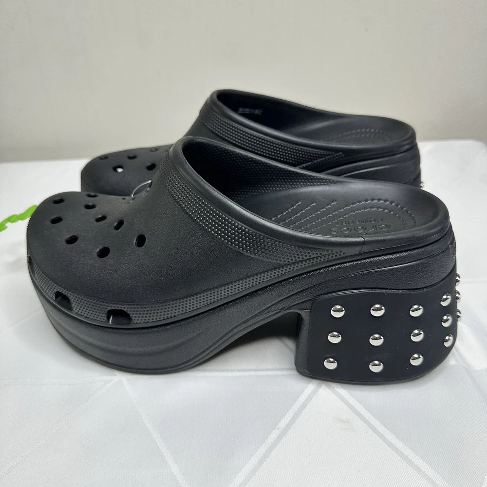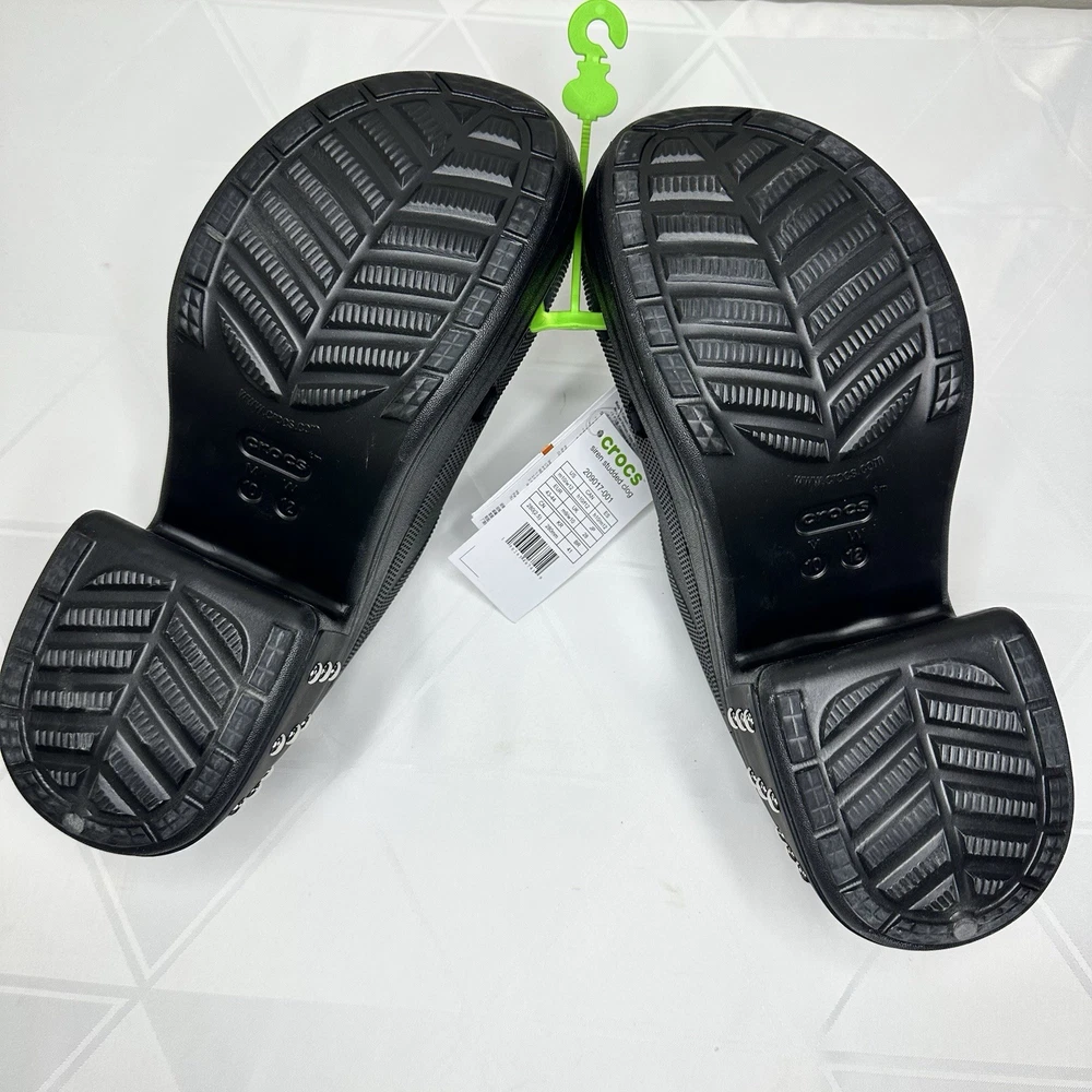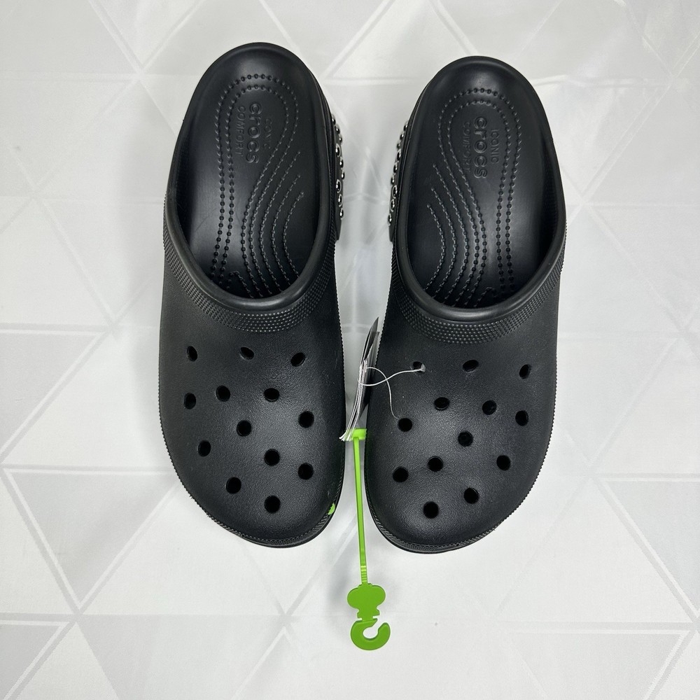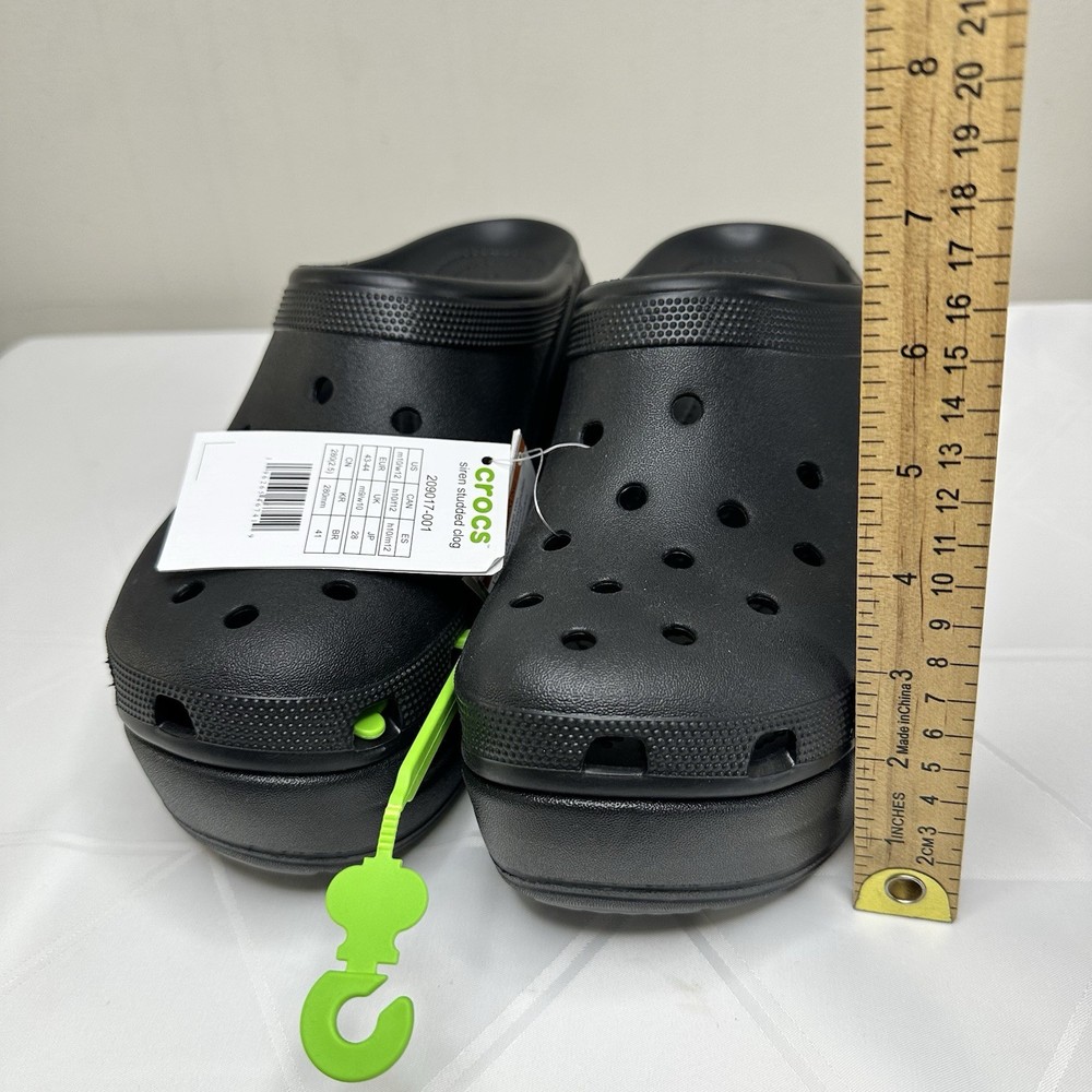 Crocs Siren Studded Unisex Adult Clog Size W12 / M10 Black 209017-001 New No one can resist the Siren. Indulgent, alluring and uncompromising, this silhouette is ready for a night out. This true high heel style with a sleek look and feel brings a feminine spin to the Classic with comfort that keeps you on your feet through the wee hours. -Sole material Resin -Outer material Resin -Closure type Pull-On -Water resistance level Water Resistant • Molded TPU heel cup • Ventilation ports add breathability and help shed water and debris • Easy to clean and quick to dry • Lightweight and flexible with 360 degree comfort and Iconic Crocs Comfort For full details and description, please refer to the pictures. All measurements are approximate and lighting may vary on pictures. Please ask any questions before purchasing. I answer most questions instantly! Reasonable offers considered. FAST SHIPPING! #1037