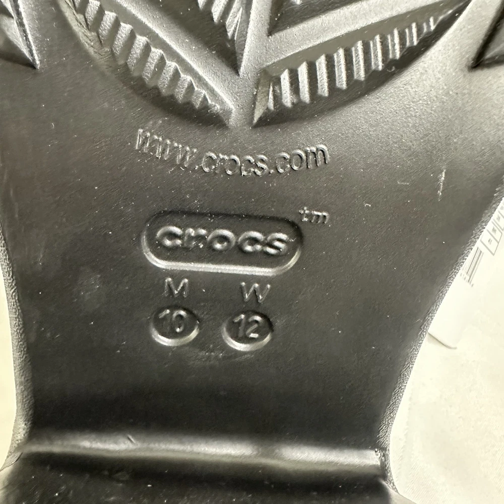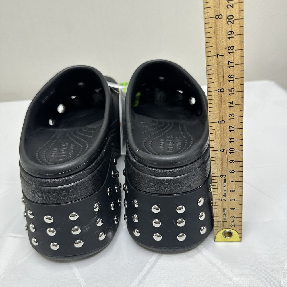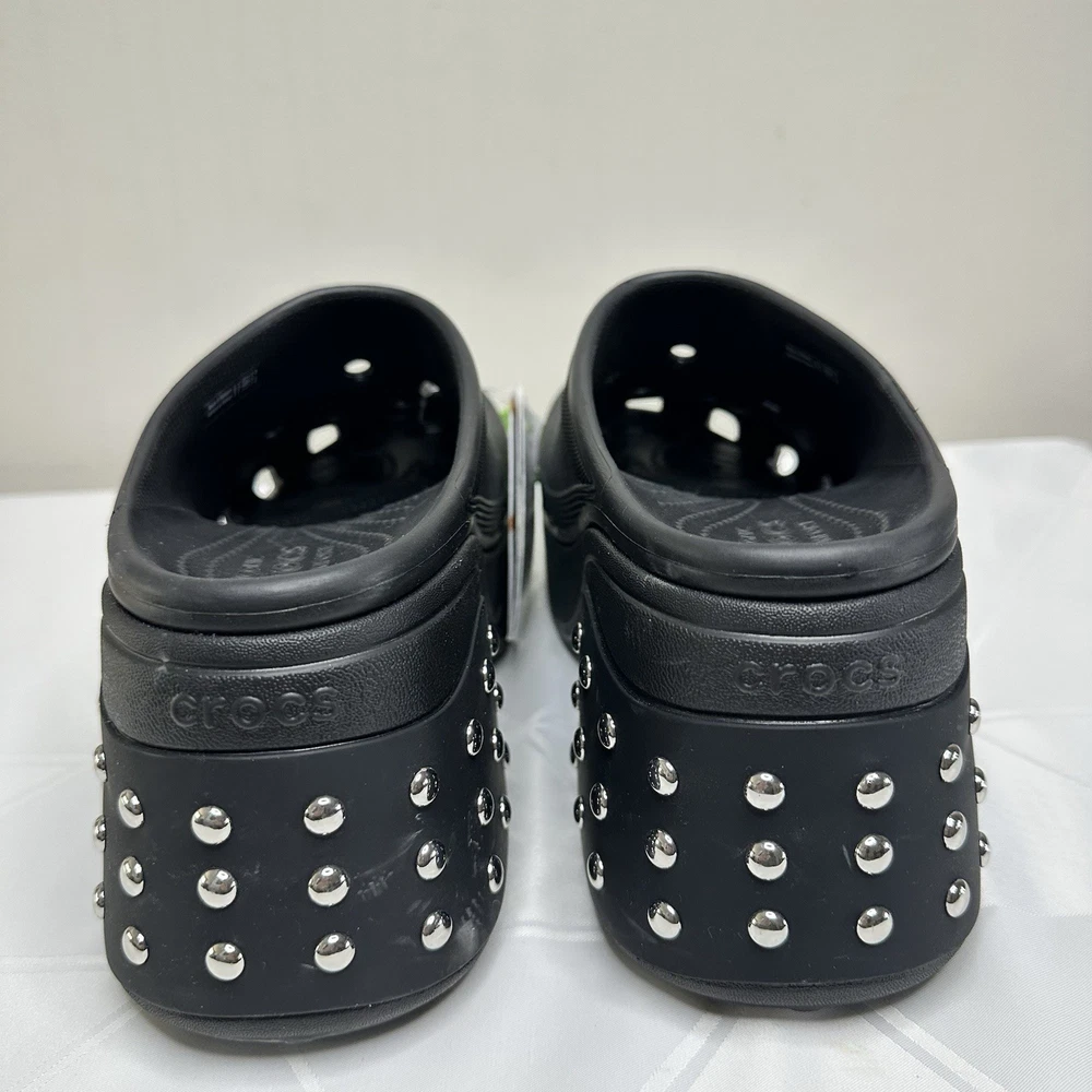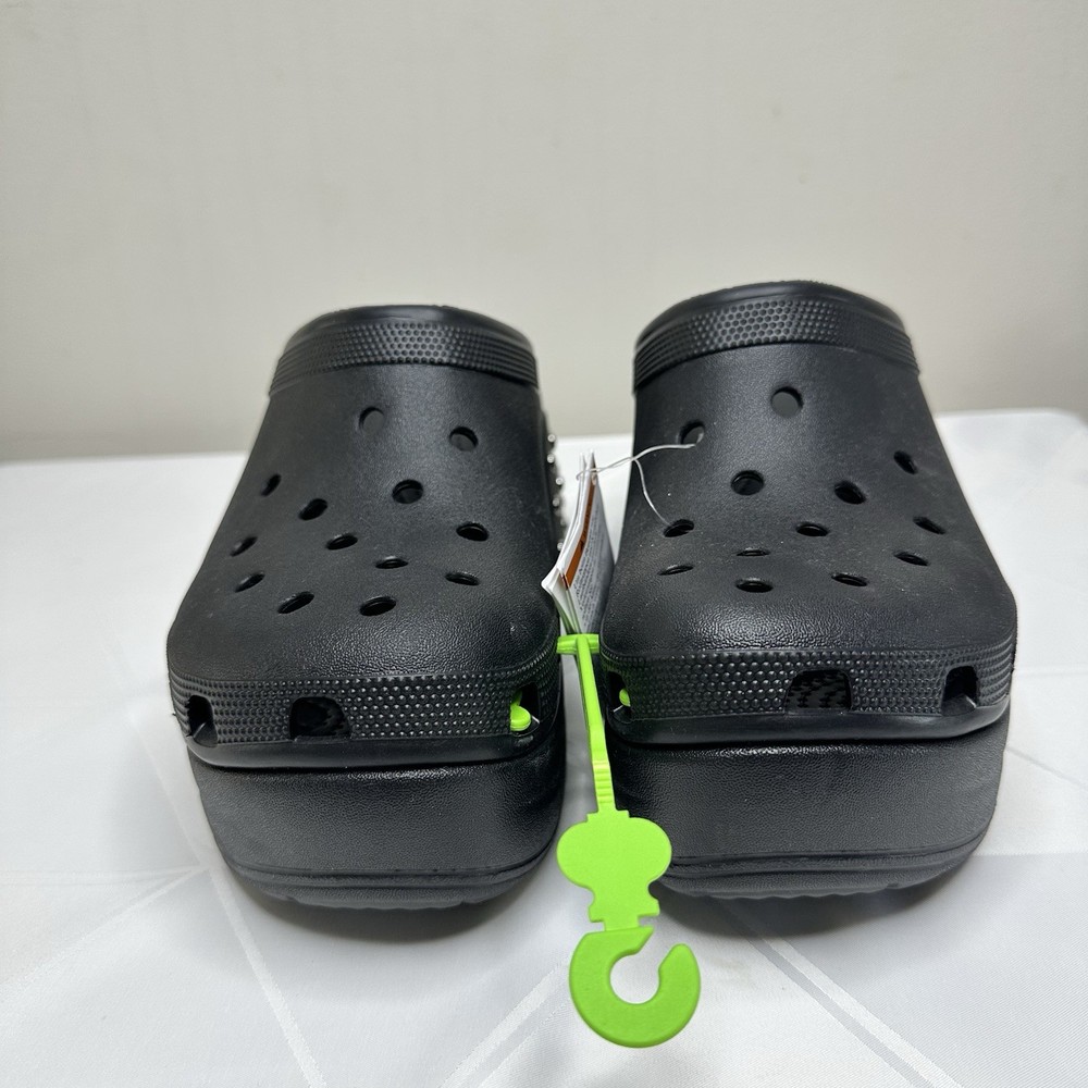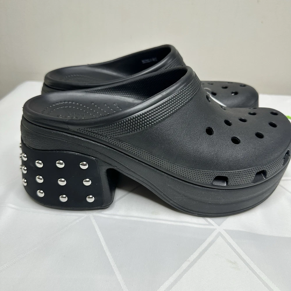 Crocs Siren Studded Unisex Adult Clog Size W12 / M10 Black 209017-001 New No one can resist the Siren. Indulgent, alluring and uncompromising, this silhouette is ready for a night out. This true high heel style with a sleek look and feel brings a feminine spin to the Classic with comfort that keeps you on your feet through the wee hours. -Sole material Resin -Outer material Resin -Closure type Pull-On -Water resistance level Water Resistant • Molded TPU heel cup • Ventilation ports add breathability and help shed water and debris • Easy to clean and quick to dry • Lightweight and flexible with 360 degree comfort and Iconic Crocs Comfort For full details and description, please refer to the pictures. All measurements are approximate and lighting may vary on pictures. Please ask any questions before purchasing. I answer most questions instantly! Reasonable offers considered. FAST SHIPPING! #1037