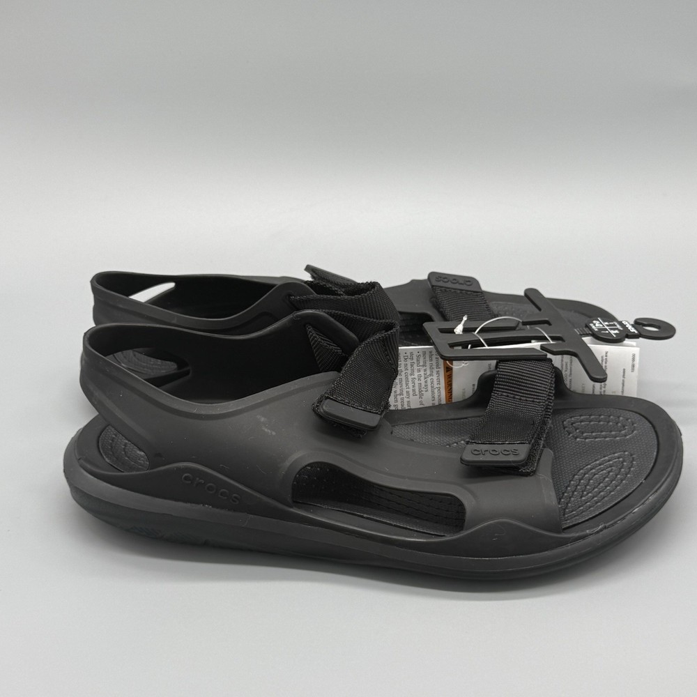 The Crocs Swiftwater Expedition Sandal M in Men's Size 8 is a versatile and comfortable slip-on sandal perfect for travel, casual wear, and work. With adjustable straps, cushioning, and a waterproof synthetic outsole, these sandals provide comfort and support for all-day wear. The black solid pattern and logo accents add a stylish touch to the lightweight and breathable design. Whether you're exploring the outdoors or running errands, these Crocs Swiftwater Expedition Sandals are a reliable choice for any season.
