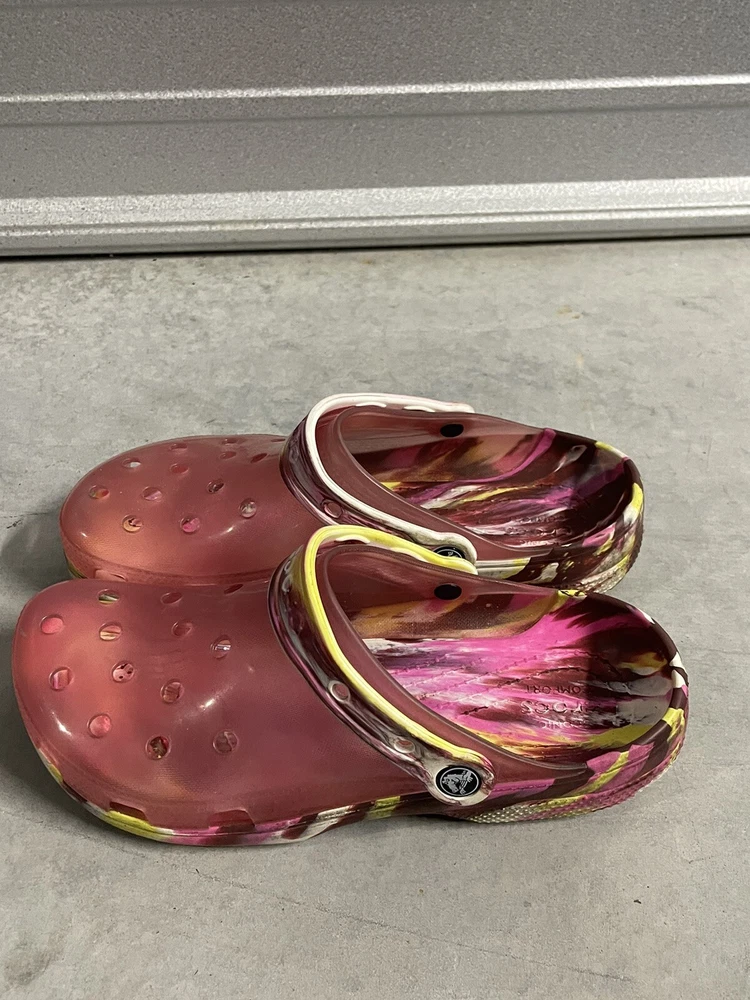 Toe Shape: Round Toe Pattern: Tie Dye Type: Casual Product Line: Comfort Slide Shoe Shaft Style: Low Top Insole Material: Synthetic Vintage: No gtin13: 196265136490 UPC: 196265136490 Model: translucent Accents: Logo, Strap Heel Height: Low (1-1.9 in) Closure: Slip On US Shoe Size: 10 Outsole Material: Synthetic Style: Clog Department: Women Handmade: No Performance/Activity: Beach, Driving, School, Typing, Walking Occasion: Activewear, Casual, Travel, Workwear Brand: Crocs Color: Pink Theme: Classic Lining Material: Synthetic Upper Material: Synthetic Heel Style: Flat Shoe Width: Standard Season: Fall, Spring, Summer, Winter Features: Comfort