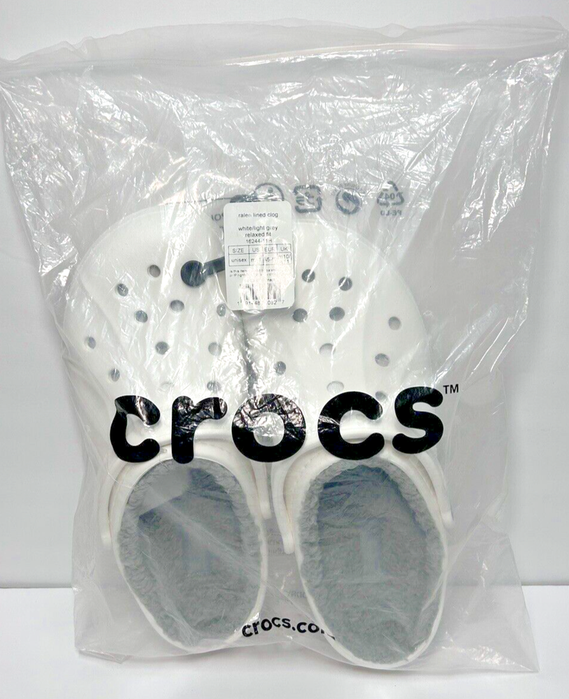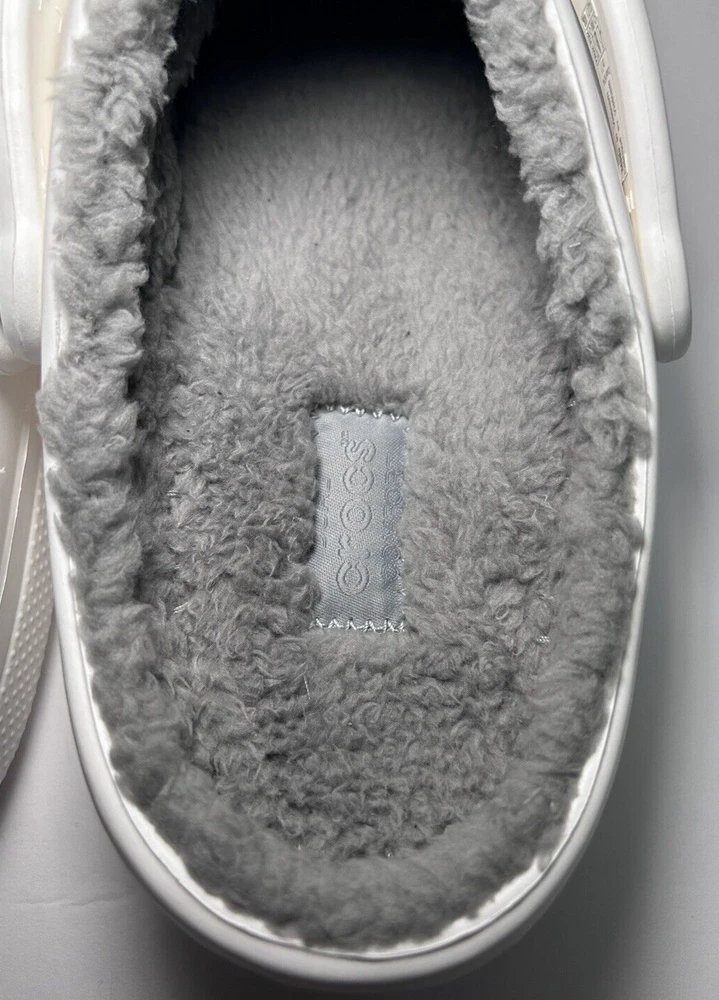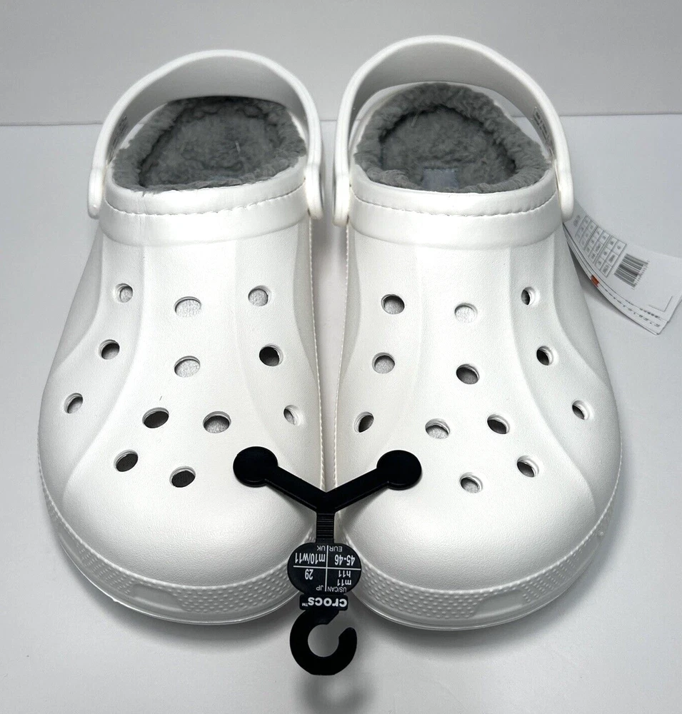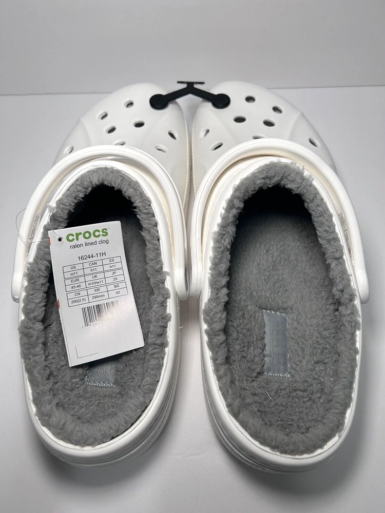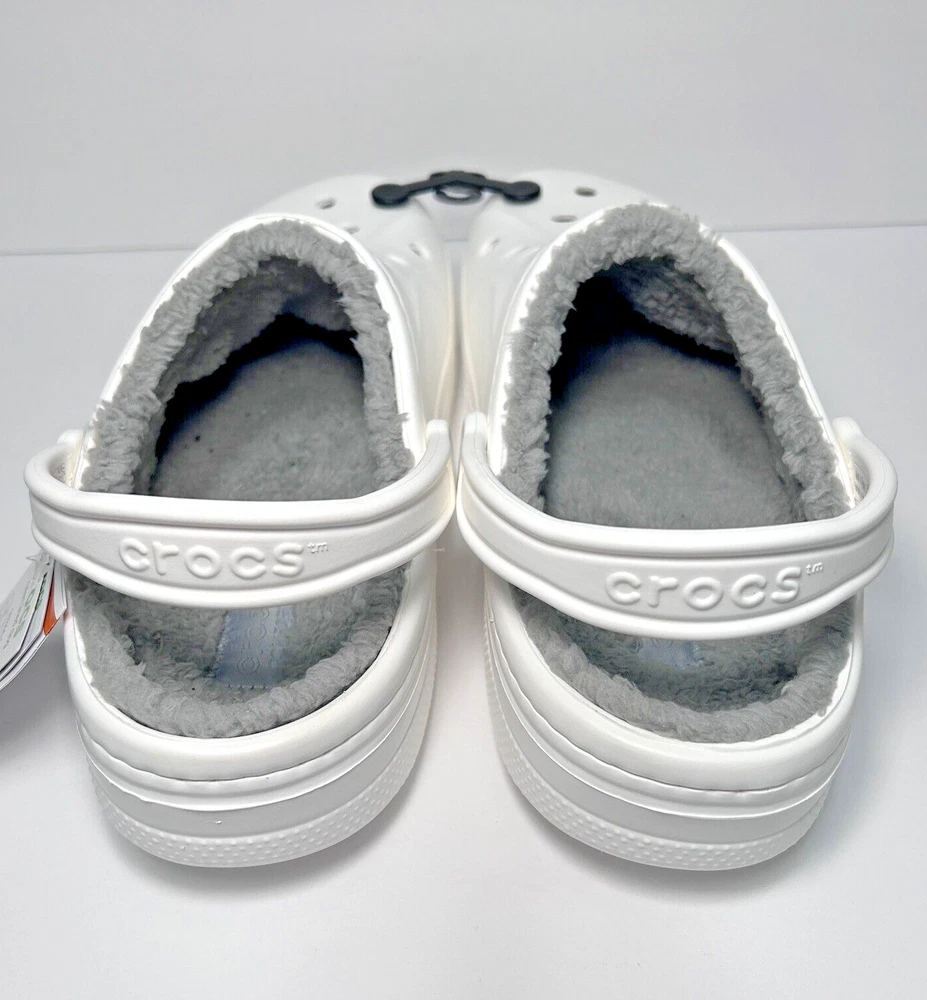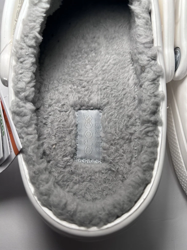 Designed to keep you warm on the go, the Crocs Adults' Classic Fuzz-Lined Clogs have soft polyester liners. These shoes use Dual Crocs Comfort™ to deliver increased cushioning and feature Croslite™ foam uppers for a lightweight design. BRAND NEW in Bag! White with light grey fuzzy lining Men’s Size 11 Women’s Size 13 *First two pictures are stock photos and not of product you will receive