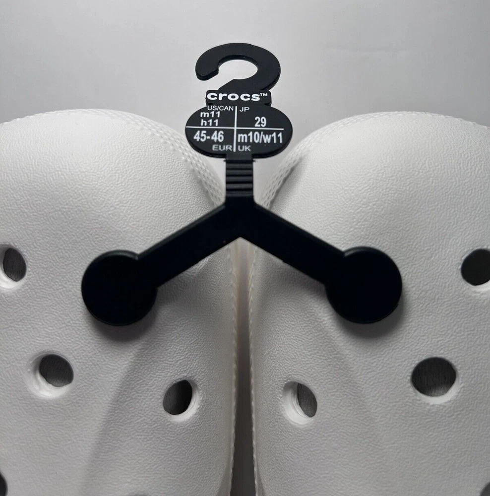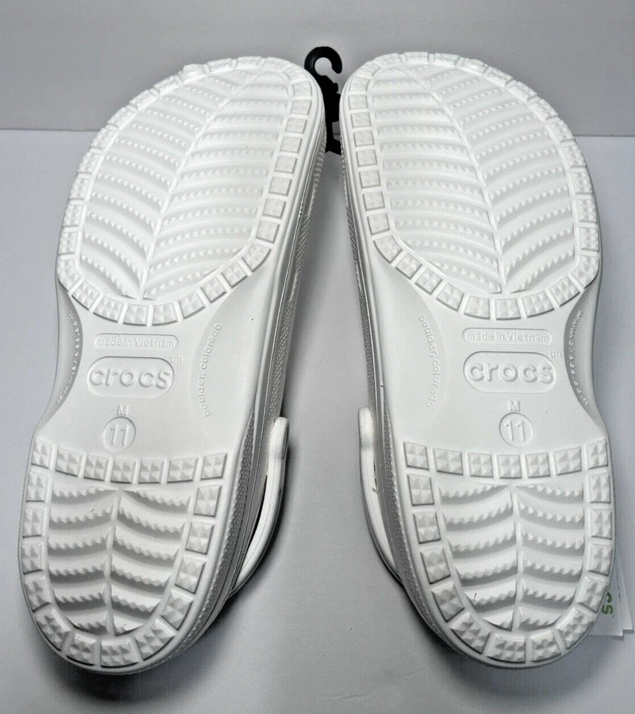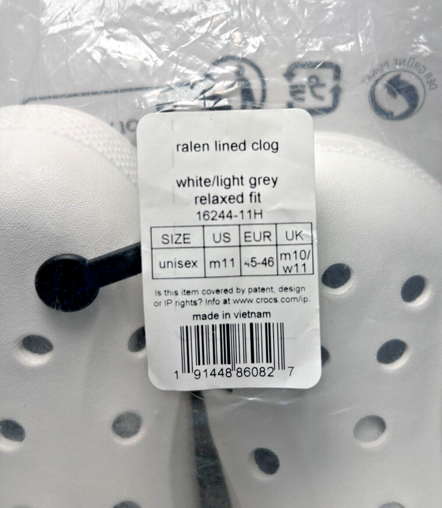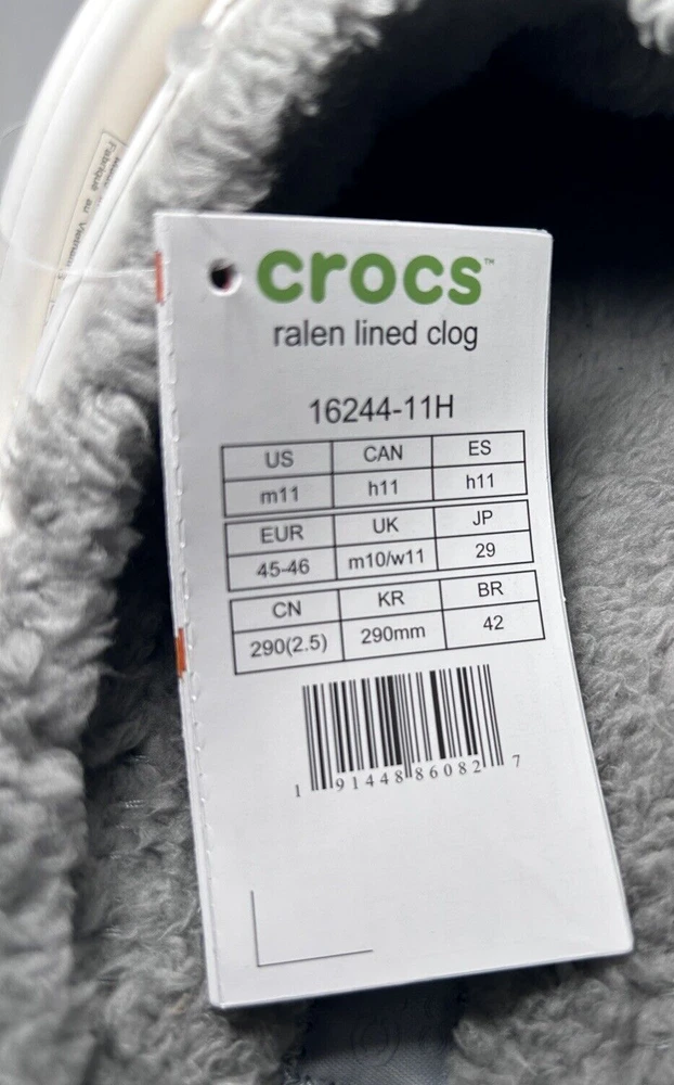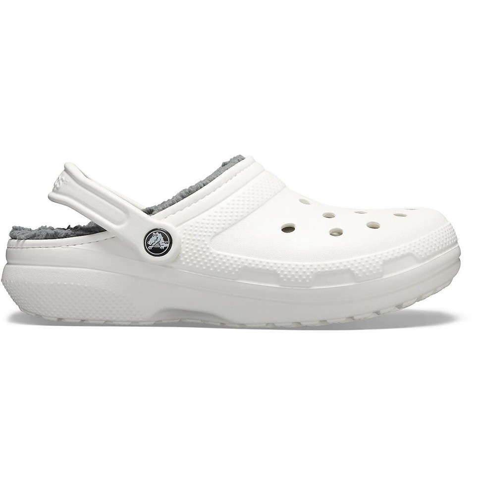 Designed to keep you warm on the go, the Crocs Adults' Classic Fuzz-Lined Clogs have soft polyester liners. These shoes use Dual Crocs Comfort™ to deliver increased cushioning and feature Croslite™ foam uppers for a lightweight design. BRAND NEW in Bag! White with light grey fuzzy lining Men’s Size 11 Women’s Size 13 *First two pictures are stock photos and not of product you will receive