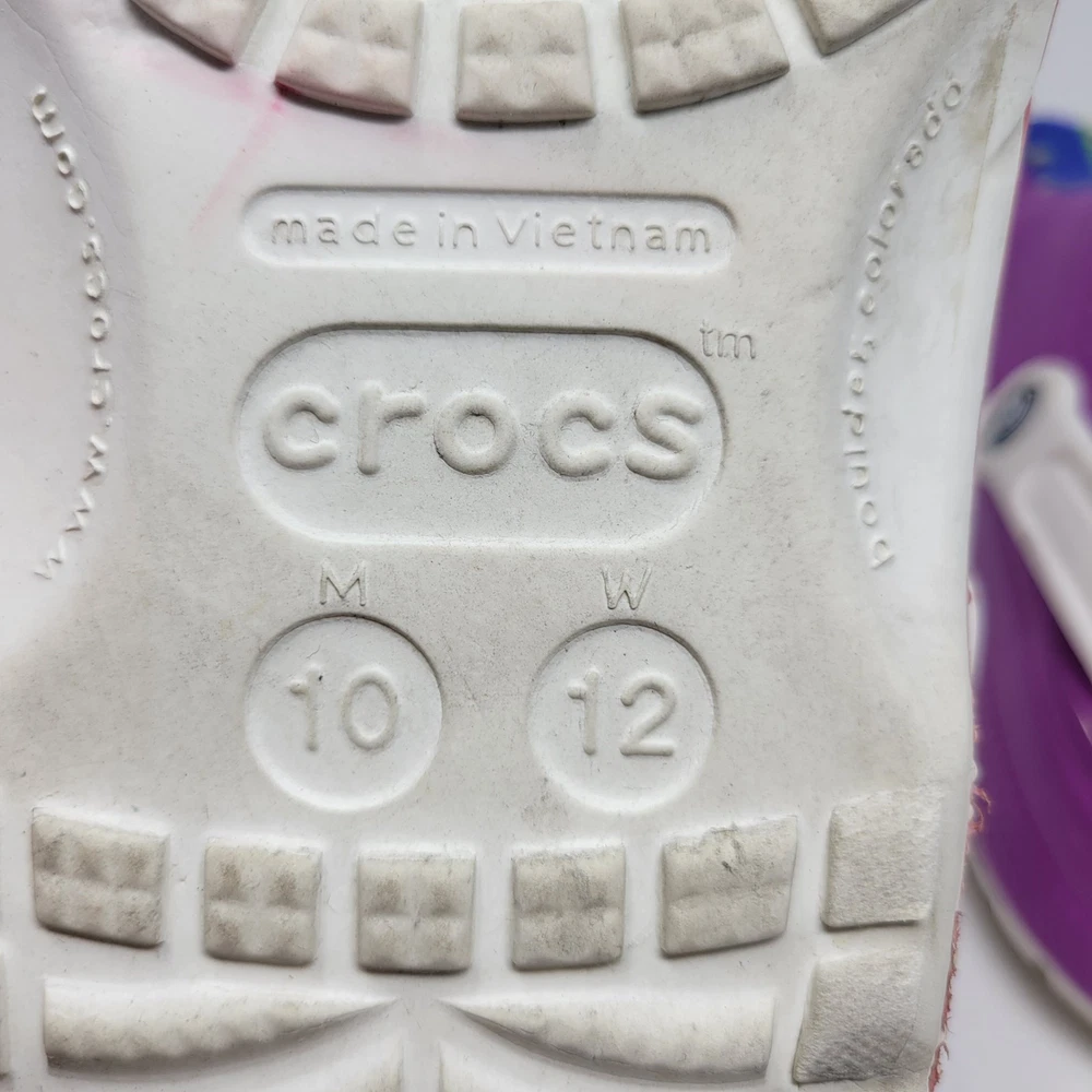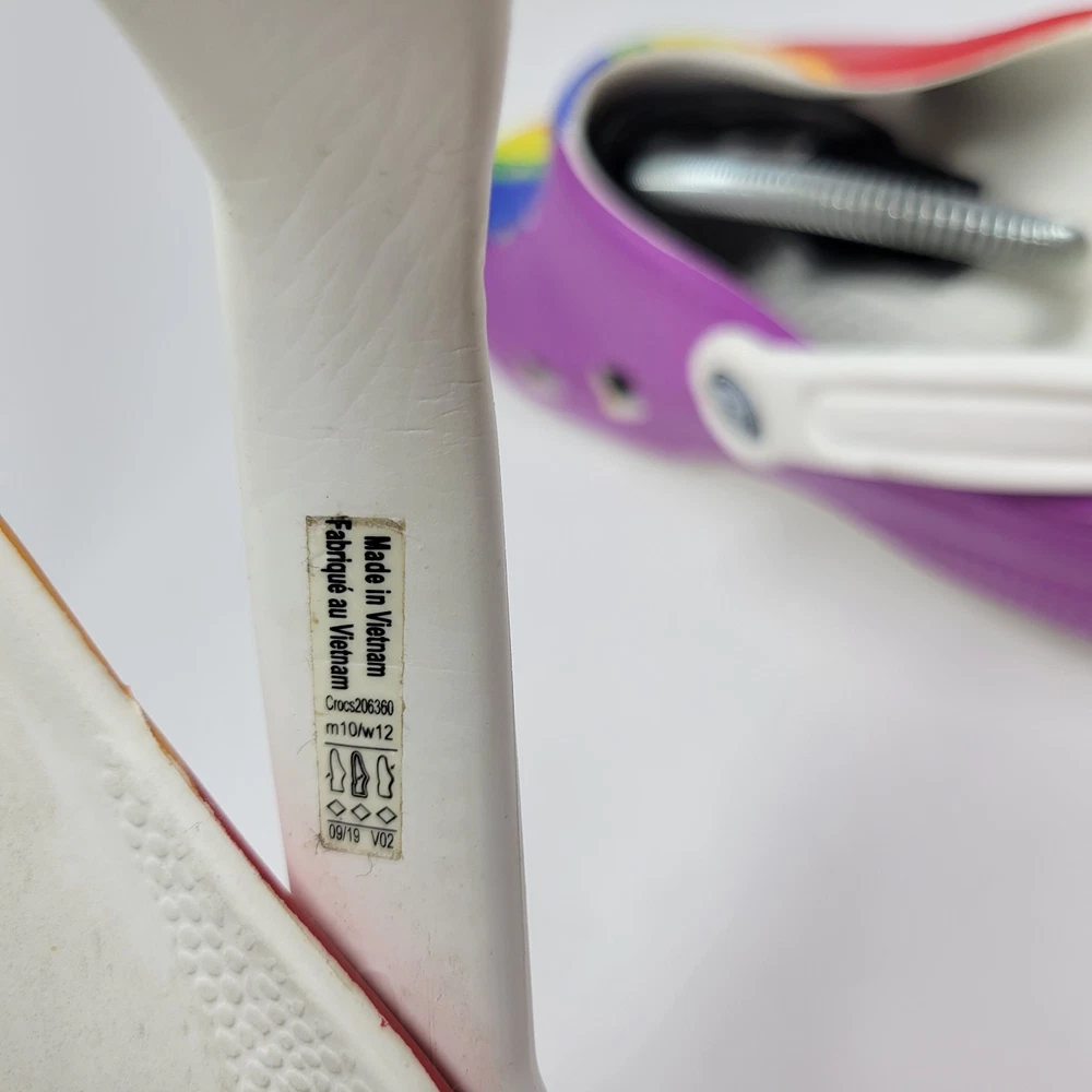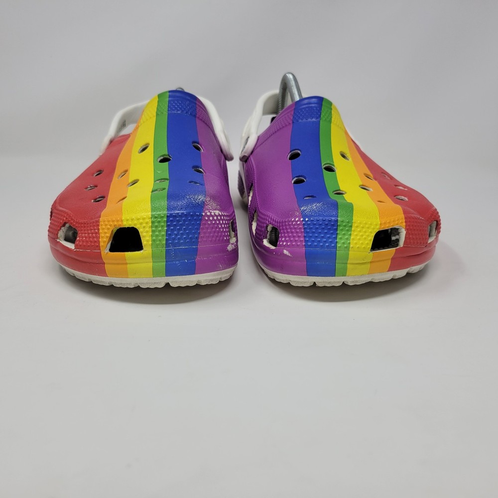 Crocs Men's Size 10 Women's Size 12 Rainbow Multi Pride Clogs Slip Ons Shoes are unisex round toe clogs with a multicolor rainbow pattern. They feature an ankle strap, logo accents, and are lightweight and breathable, making them suitable for travel, casual wear, work, and activewear. These synthetic clogs have a standard shoe width and a synthetic lining, with a synthetic upper and insole material. Perfect for those who appreciate art, hippie, bohemian, and outdoor themes. These shoes are in excellent “pre owned” condition. For more information, please see photos or feel free to contact me with any questions. All orders are shipped within 24 hours of payment received.