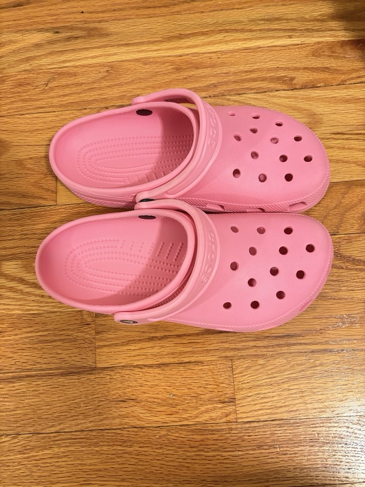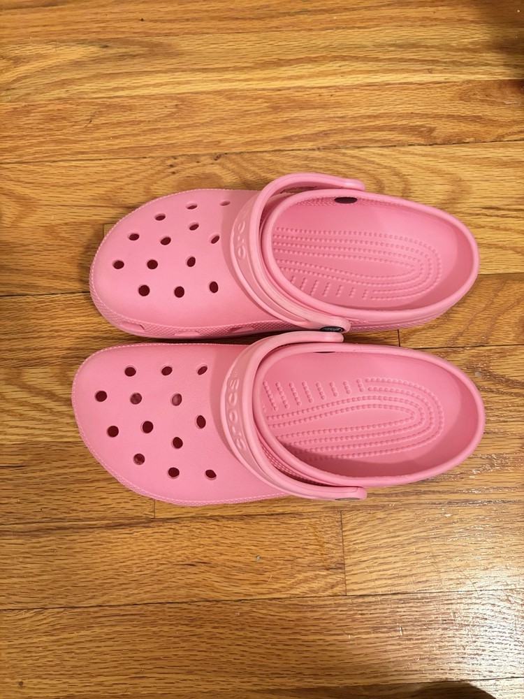 Crocs Women's 9 Men's 7 are pink clog-style shoes with a round toe shape and slip-on closure. They have a flat heel under 1 inch and feature the Crocs logo accent. These comfortable shoes are suitable for travel and casual occasions in summer and spring. The outsole and upper material are rubber, with a standard shoe width. Ideal for walking, they are part of the Comfort Slide product line.