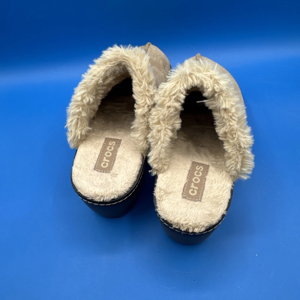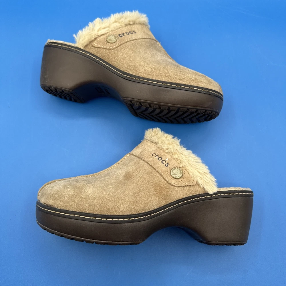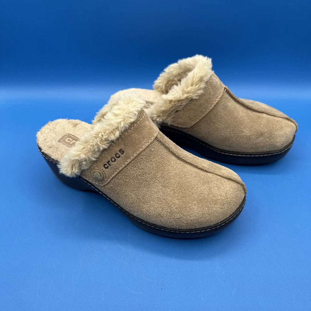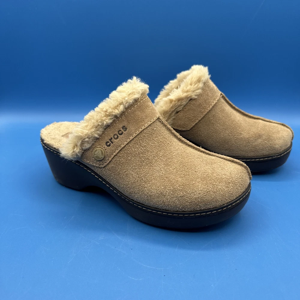 These Crocs Women's mule clogs are designed in brown suede with a faux fur lining for added comfort. They are slip-on style shoes with a faux suede outsole, perfect for casual wear. The size is women's 7, making them suitable for everyday use. Pre owned. Hardly used. No original box. Excellent condition. Size 7W. Please check the pictures carefully as part of the description. Feel free to ask questions if you need more information before you buy it. Thank you for your interest B-11