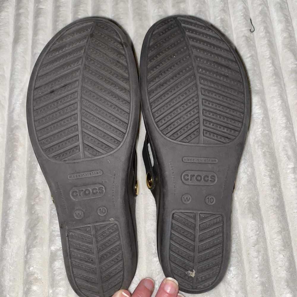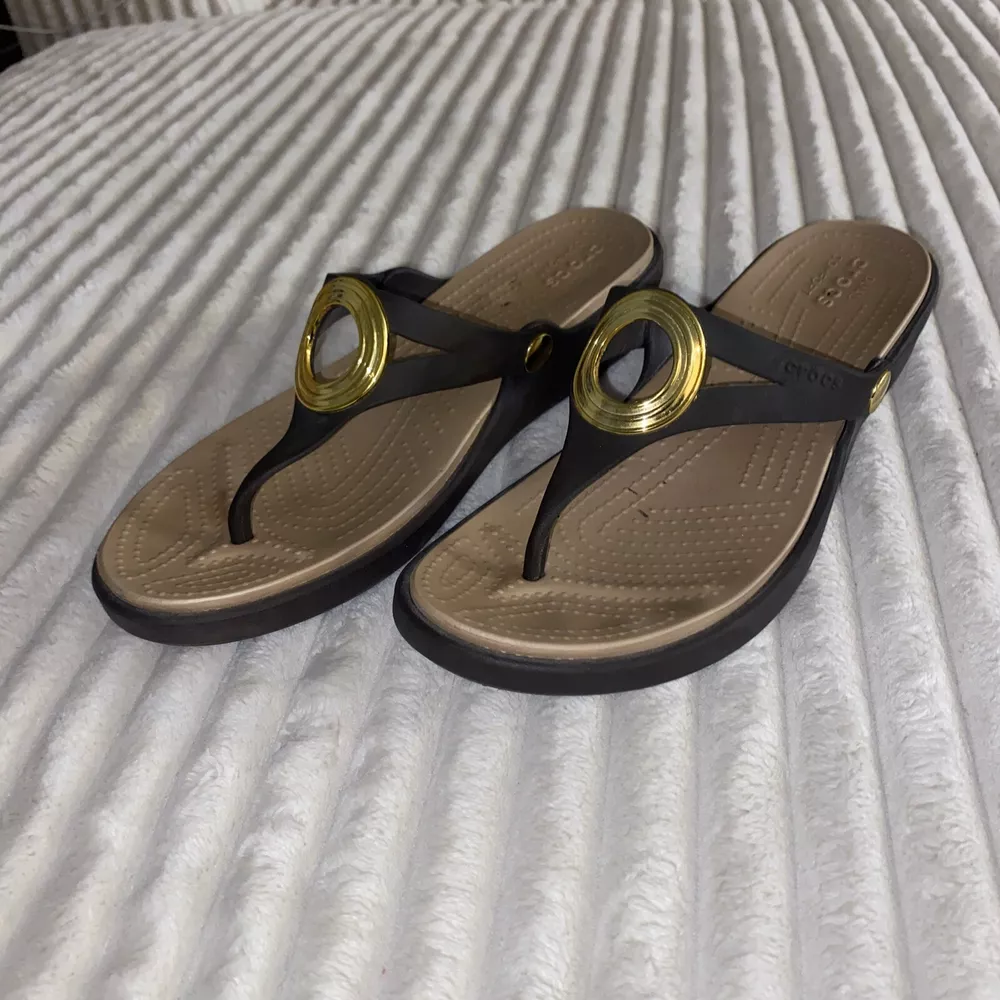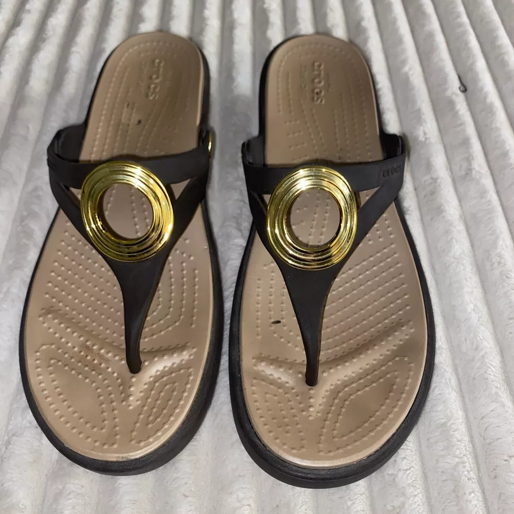Crocs Women's Sanrah Silver Circle Slip On Thong Sandals in Brown, Size 10, are comfortable flip flops featuring medallion and logo accents. Made with a synthetic upper and outsole, they have a flat heel style and cushioned insole for added comfort. Ideal for travel or casual wear in any season, these gold sandals have a breathable lining and are perfect for outdoor activities. Brown with gold