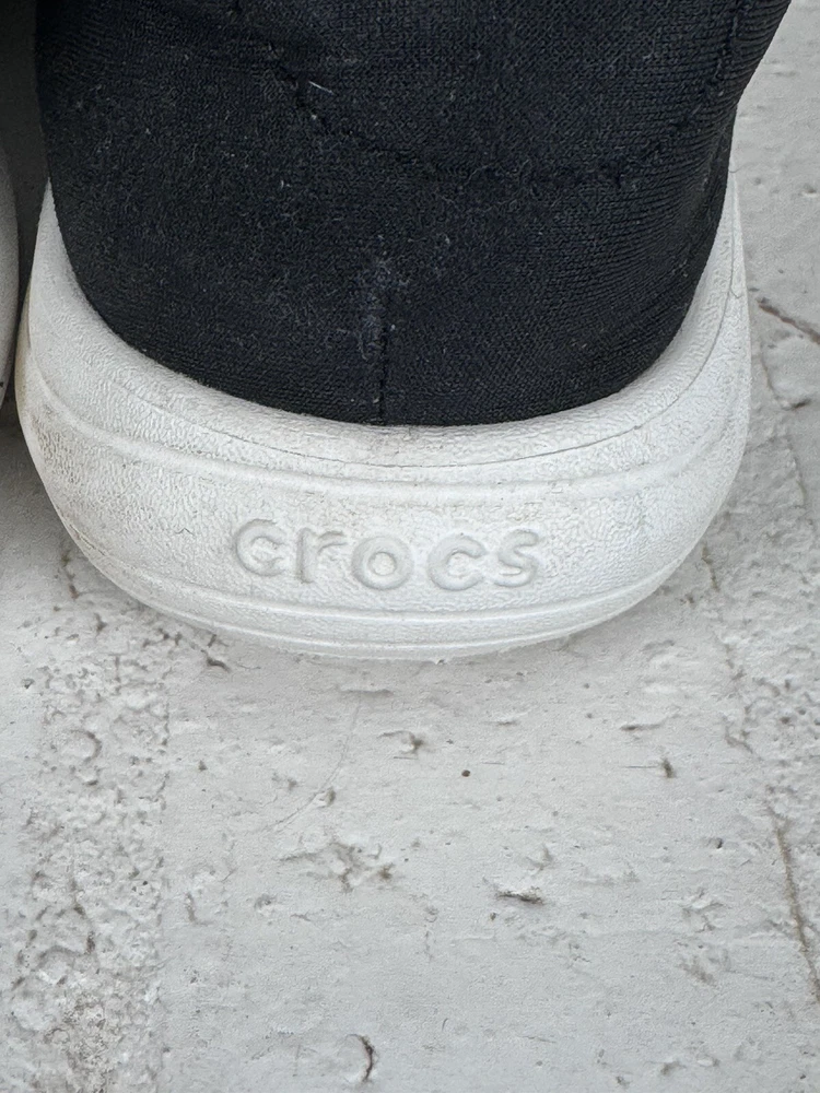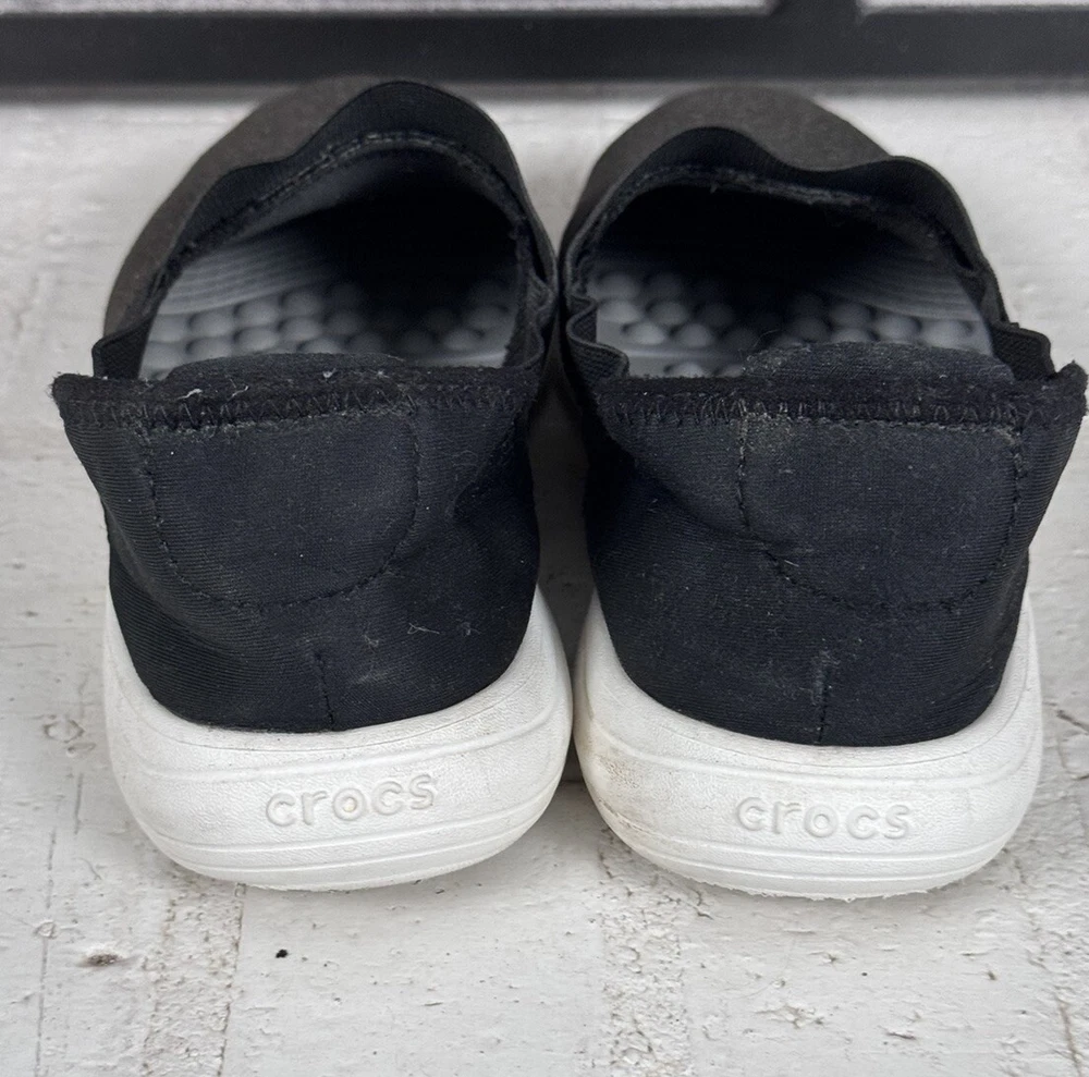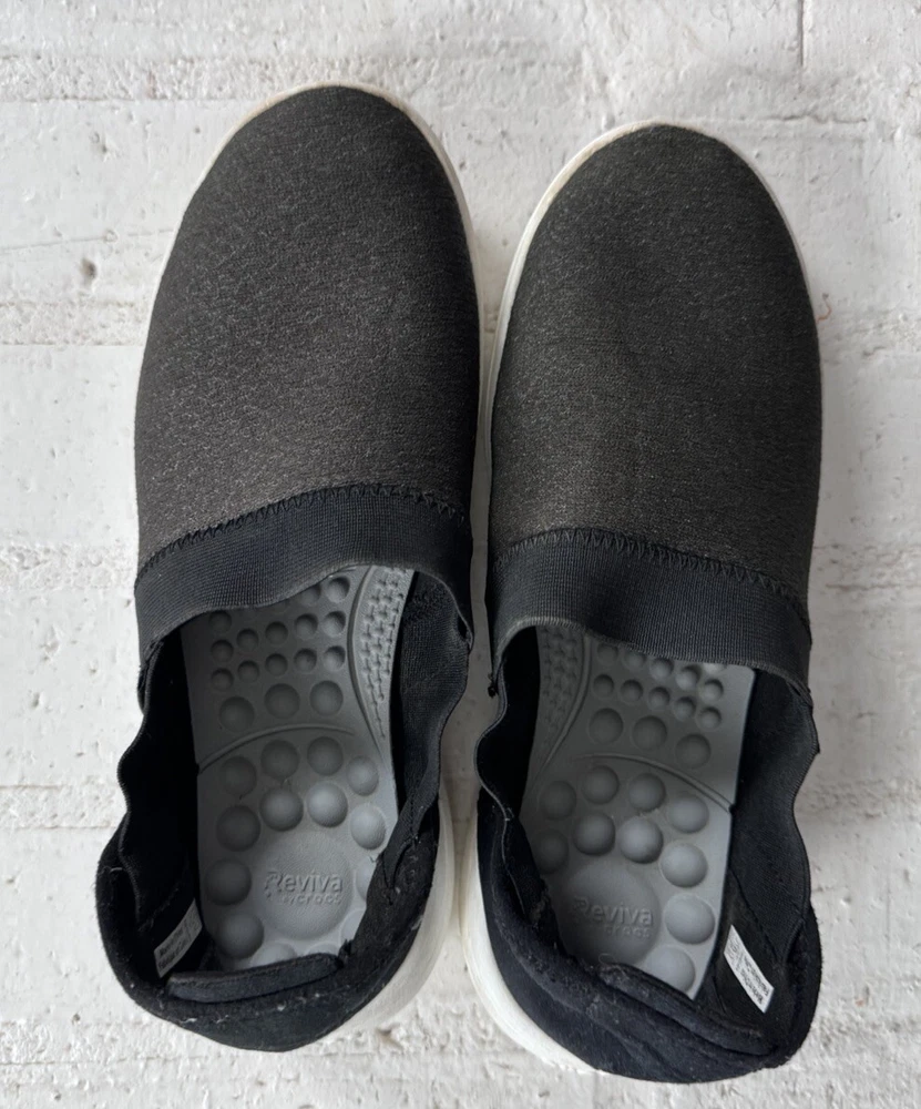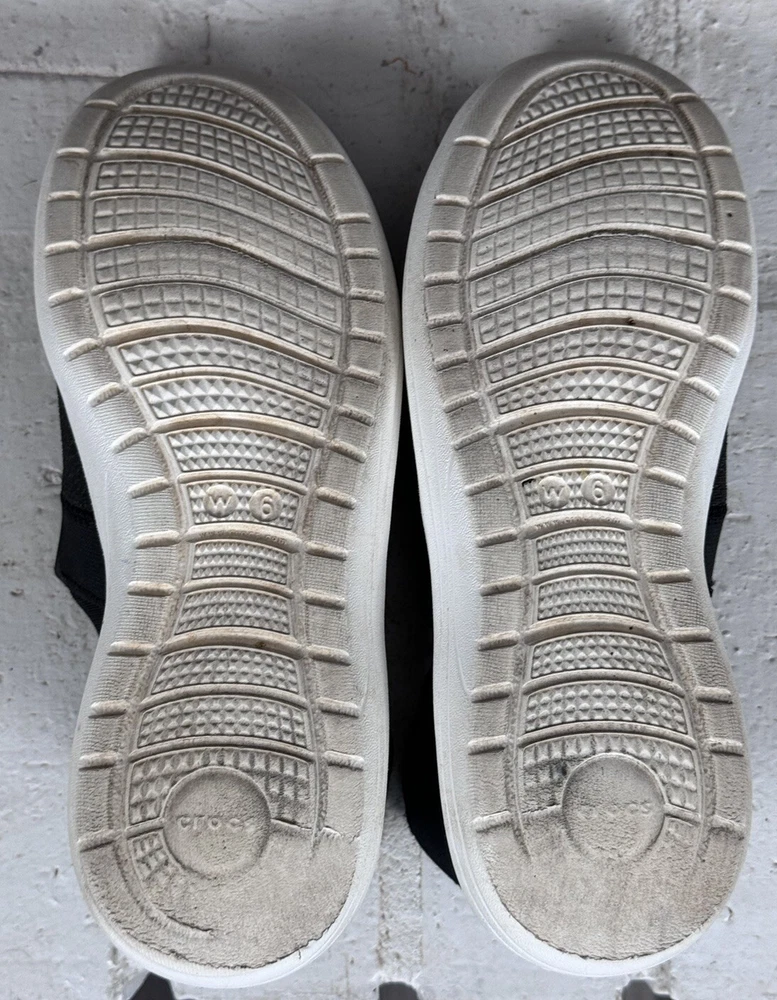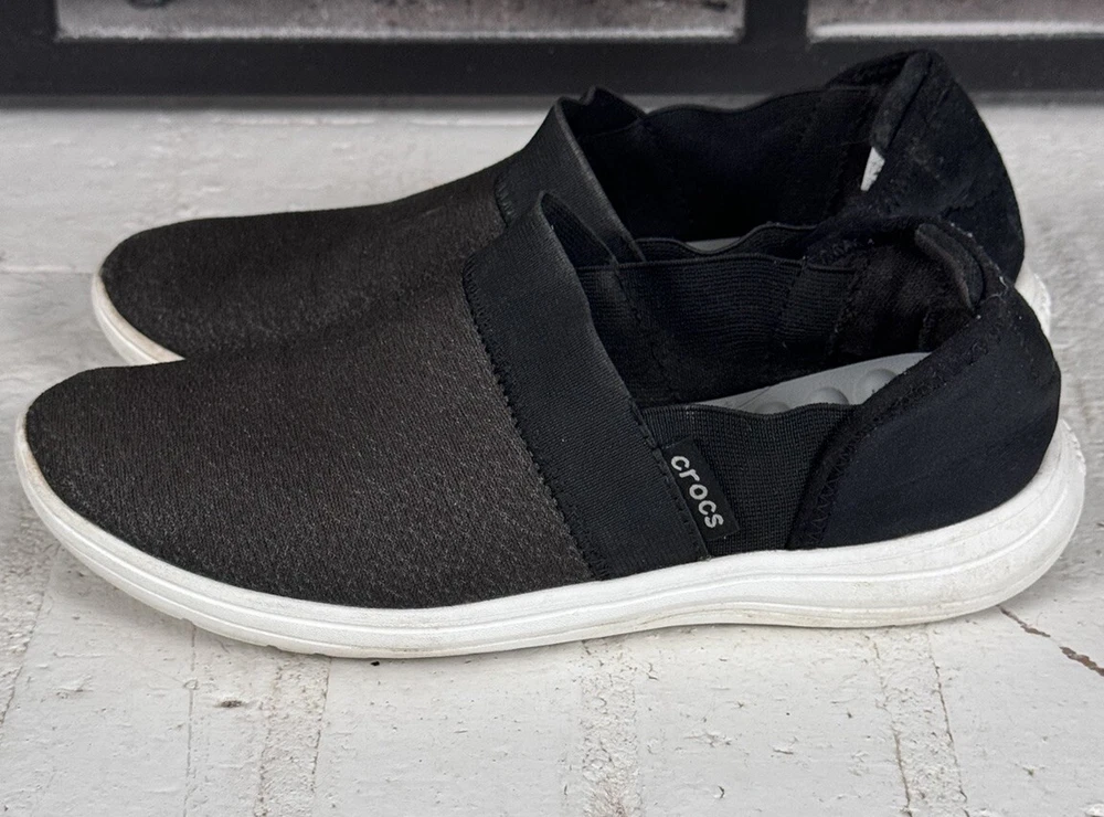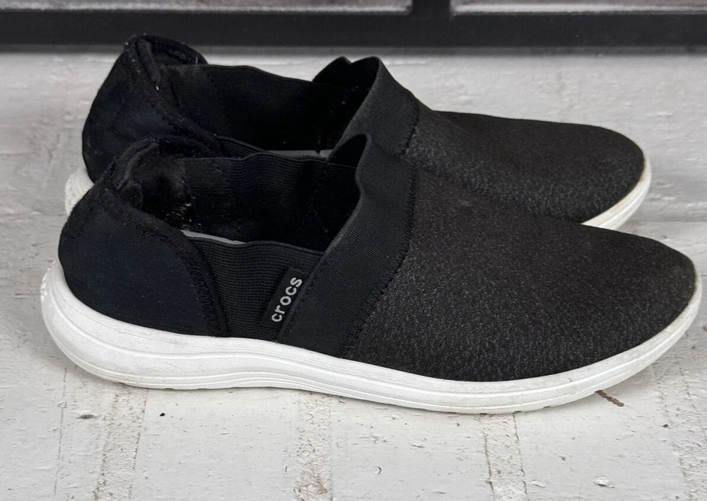 Please see pictures for details and wear. There is some wear in the heels but has plenty of life left in the shoe. Step into comfort and style with these Crocs Reviva slip-on sneakers. The lightweight and breathable stretch canvas fabric provides a comfortable fit, while the cushioned insole ensures all-day comfort. These loafers feature a round toe shape and flat heel style, making them perfect for casual and workwear occasions. The solid black color with logo accents adds a touch of elegance, making them versatile for any outfit. The slip-on closure and low-top shoe shaft style make them easy to put on and take off. Ideal for summer, fall, and spring, these shoes are perfect for gym and training, walking, beach, cycling, school, cross-training, driving, cross-fit, and cheerleading. They are available in US shoe size 6, UK shoe size 3.5, and EU shoe size 36.5. Get ready to step up your shoe game with these comfortable and stylish sneakers. WS0001