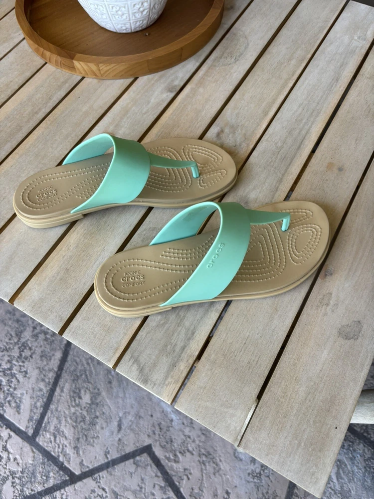 LIKE NEW/ NEVER WORN Step into comfort with the Crocs Women’s Tulum Thong Flip Flops. These sandals feature a solid teal blue and beige color scheme, with a jade stone hue that adds a touch of sophistication to your casual look. The slip-on style ensures easy wearability, perfect for those on-the-go moments or relaxed sunny days. Crafted with a durable rubber upper and designed for all-day comfort, these flip flops boast a flat heel style that's less than an inch high, making them ideal for everyday wear. The standard shoe width accommodates most foot sizes, ensuring a snug and comfortable fit for a size 6. Whether you're heading to school or enjoying a leisurely stroll, these Crocs sandals are a versatile addition to any wardrobe.