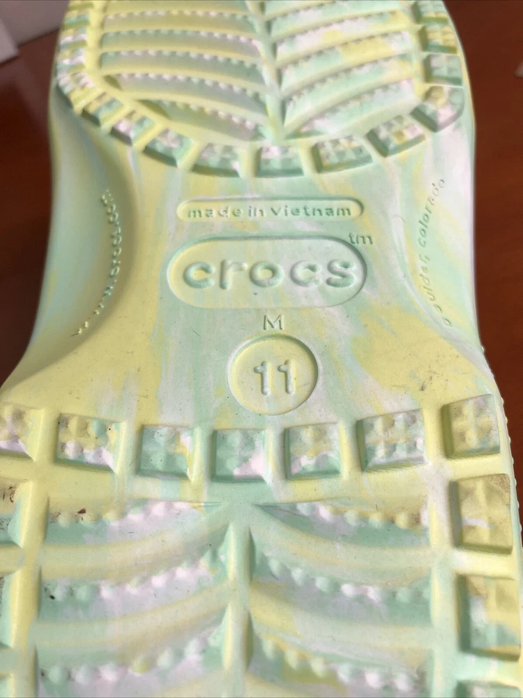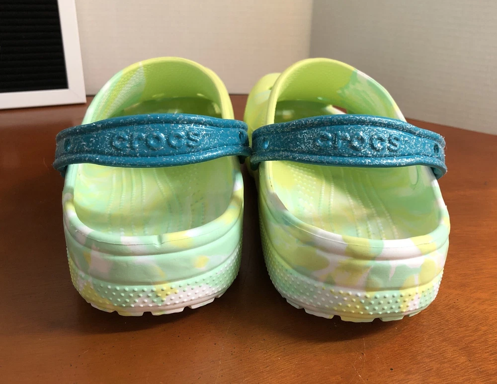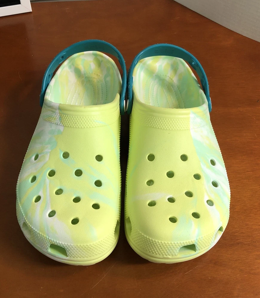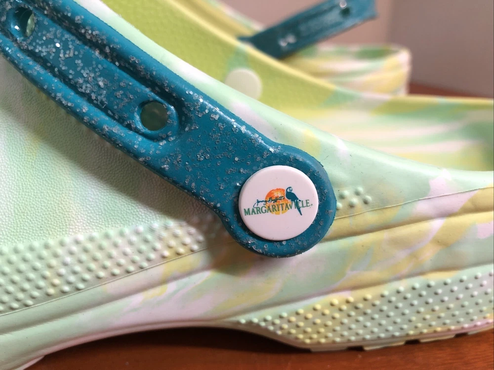 Elevate your style with these limited edition Crocs X Margaritaville Jimmy Buffet classic clogs. The tie-dye pattern in green adds a touch of vibrancy to your outfit. These crocs feature a rubber upper and insole material, making them durable and comfortable to wear. The Crocs X Margaritaville Jimmy Buffet classic clogs are a must-have for any fan of the iconic musician and a great addition to any shoe collection. Like new condition with minimal signs of wear. A few original charms are missing. Please see all photos All proceeds benefit hospice patients.