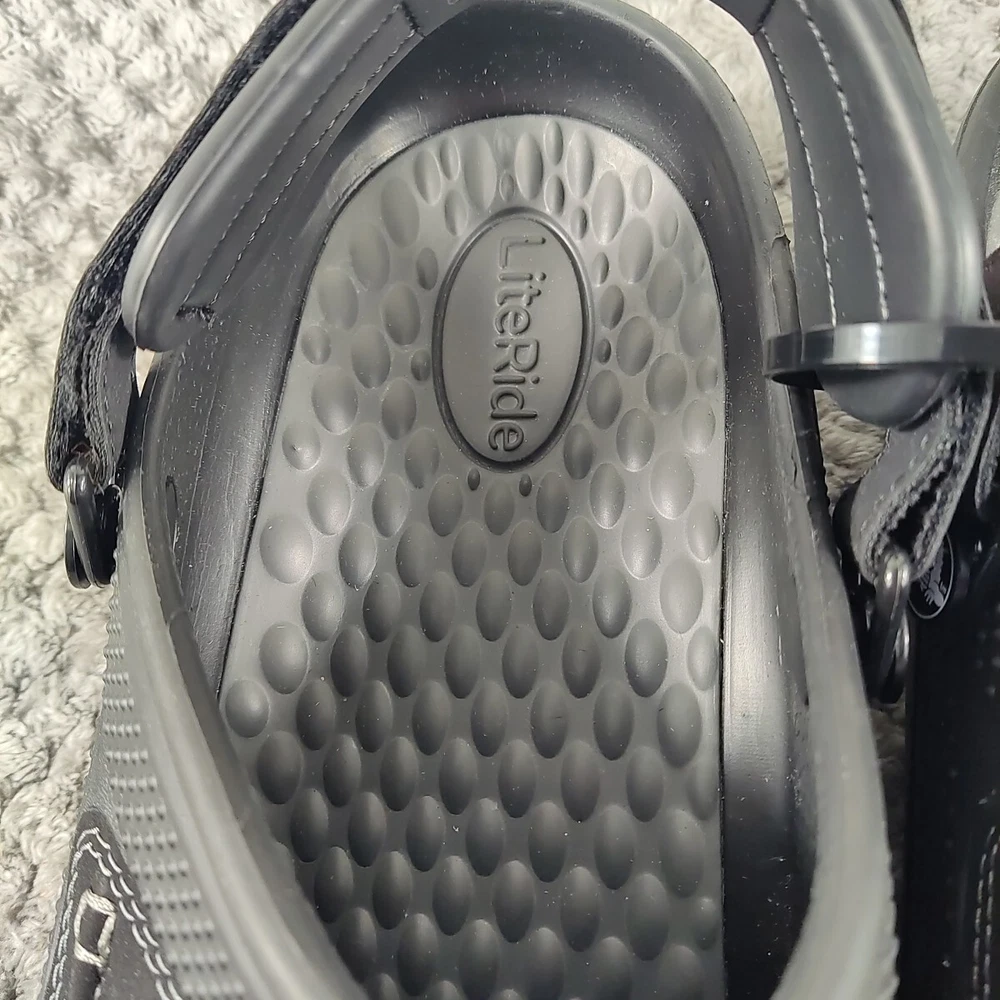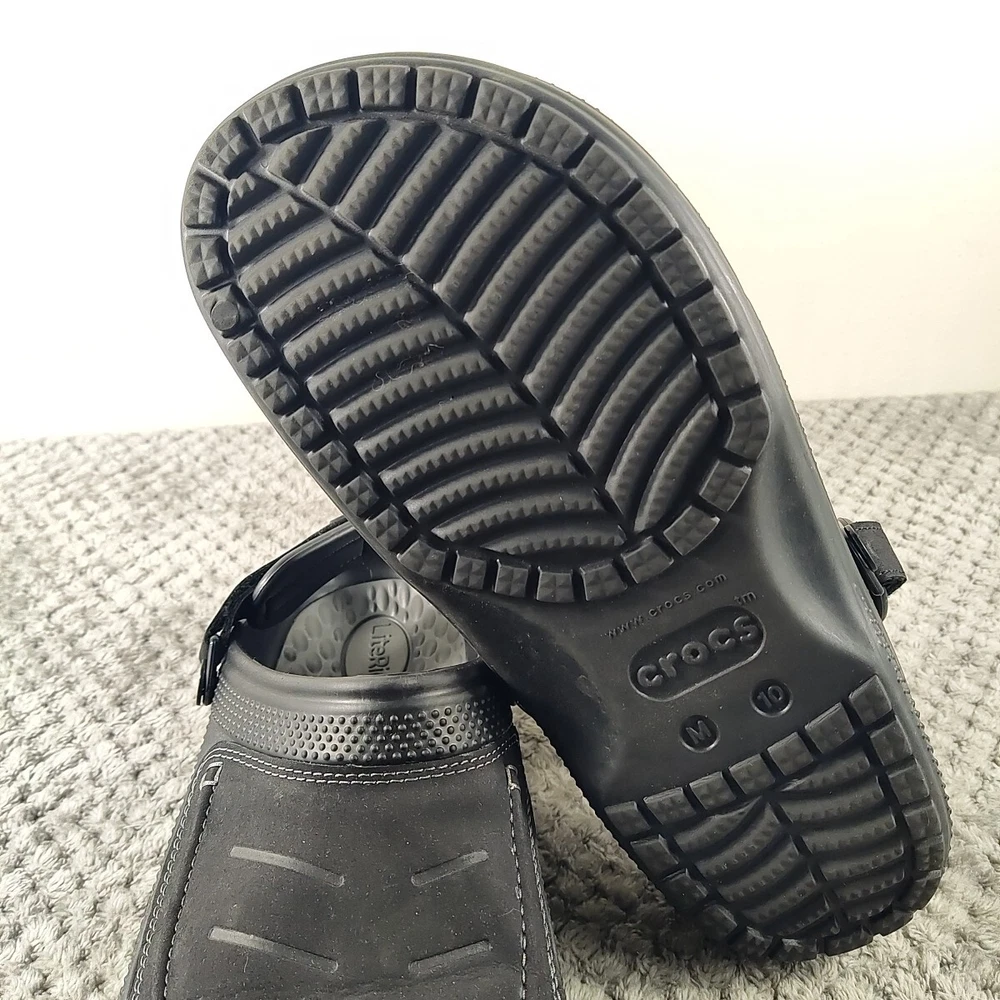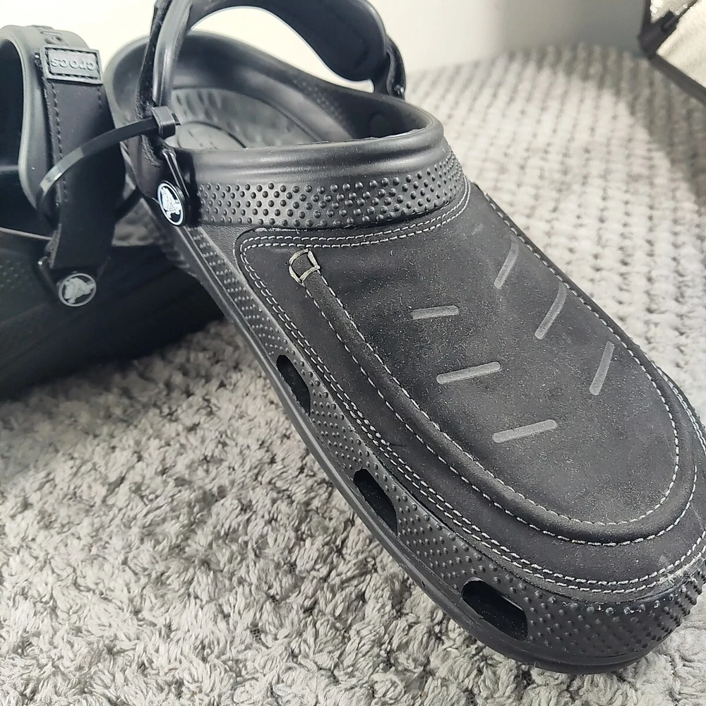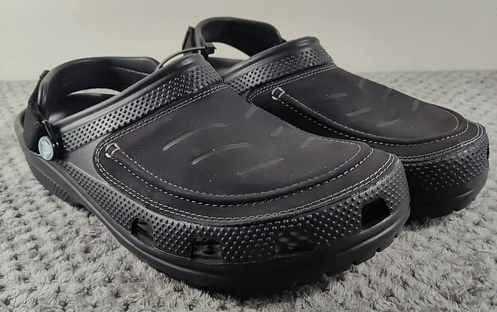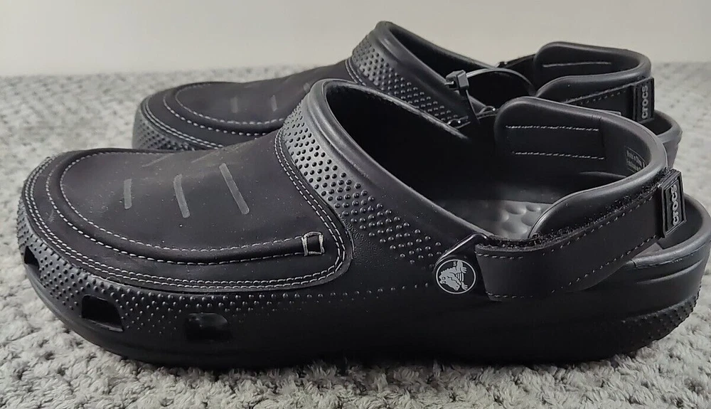 Crocs Yukon Vista II LiteRide Clogs for Men - Black/Slate Grey - 10M The Crocs™ Yukon Vista II LiteRide® Clogs for Men are the next evolution of comfortable clogs. These clogs feature leather instep plugs for a different Crocs look and feel. The super-cushioned LiteRide footbeds boosts comfort. Adjustable back straps allow you to find that perfect fit. These Crocs feature the signature Croslite™ shell material that keeps your travels comfortable. Imported. Manufacturer style #: 207689. Leather instep plug Super-cushioned LiteRide footbeds Adjustable back strap Full Croslite shell