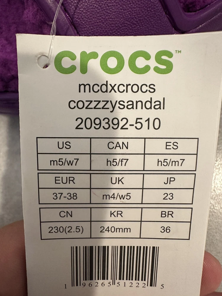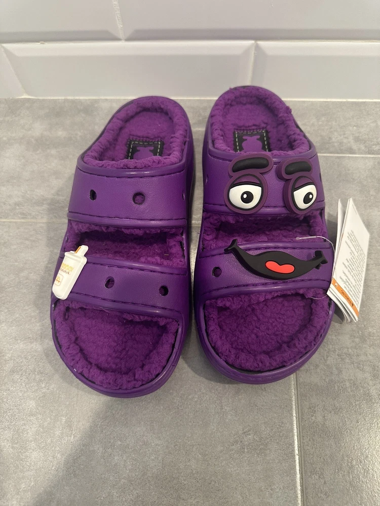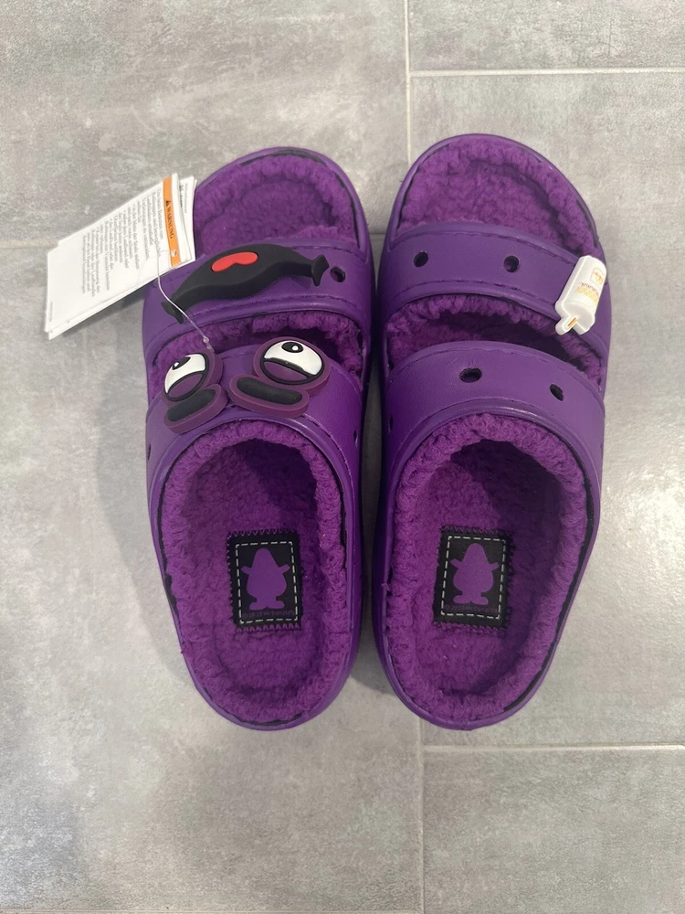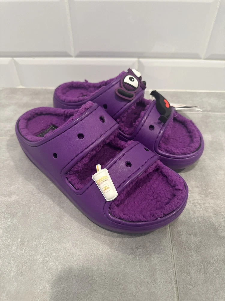 Introducing the limited edition Crocs x McDonald's Classic Cozzzy Sandal in the color Grimace Purple. This unisex slip-on sandal features a faux fur lining and insole material for added comfort. The outsole is made of rubber for durability and traction, making it perfect for travel and casual occasions. The sandal is adorned with the iconic McDonald's Grimace character and logo accents, adding a touch of fun to the design. With a standard shoe width and US size 7, this sandal is perfect for men, while women's size 7 is equivalent to a US size 5. This product is part of the Mcdxcrocs product line and was manufactured in China. Get your hands on this unique and comfortable sandal today!