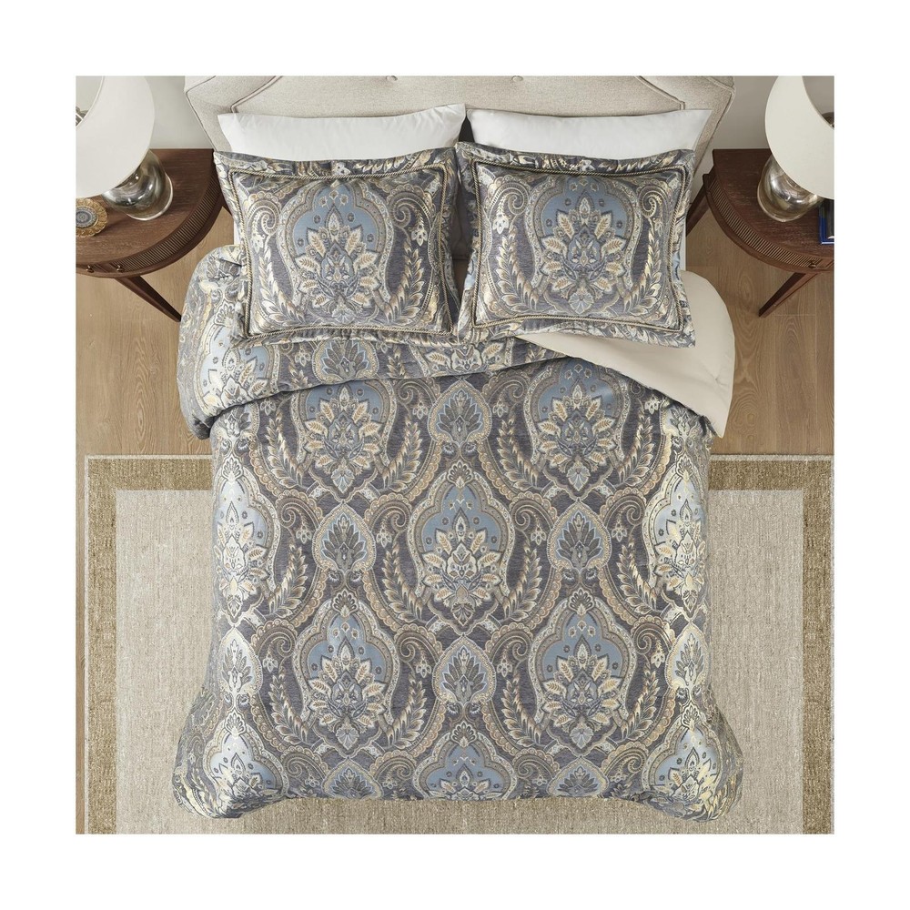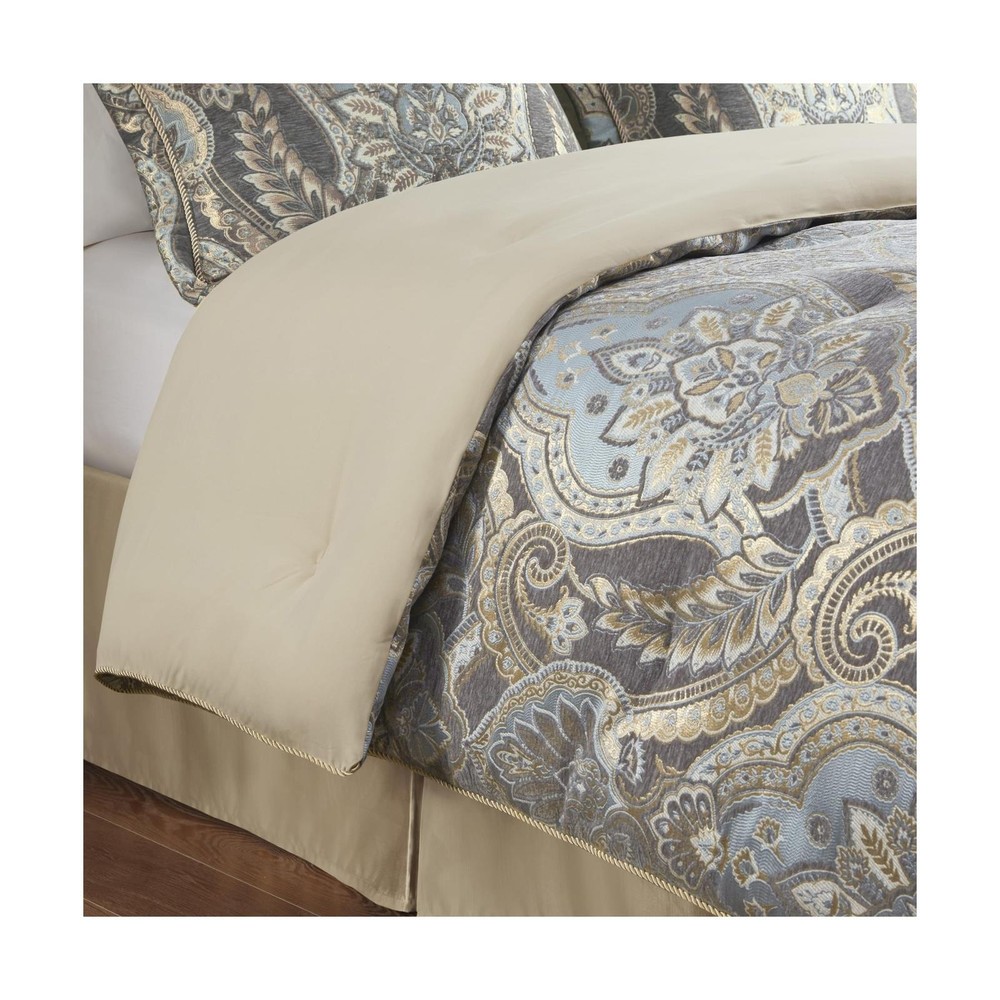 Croscill King Comforter Set, Luxe Chenille Jacquard Damask, Soft Microfiber Twill Comforter for a King-Size Bed, Oversized Comforter King Bedding, 2 Shams & Bedskirt, Julius, Blue/Grey 4 Piece Comforter and Sham Face: 100% Polyester Chenille Jacquard, Back: 100% Polyester Microfiber Twill Solid Dyed. Experience opulence with our Luxurious Bedding Set - a timeless blend of French 17th century inspired design. Immerse yourself in the lustrous comfort of a damask jacquard weave, evoking the classic opulent lifestyle with a touch of modern elegance Exquisite craftsmanship - Indulge in the luxurious and lavish comfort of a chenille jacquard weave paired with a soft microfiber twill reverse. Embrace cozy and intimate moments at home, surrounded by beauty and elegance crafted with meticulous attention High Quality - Discover perfection in our matching shams, featuring hidden zippers, a sophisticated flange with delicate rope trim. Elevate the design with a lustrous antique satin bedskirt; all with the assurance of high-quality Oeko-Tex certification Comforter set includes oversized: 1 Comforter: 110"W x 96"L, 2 King Shams: 20"W x 36"L + 2"D , 1 Bedskirt: 78"W x 80"L +15"D Care for your luxurious bedding with sophistication: Opt for dry cleaning for the comforter and shams, while the bedskirt revels in the ease of machine washing. (See sewn-in label for care instructions) Size King Included Components 1 Comforter, 2 King Shams, 1 Bedskirt Color Blue/Grey Style Traditional